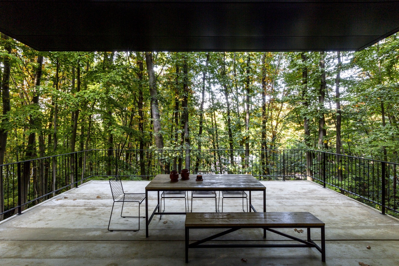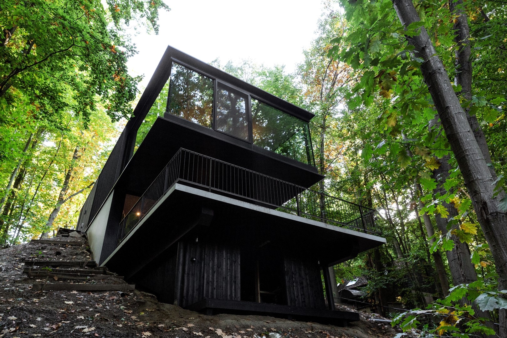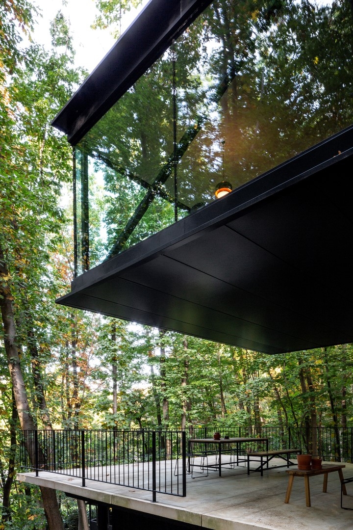 The semi-underground lower level was built with precast exposed concrete walls and opens onto a terrace creating indoor/outdoor space with a beautiful view. The top floor was constructed with an industrial steel truss structure insulated with sandwich panels, cantilevering 5 meters above the terrace. Two-thirds of the facade features floor-to-ceiling windows giving a floating sensation among the trees.