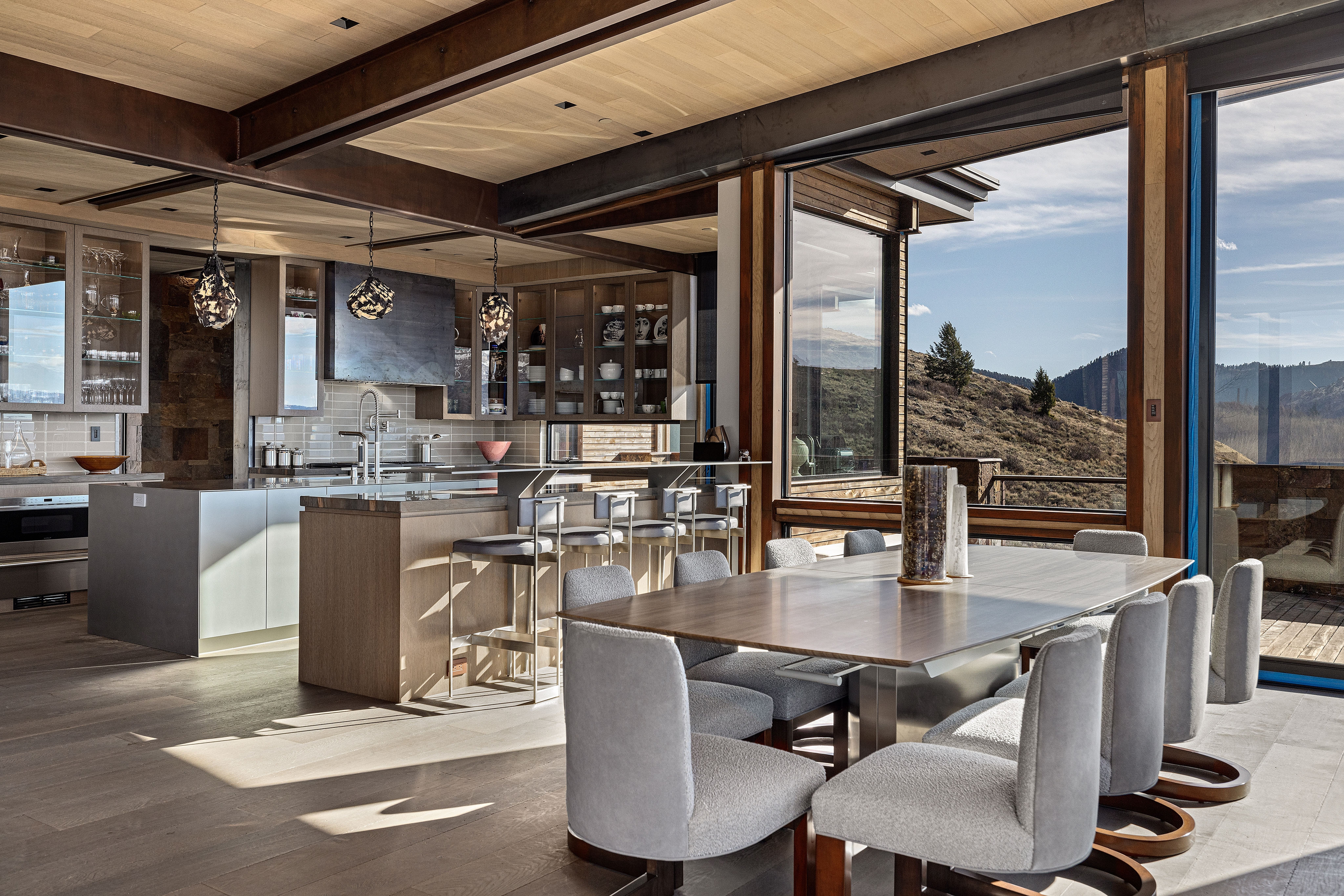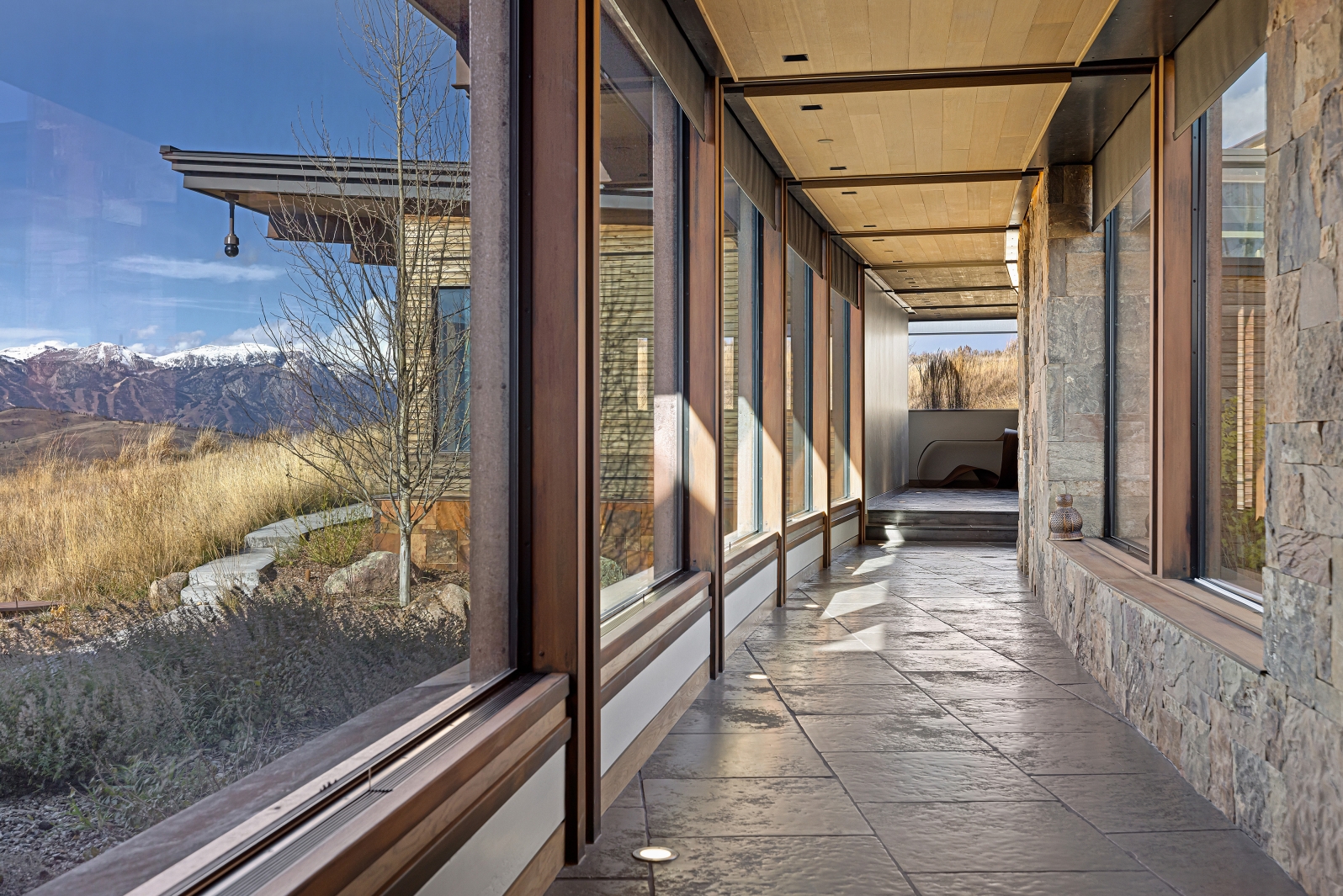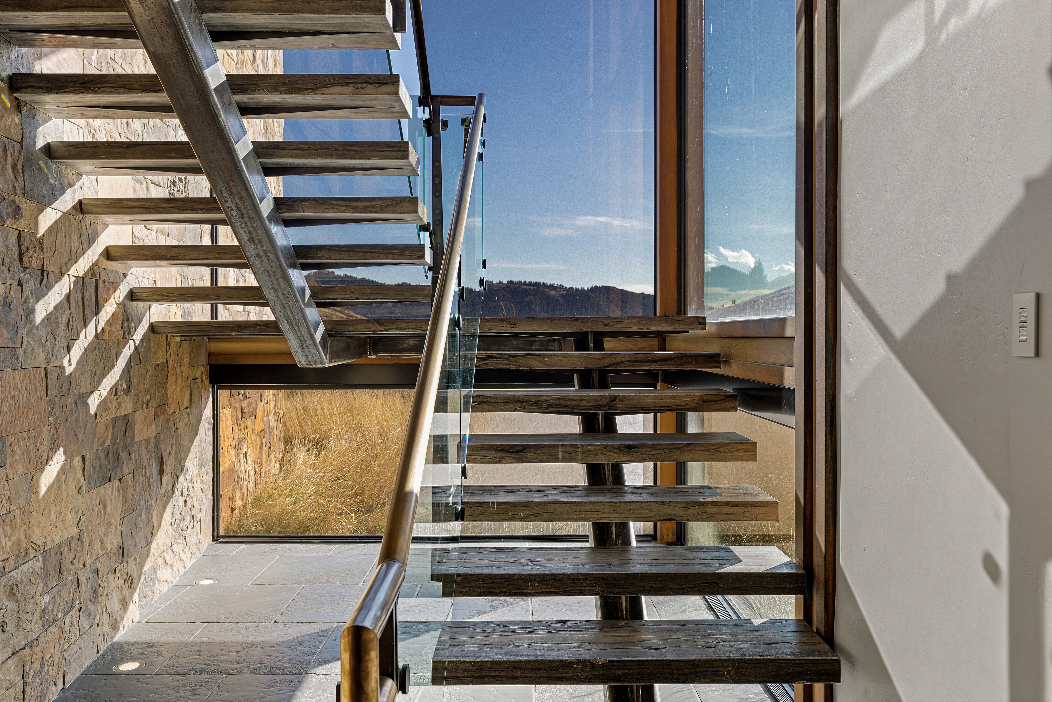 Mass and void are a consistent theme with stone walls complemented by large sections of glass that capture panoramic views and enhance the passive solar performance of the house. Natural light permeates the house to warm concrete topping slabs below finished floors, storing energy during the high mountain winters.