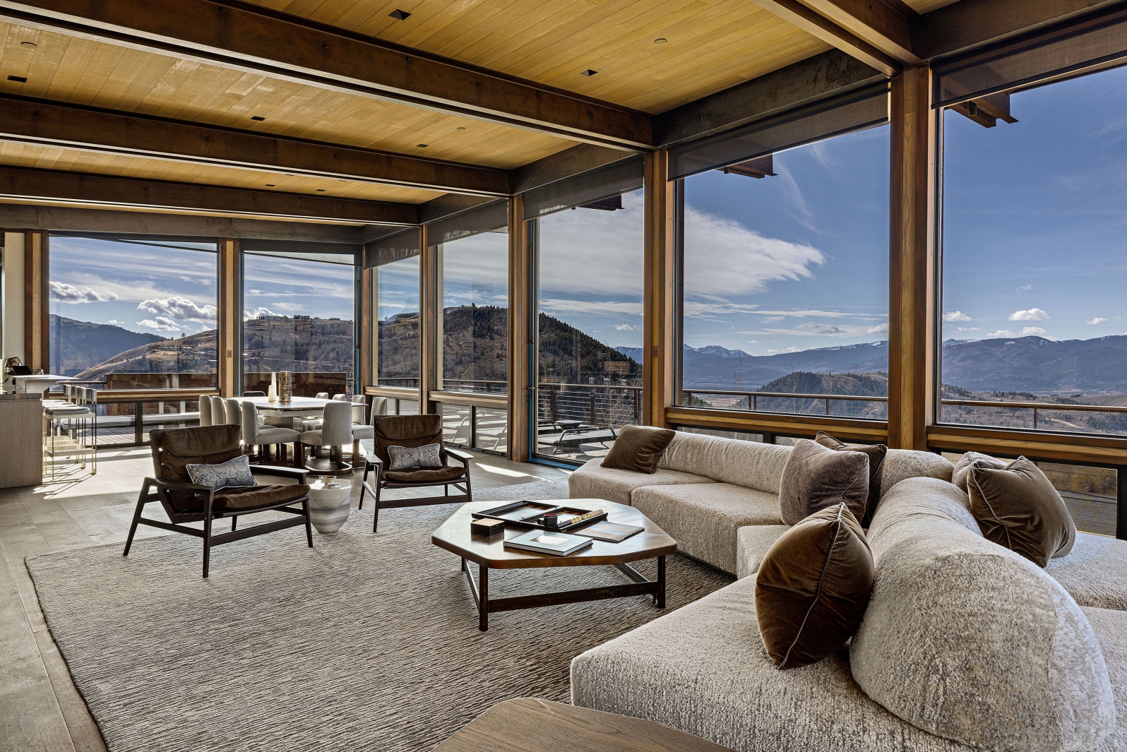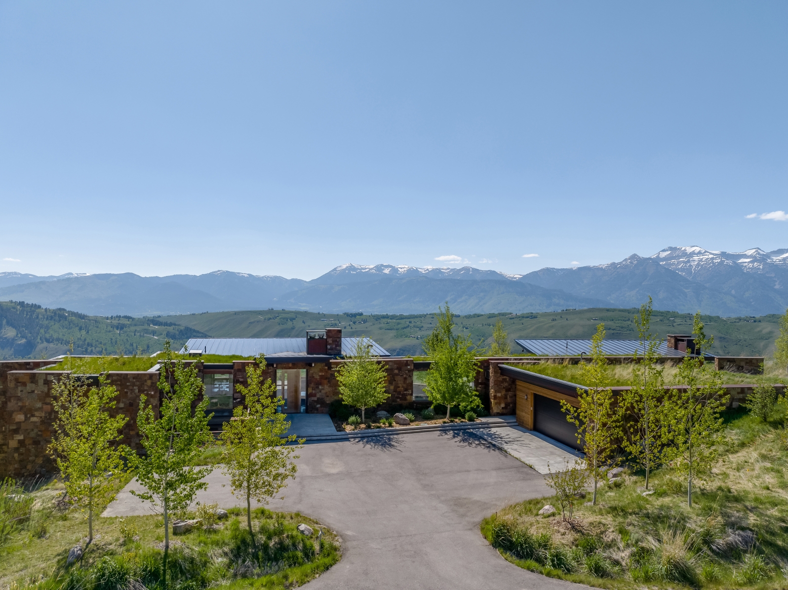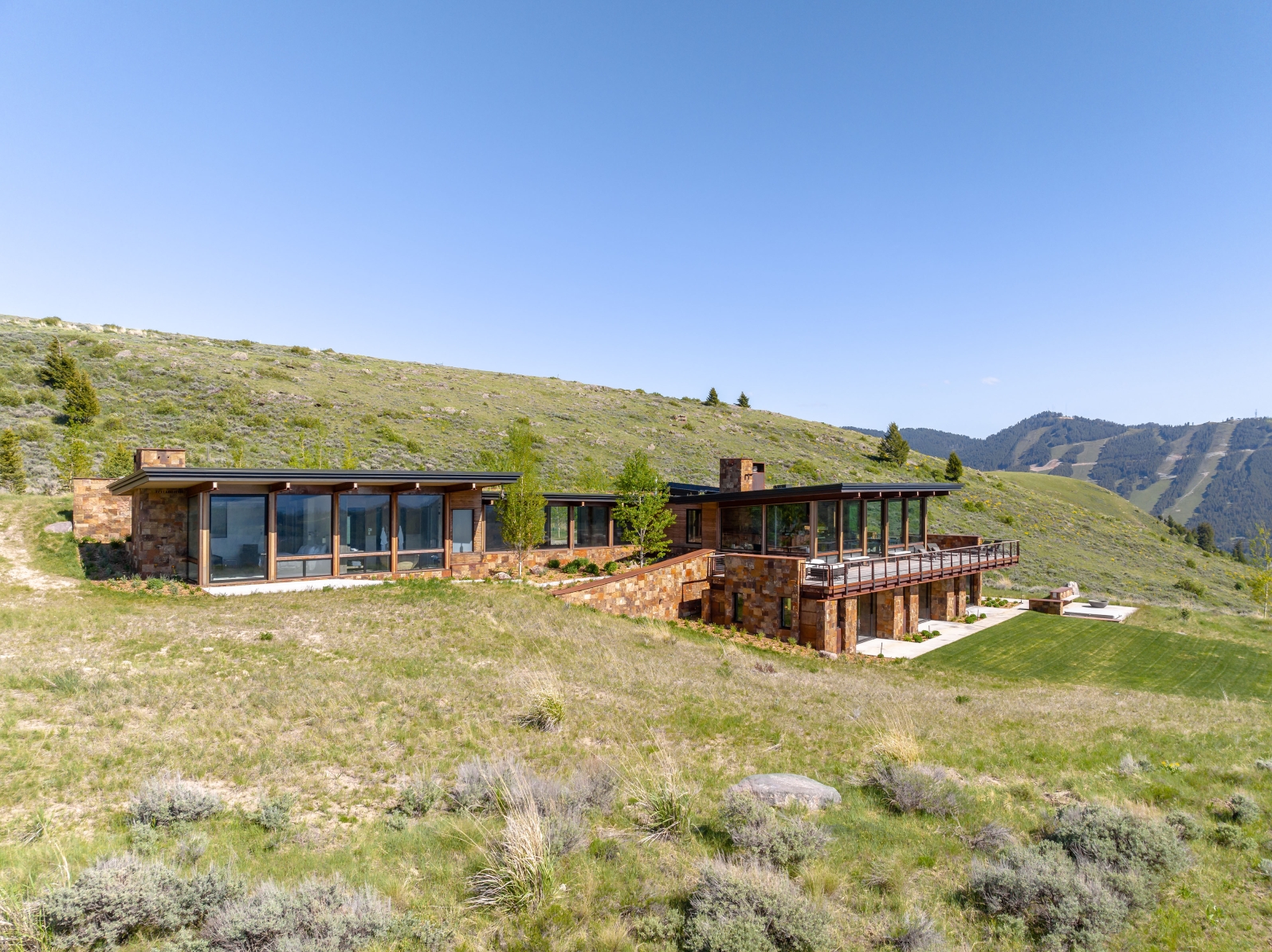 Mass and void are a consistent theme with stone walls complemented by large sections of glass that capture panoramic views and enhance the passive solar performance of the house. Natural light permeates the house to warm concrete topping slabs below finished floors, storing energy during the high mountain winters.