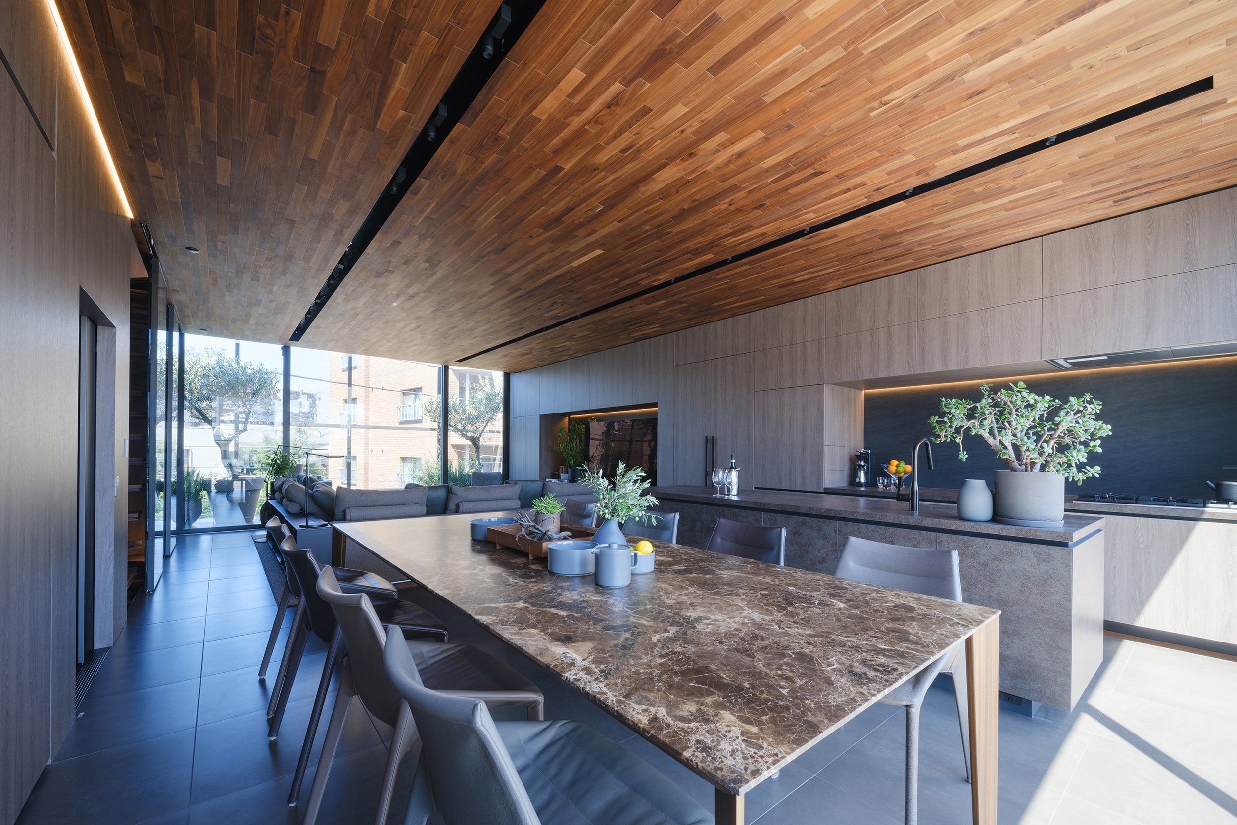 A massive concrete and glass exterior defines this house in a downtown residential neighborhood. The client, who runs a company that uses flowers and greenery to design lifestyles, wanted to incorporate that concept into a residence that rethinks the home as both private and open to the public sphere.