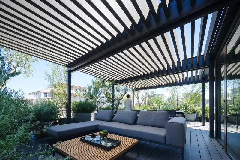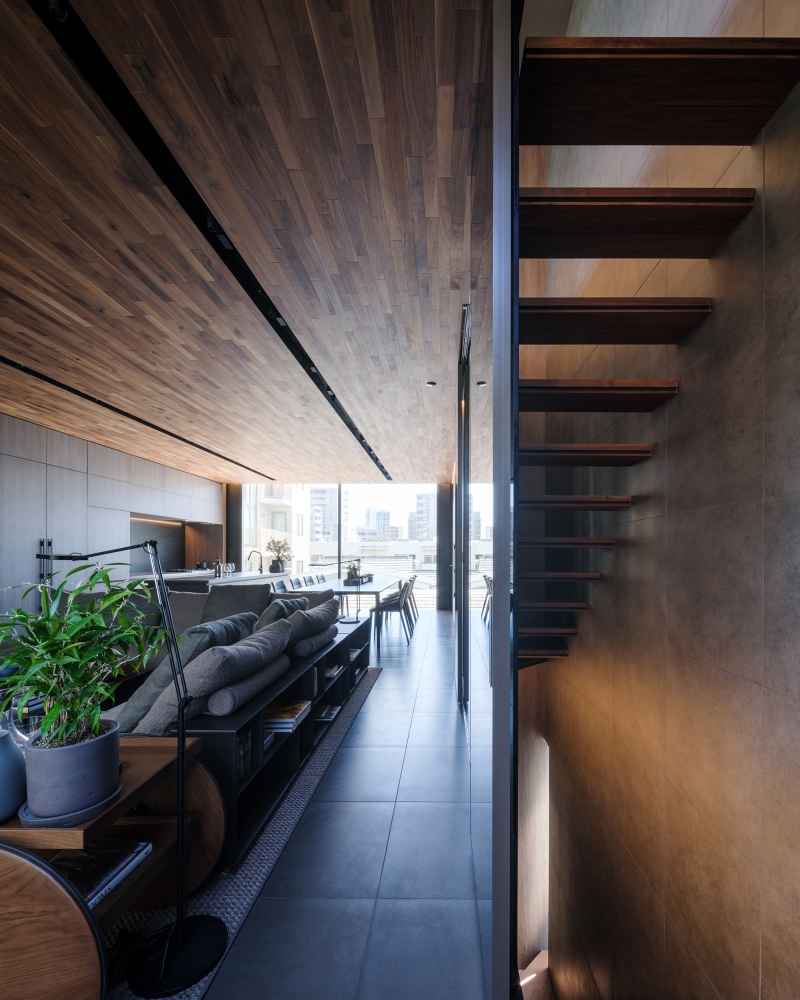 The entrance, located next to a two-car piloti garage, leads to a weight-training gym. On the second floor, in addition to private spaces such as the bathroom, children’s room, and master bedroom, a library utilizes open space around the stairs as an area for family interaction. A family room occupies the third floor, with a deep covered balcony overlooking the street. One-way glass preserves privacy within this comfortable intermediary space filled with outdoor furniture and potted olive trees.