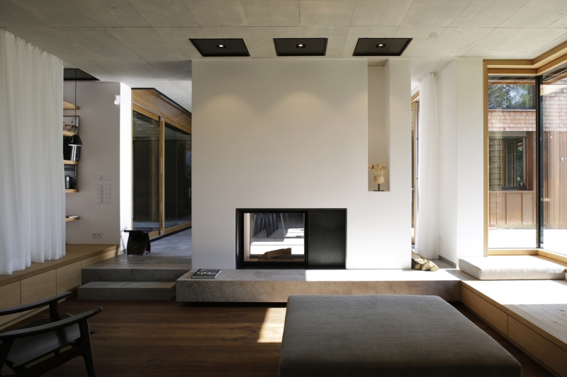The l-shaped structure takes the different sunlight orientation into account. The ground floor gives inside outside space for food Preparation, Cooking, Dining and Living. A both sided Chimney defines the open kitchen-dining area and is the center of the wooden floored sunken Living room. The upper Floor is hosting the individual rooms with a separated generous parent area .