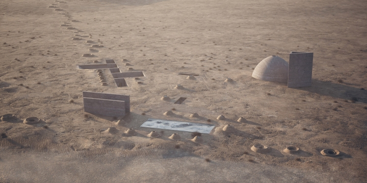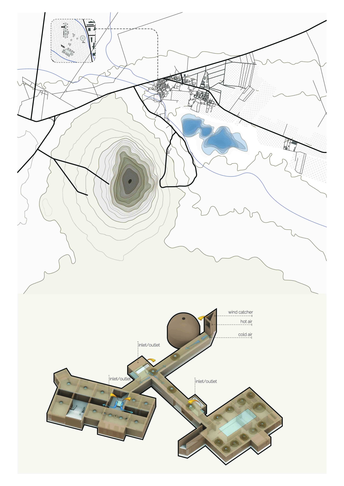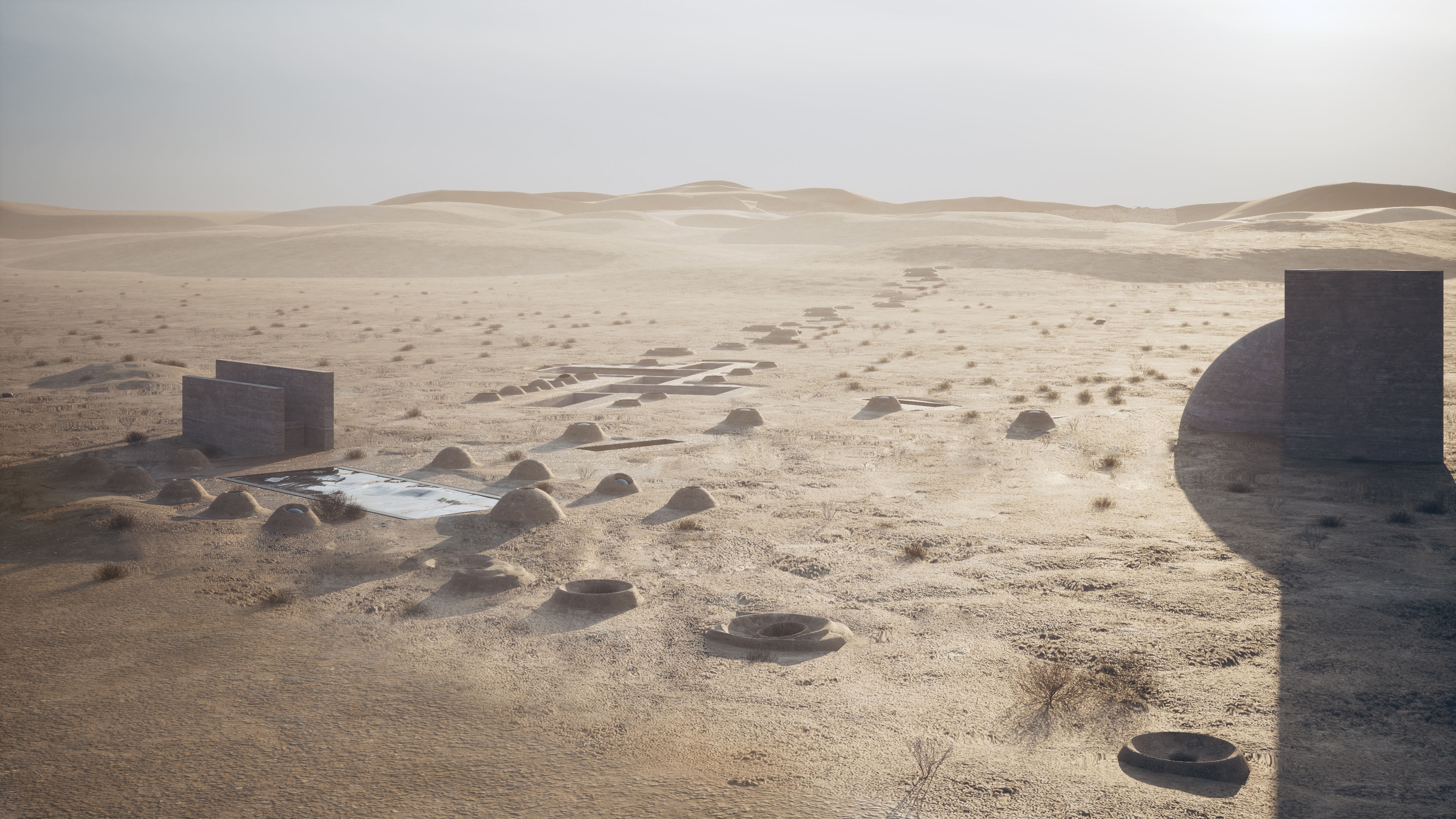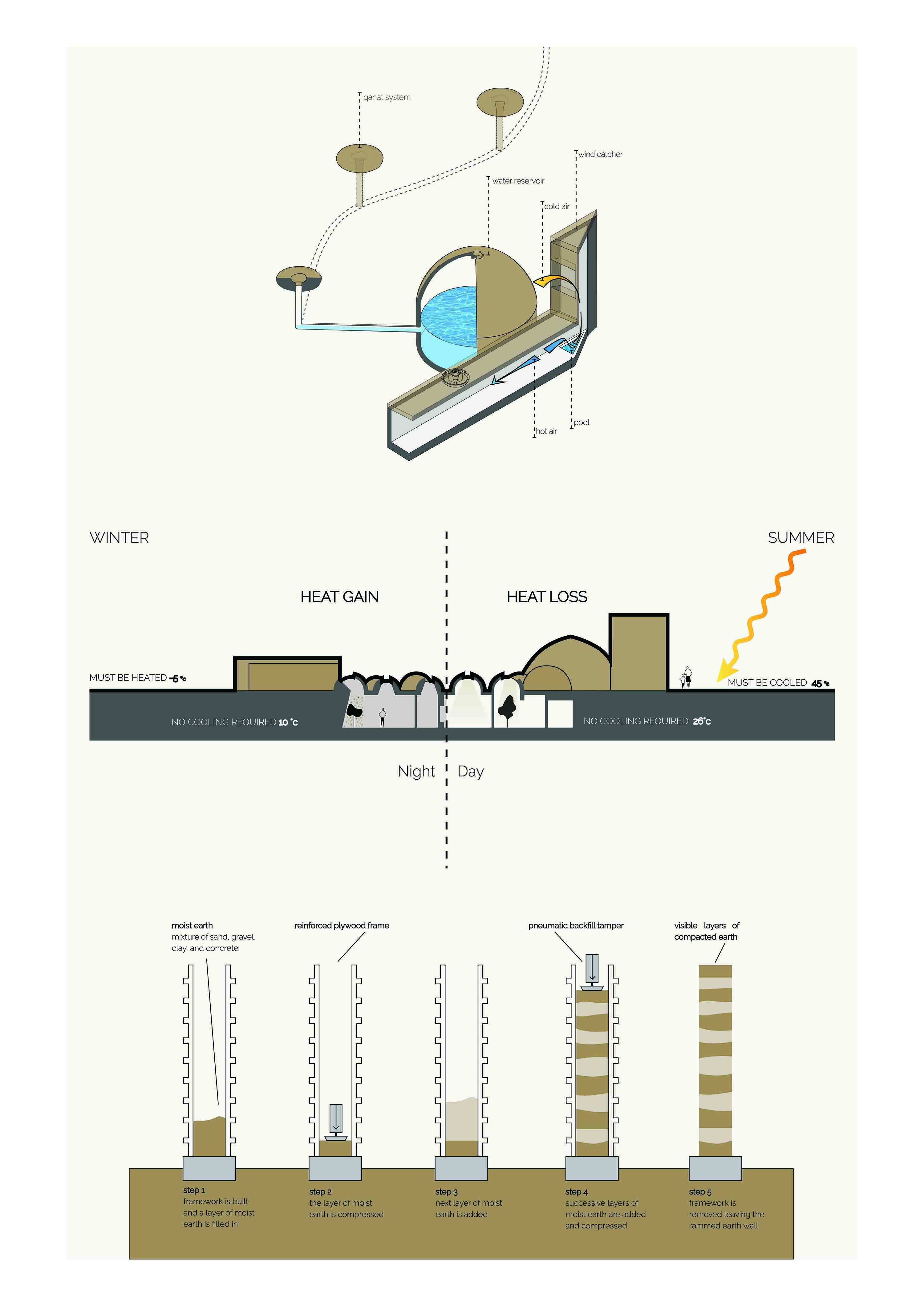 Qanats, landscape, earth, ancient building techniques, and historic references gradually formed our ideas. The home takes its orientation from its adjacent ancient castle and is sunken underground with the rest of the composition to minimize the thermal exchange between outside and inside.