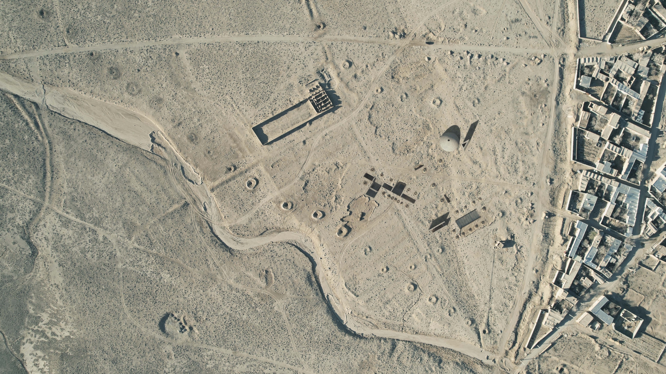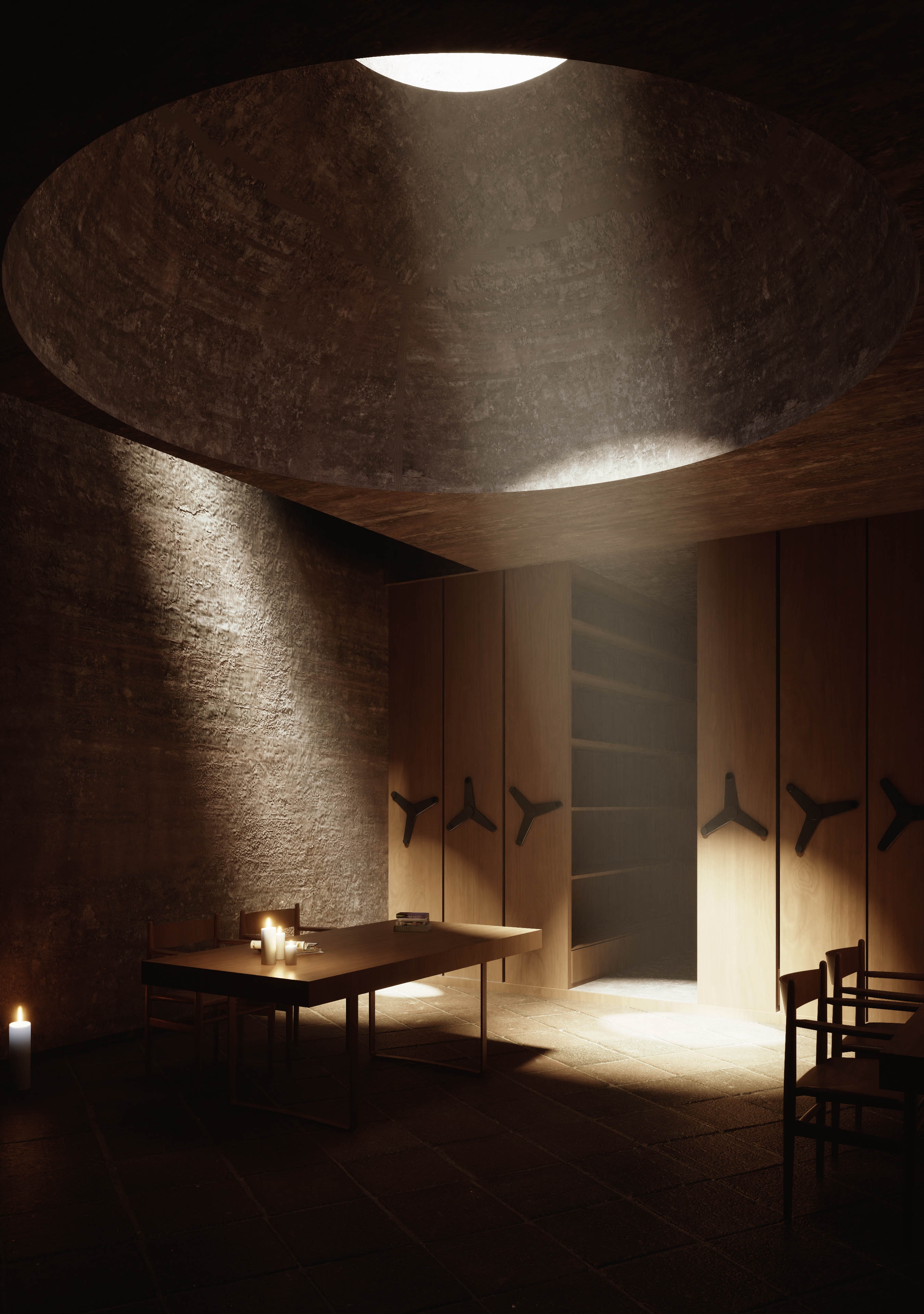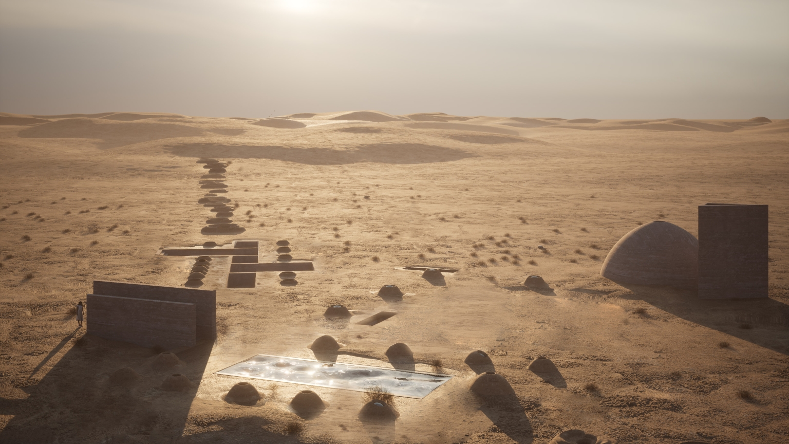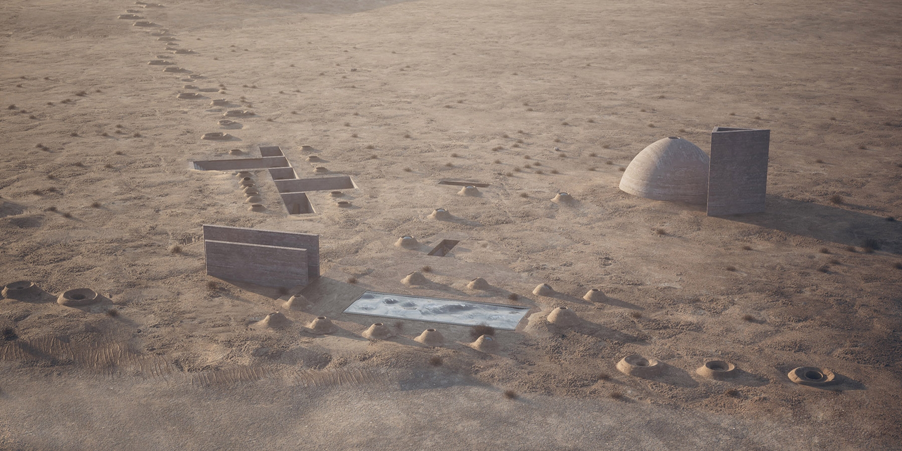 Qanats, landscape, earth, ancient building techniques, and historic references gradually formed our ideas. The home takes its orientation from its adjacent ancient castle and is sunken underground with the rest of the composition to minimize the thermal exchange between outside and inside.