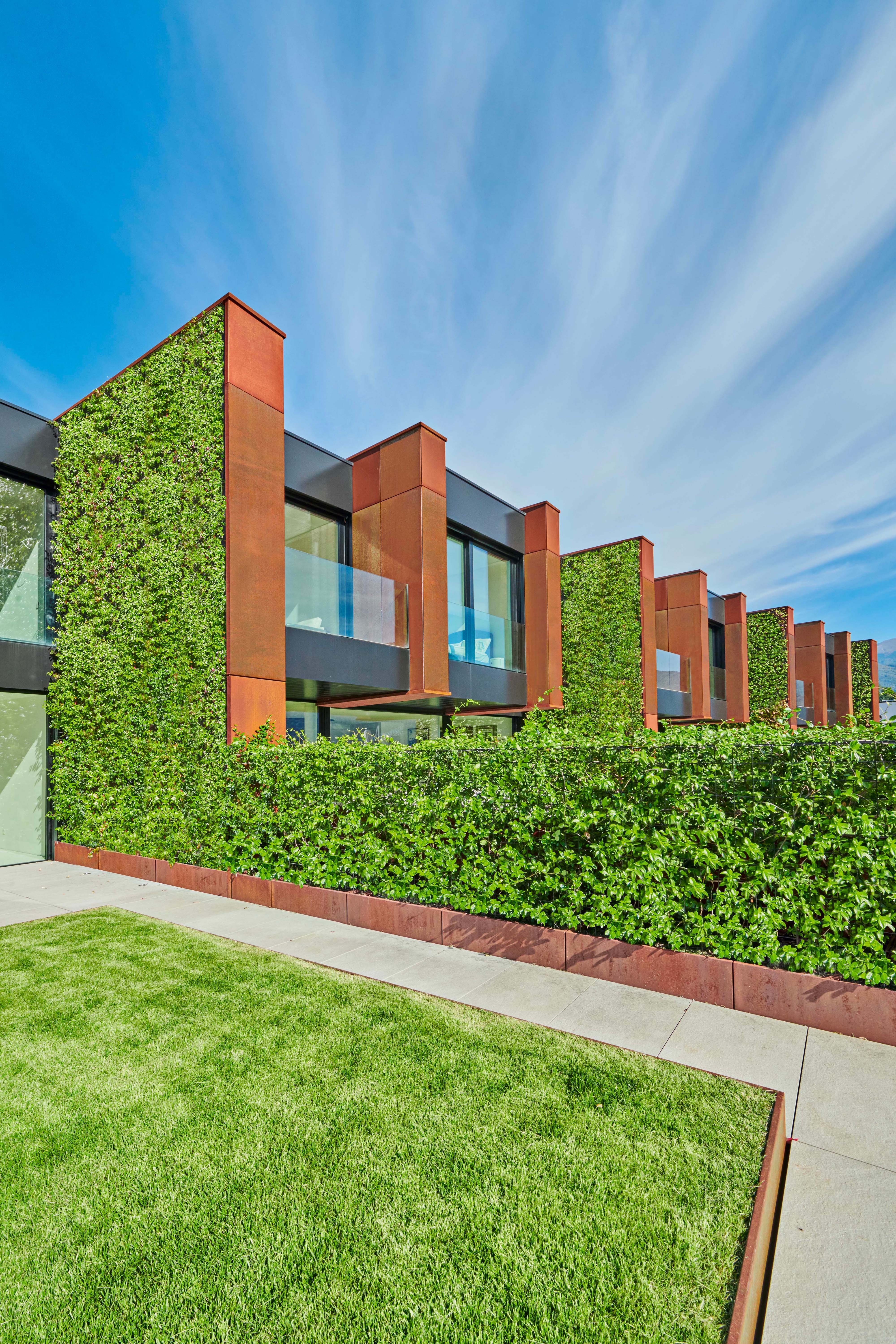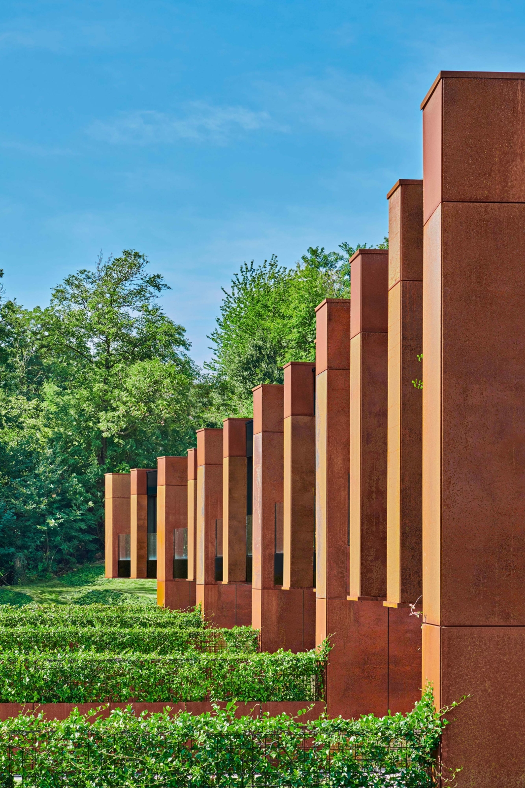 The materiality of the corten is the hallmark of the project and identifies the partitions, which are lined on both sides with climbing jasmine, in continuity with the hedges that divide the gardens.