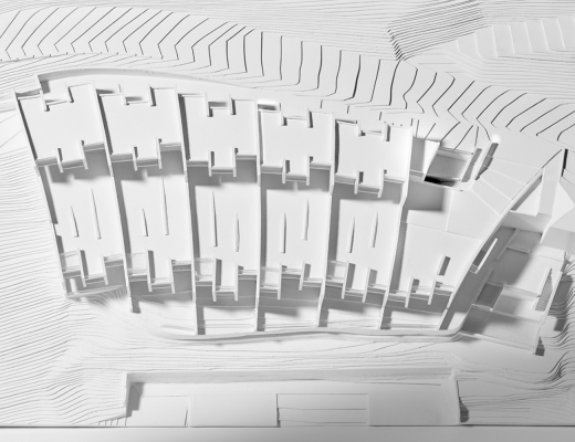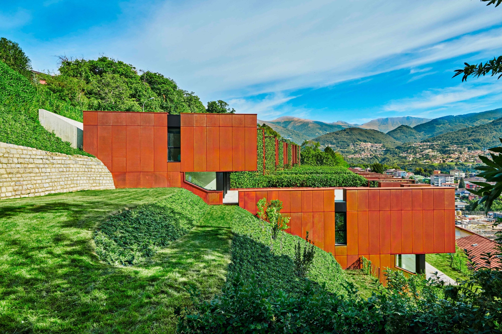 The inspiration for this residential complex in Canobbio, Switzerland, comes from the art world, specifically from the works of the American artist Richard Serra, evocative spatial sculptures built with metal sheets.