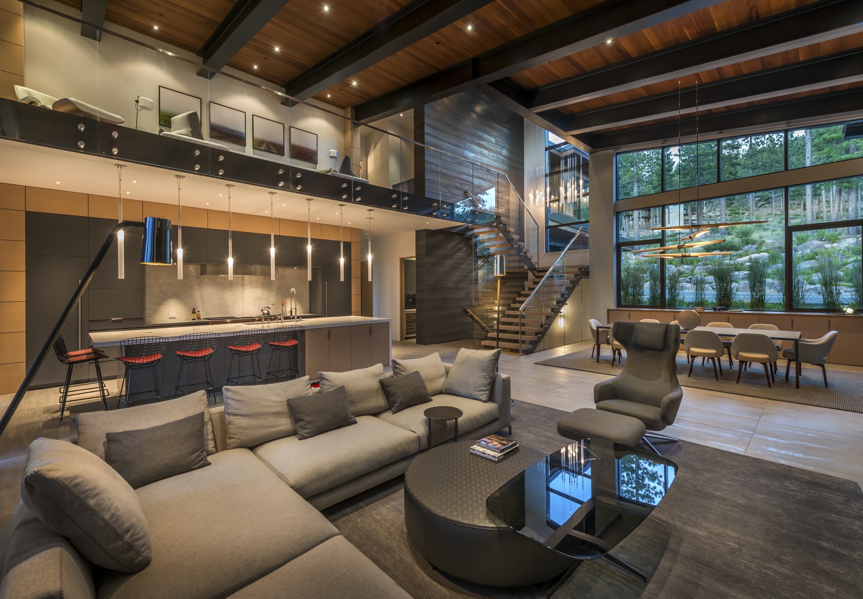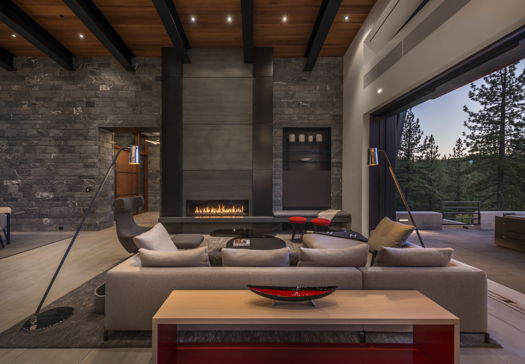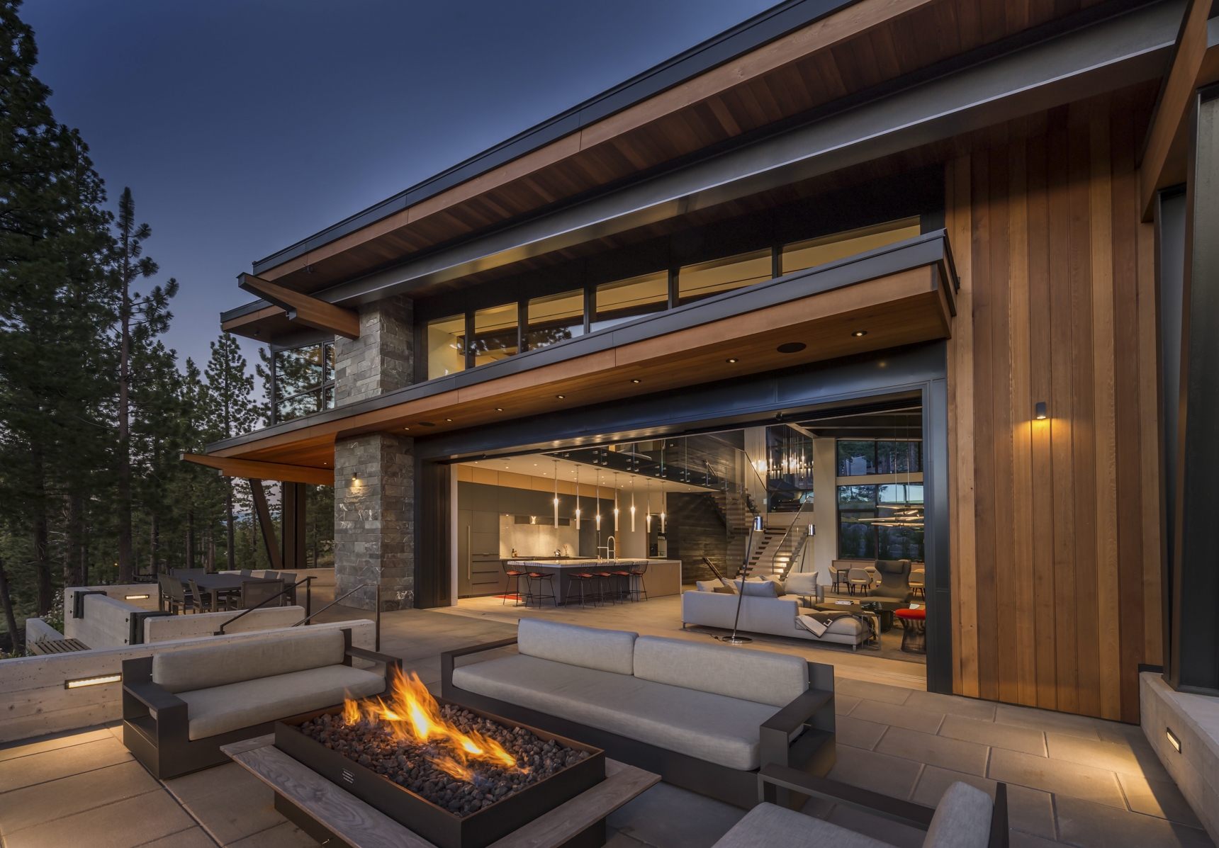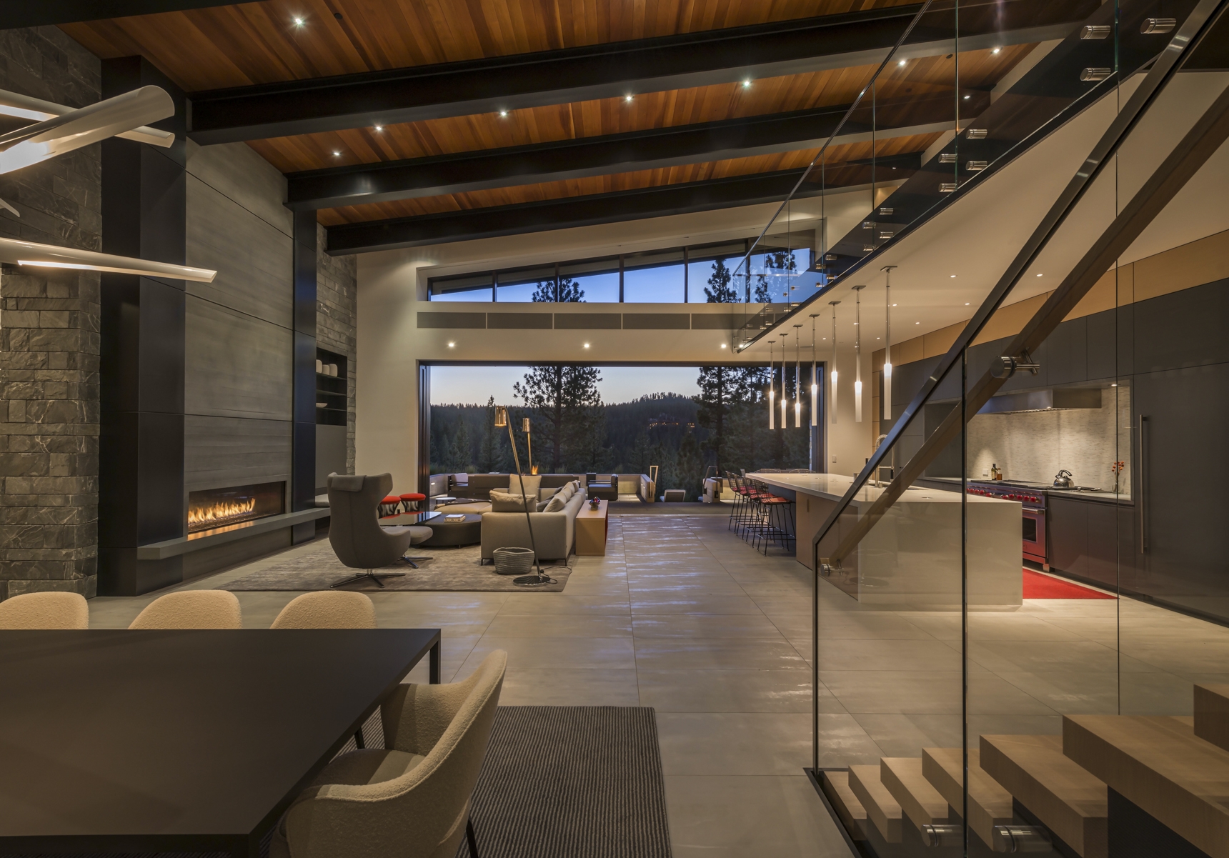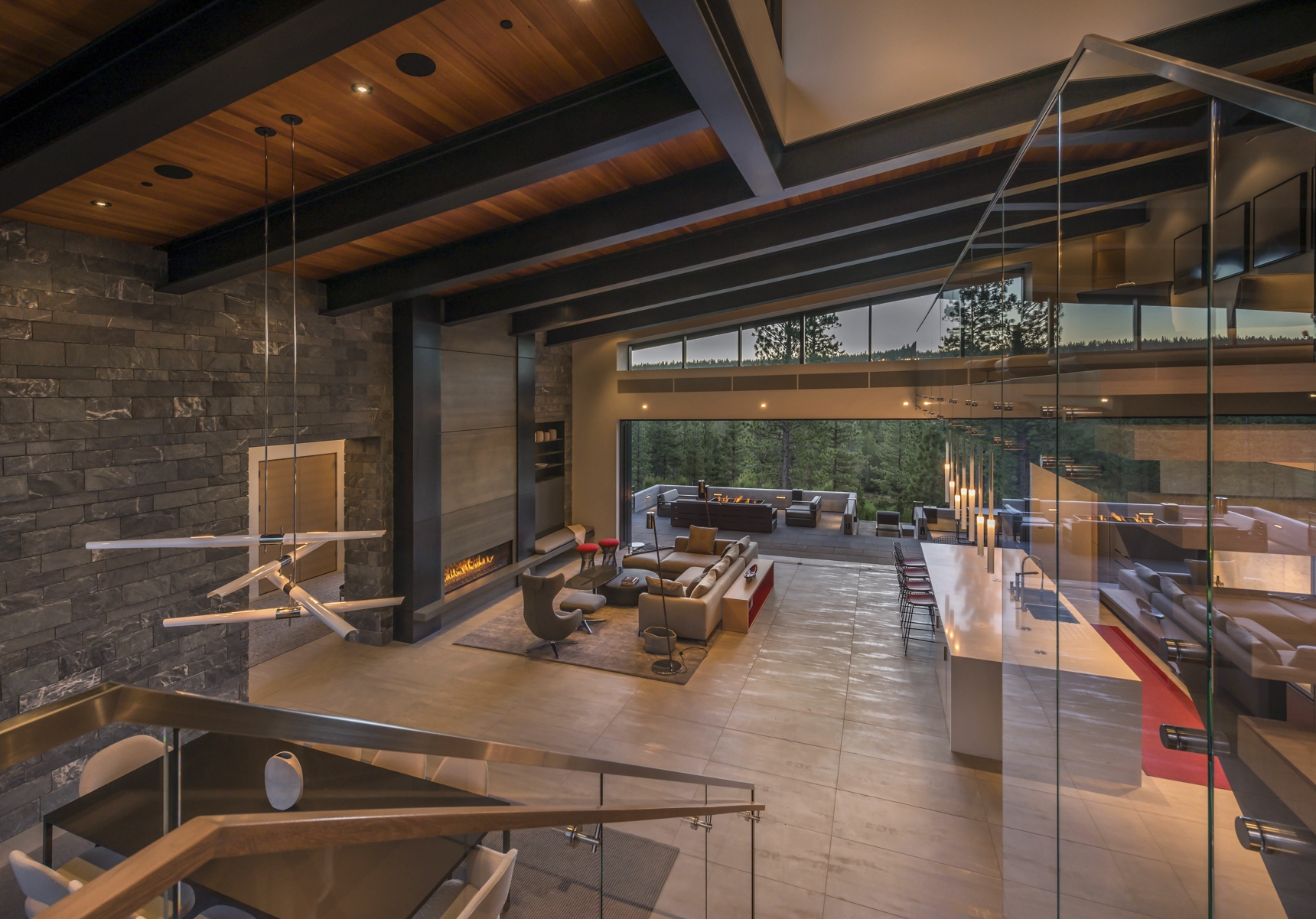 sculptural presence that integrates with the natural landscape. Interior spaces are richly detailed in stone, wood, and metal. The architecture team worked closely with the owners to select a natural stacked stone that expresses a warm, contemporary, aesthetic. Designed for entertaining, the open floor plan includes a spacious kitchen area that functions as an extension of the great room. Oversized custom windows blur the distinction between indoor and outdoor living spaces.