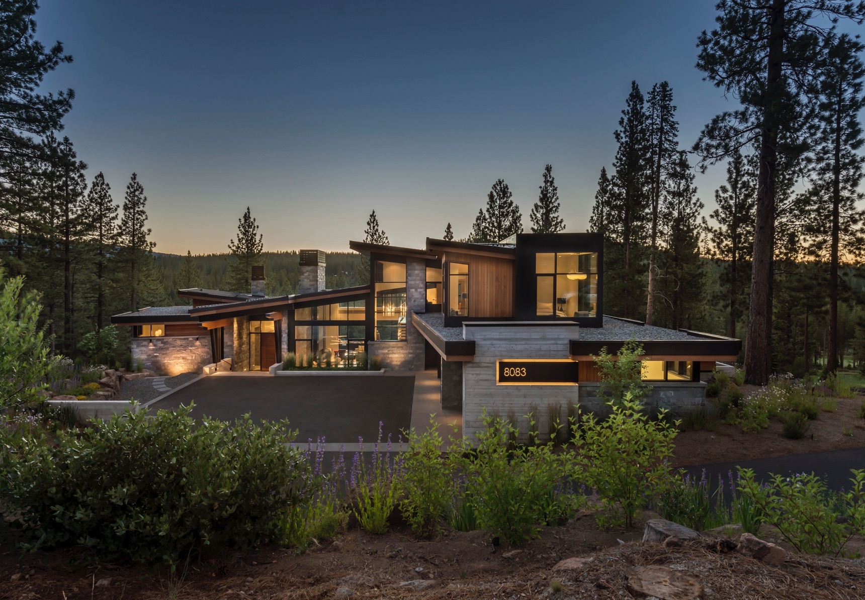 This mountain retreat embraces its exquisite surroundings with unique materials, forms, and superb workmanship. Angled and flat roof segments establish a contemporary sculptural presence that integrates with the natural landscape. Interior spaces are