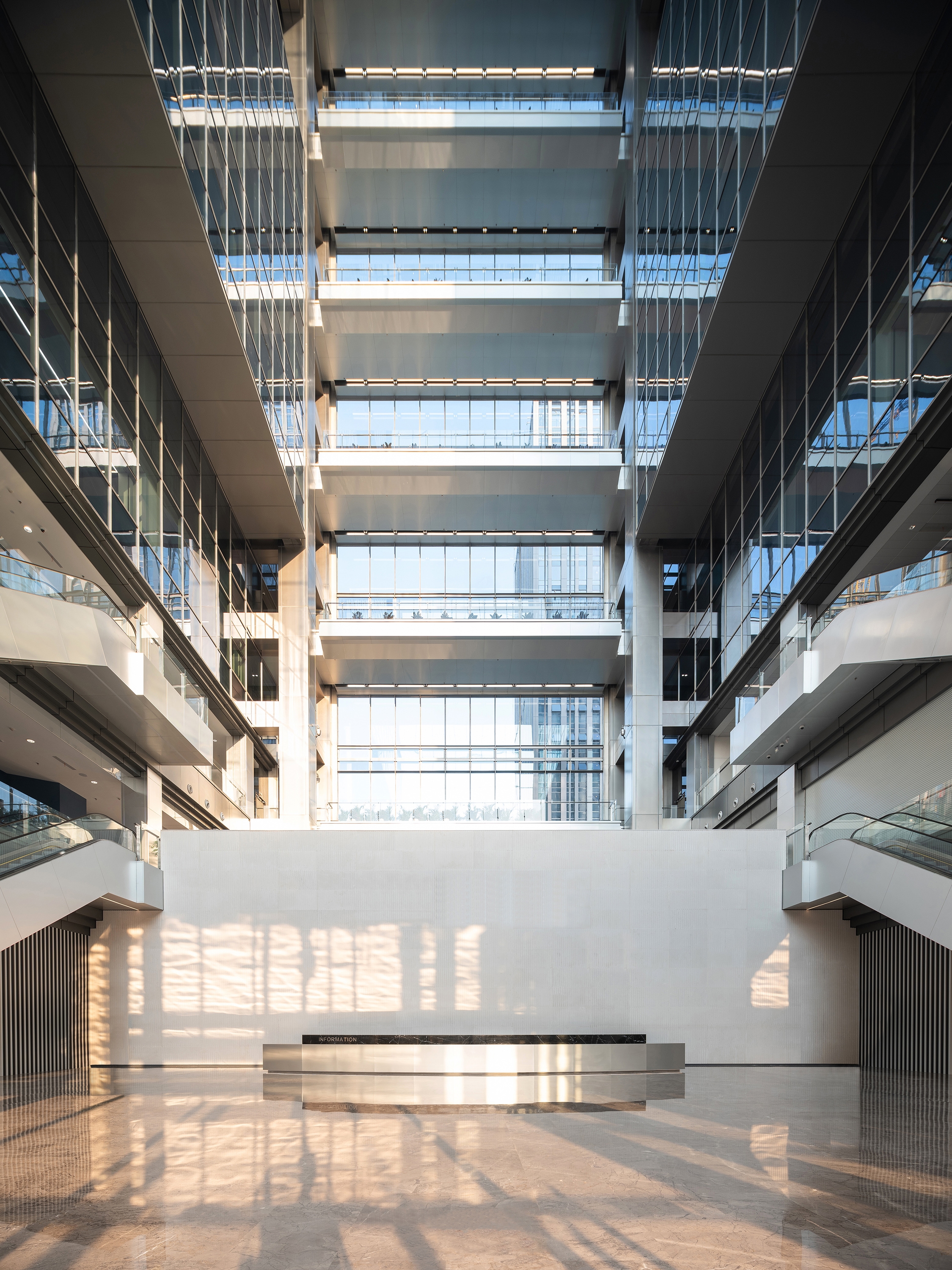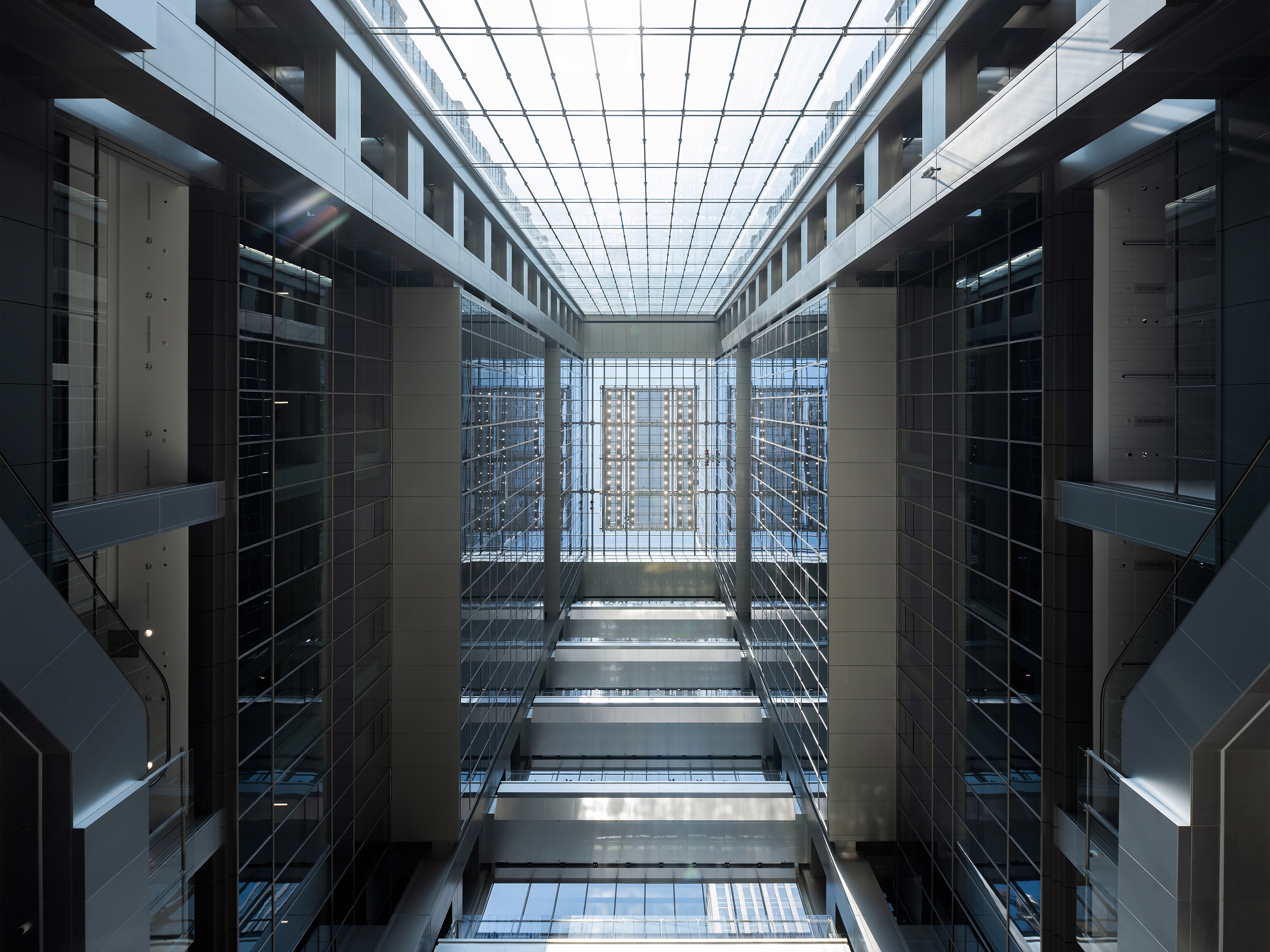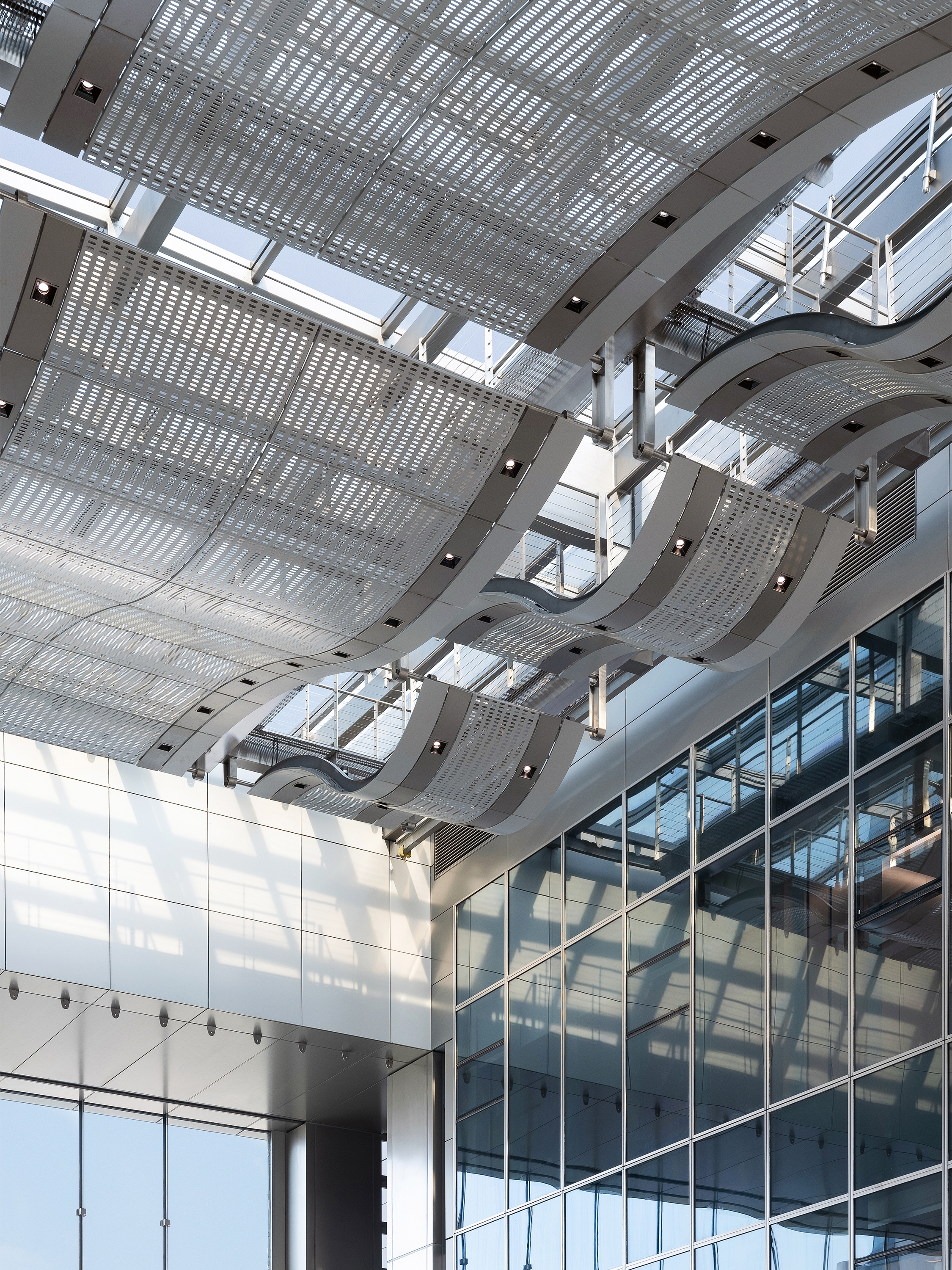 Between the two towers, a 27-metre-wide glazed canopy with a 15-metre cantilever creates a dramatic entrance experience, leading to the central glazed atrium. A cable-net glass curtain wall is used for the east facade of the atrium, creating an extraordinary transparency and clarity by hiding the anchors and spring assemblies in an ingenious way.