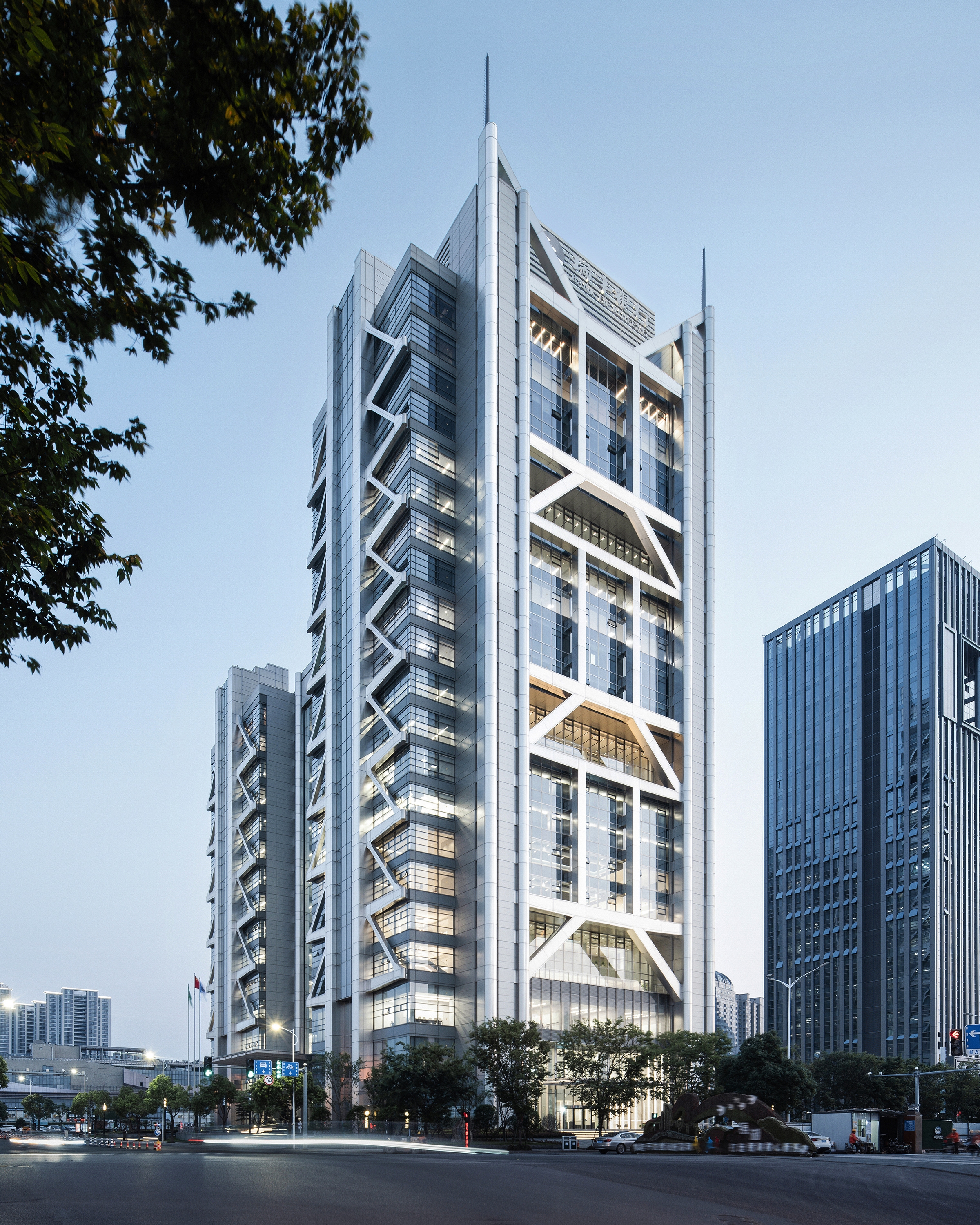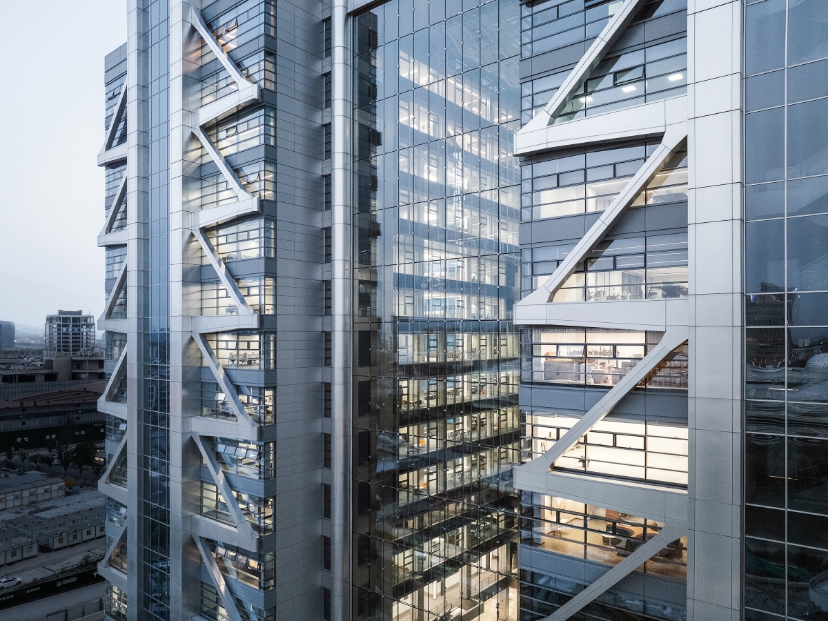 The Exo Towers is comprised of two towers and linked together by a 70m-high central glazed atrium. As the digital finance center of the Bank of Ruifeng, the building utilizes an external structural system that greatly reduces the number of columns of the typical floor, creating large and open office space, allowing for the ongoing flexible division of functional layout to cope with the banking business adjustments brought on by new digital challenges. The Exo Towers therefore derives its architectural language from the manner in which the space and structure are completely integrated.