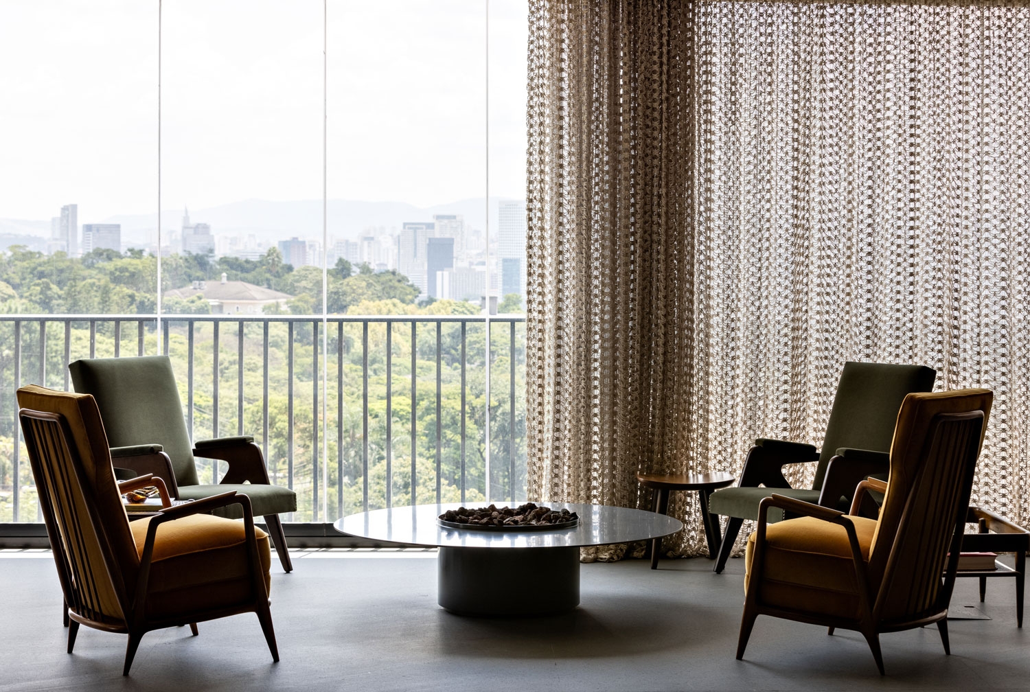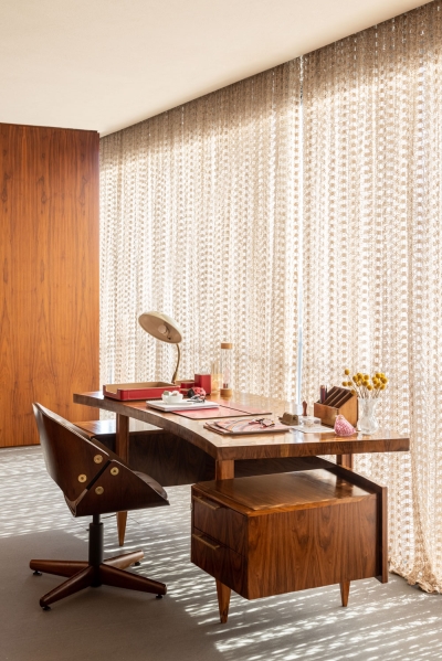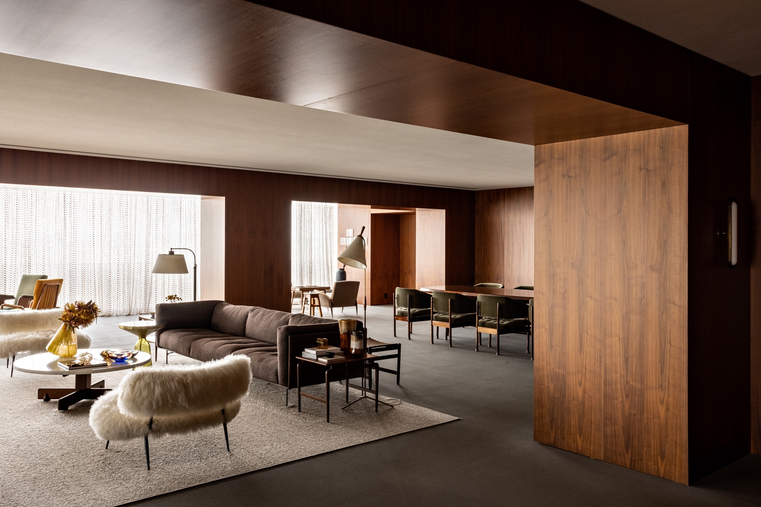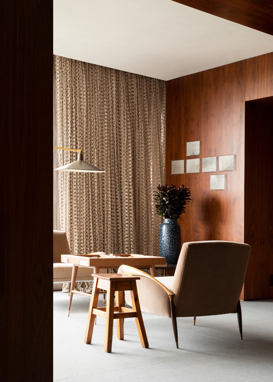 Generous windows invite a soft light, filtered by a lace curtain, in Flat #06 interiors. Composed by a series of cozy ambiences that enhances Brazilian vintage design and woods, the living spaces enables an integrated family experience. TV room and bedrooms open themselves to a terrace that mediates the dialogue between intimacy and São Paulo’s skyline. Sober finishings such as the basaltine stone flooring and ipê wood panels are lighten by tactile fabrics and delineated pieces. Designed with an extreme attention to details, the combination of textures with sharp forms configure wide and soulful spaces, that embraces a joyful living.
