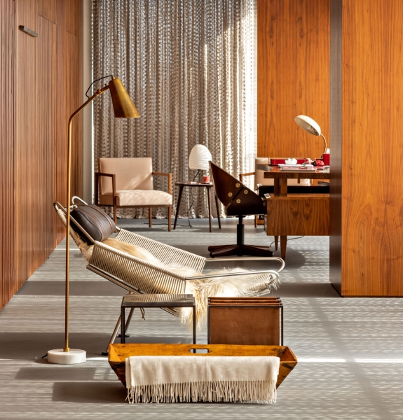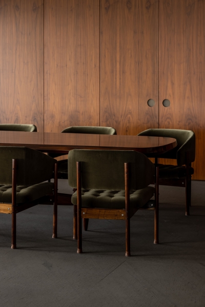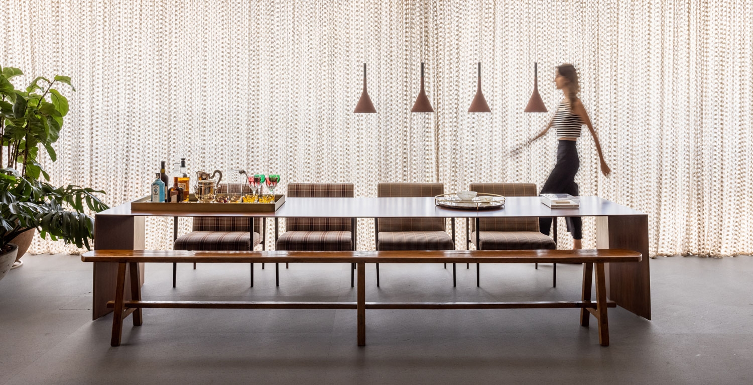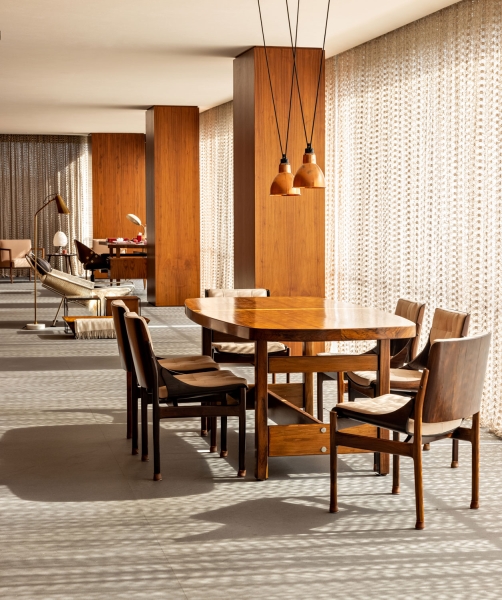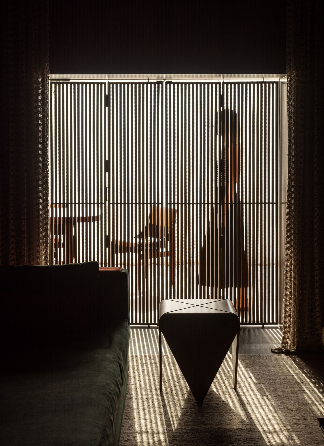 Generous windows invite a soft light, filtered by a lace curtain, in Flat #06 interiors. Composed by a series of cozy ambiences that enhances Brazilian vintage design and woods, the living spaces enables an integrated family experience. TV room and bedrooms open themselves to a terrace that mediates the dialogue between intimacy and São Paulo’s skyline. Sober finishings such as the basaltine stone flooring and ipê wood panels are lighten by tactile fabrics and delineated pieces. Designed with an extreme attention to details, the combination of textures with sharp forms configure wide and soulful spaces, that embraces a joyful living.