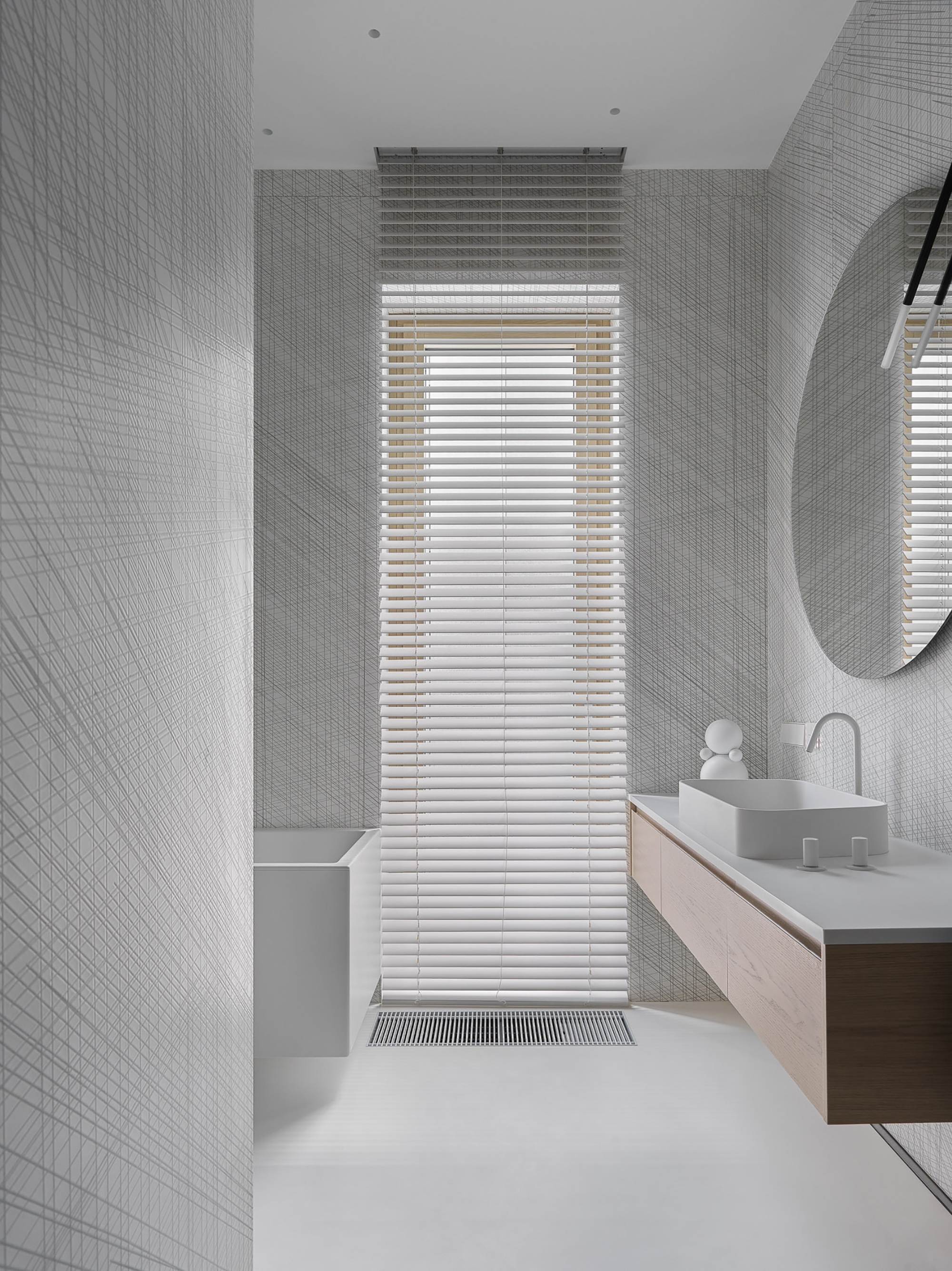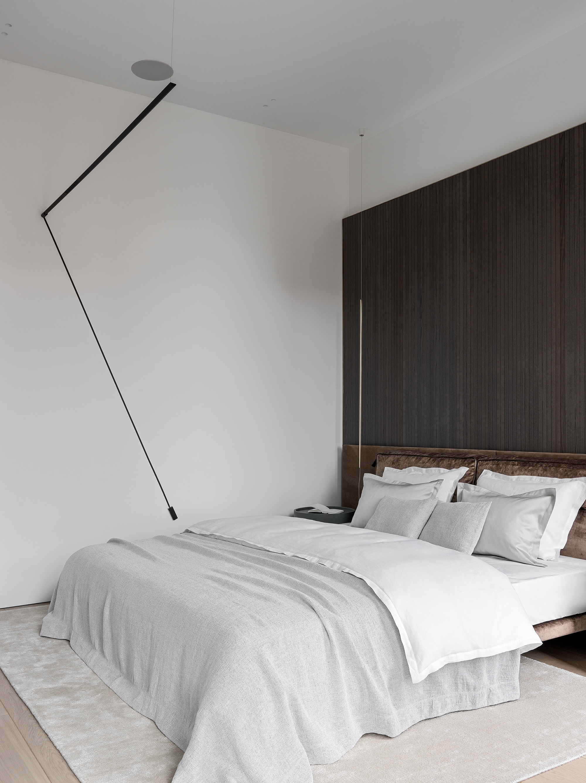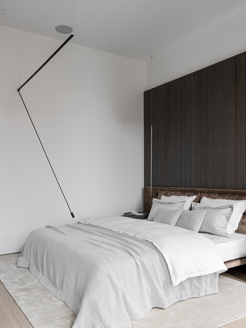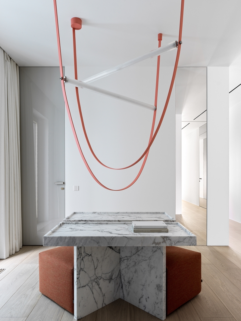 The apartment occupies an entire floor and was initially characterized by complex geometry with sharp corners. The architects built the layout so that this acute-angled contour was not felt anywhere.