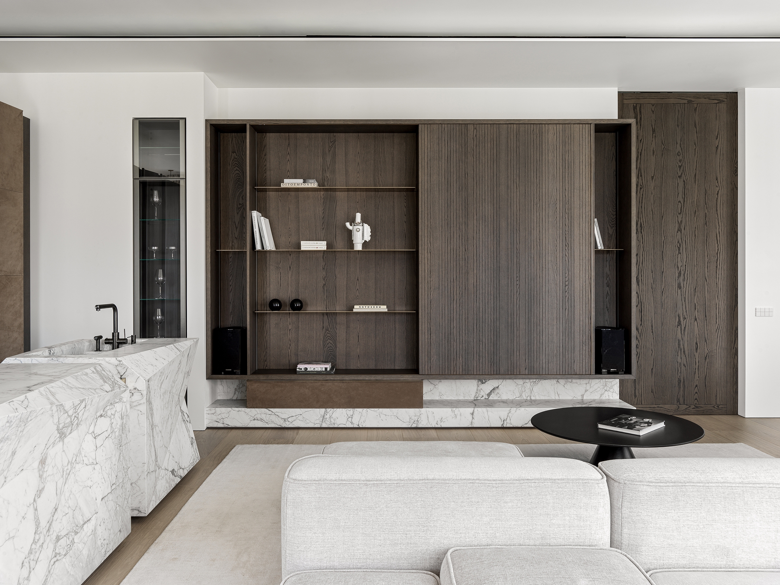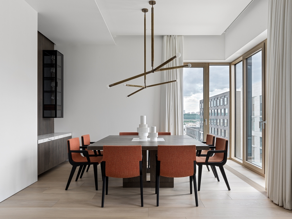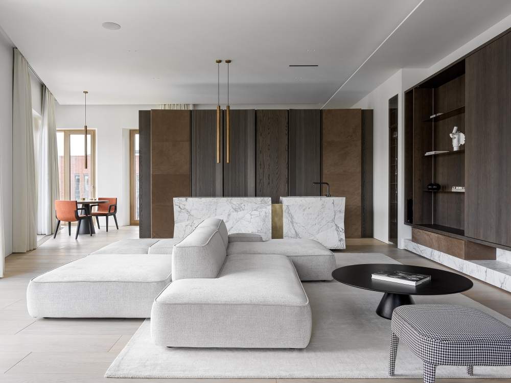 The starting point of the Sadovie Kvartali project was the bright space itself with high ceilings and a gorgeous panoramic view. Architects had to reveal and emphasize these advantages as much as possible. It was important to create a multi-scenario and multi-functional space without breaking it up or overloading it. In the project, every centimeter is used despite the general visual lightness.