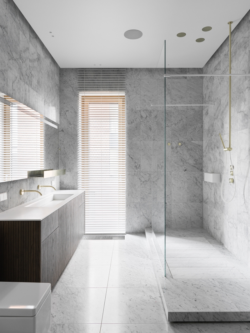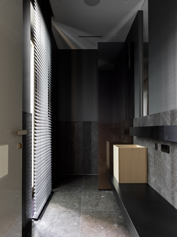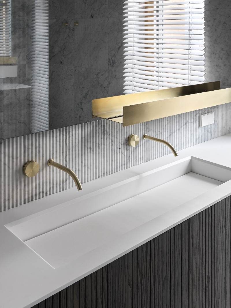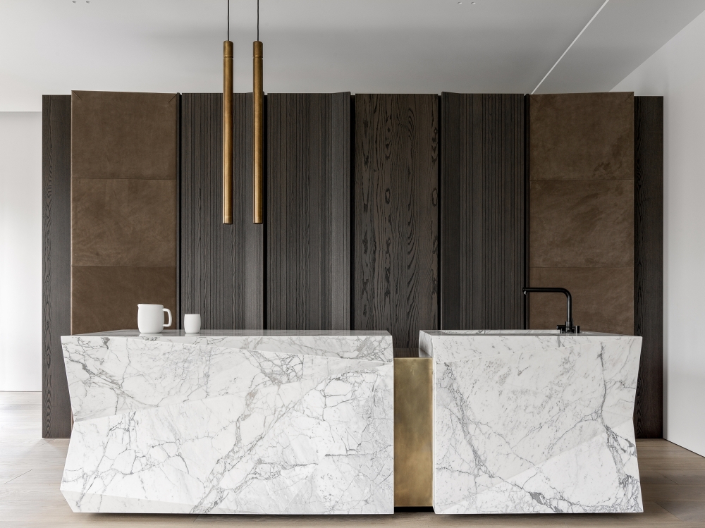 A rich palette of natural materials was used in this project: wood, natural leather, brass, and stone. All cabinet furniture is made of ash veneer, tinted in a cold shade.