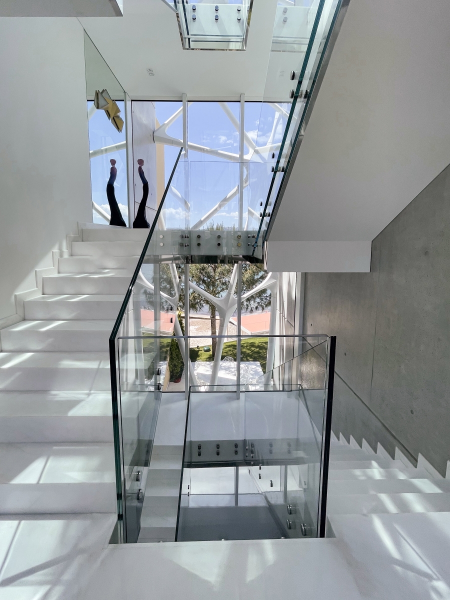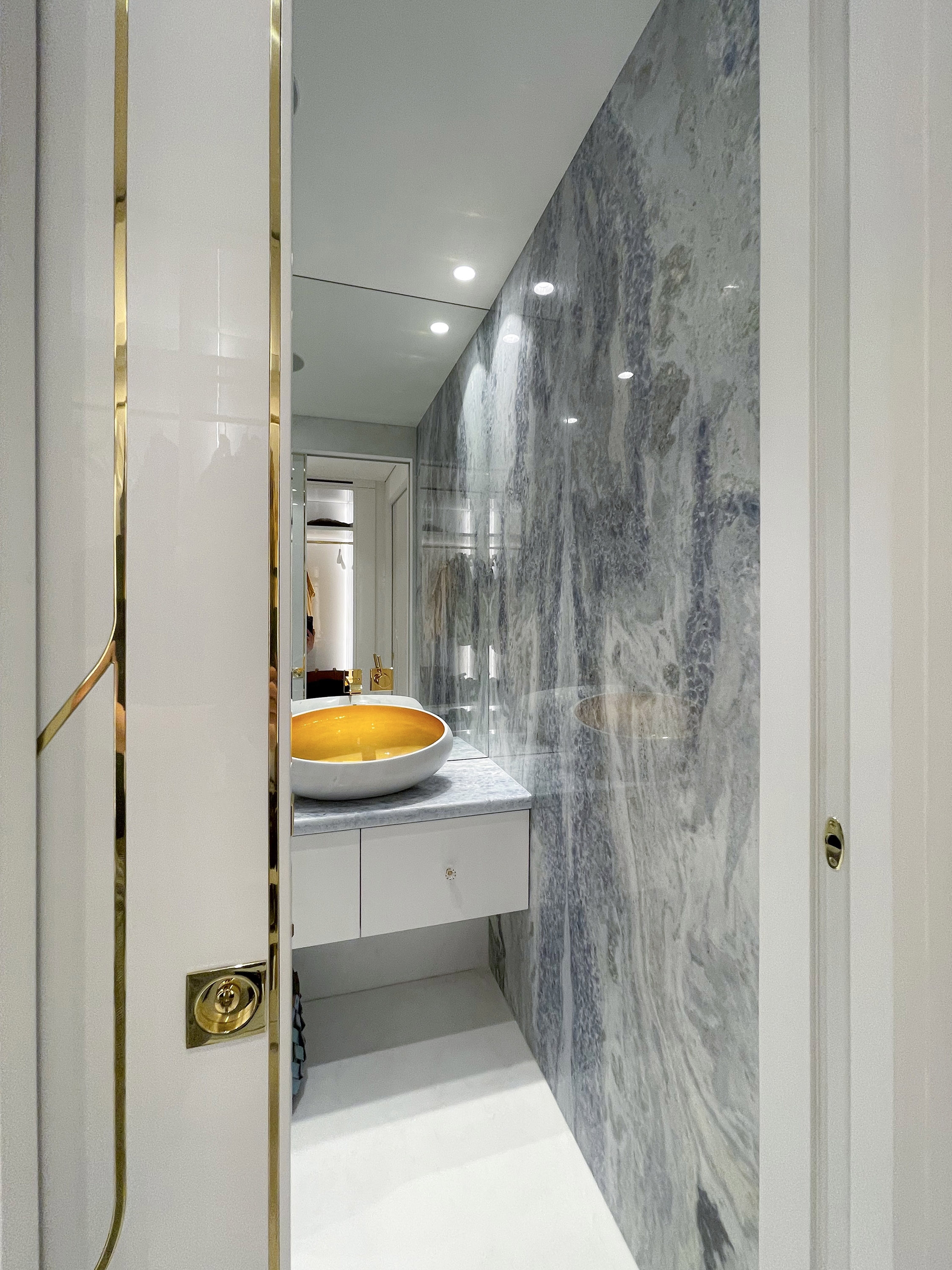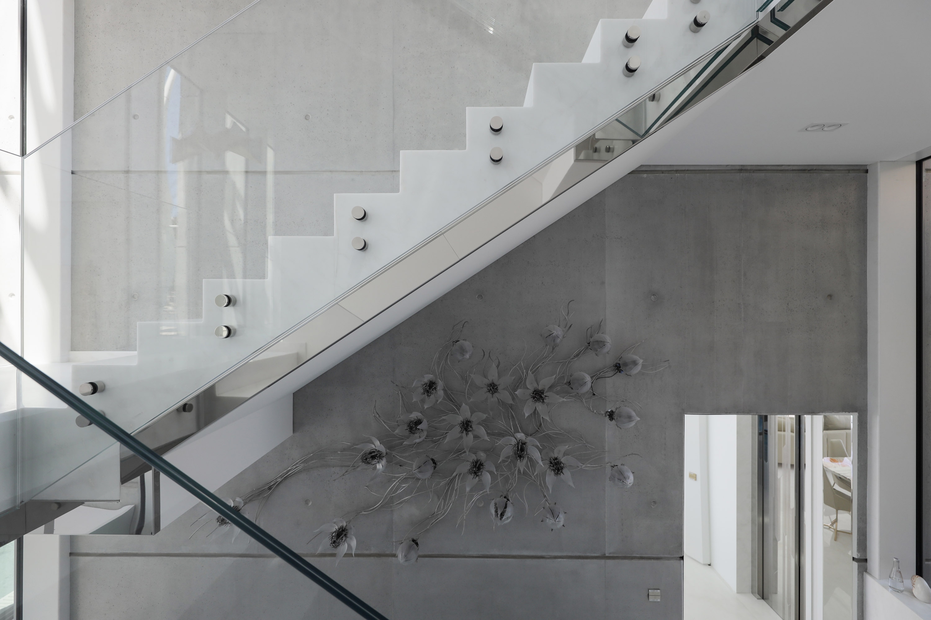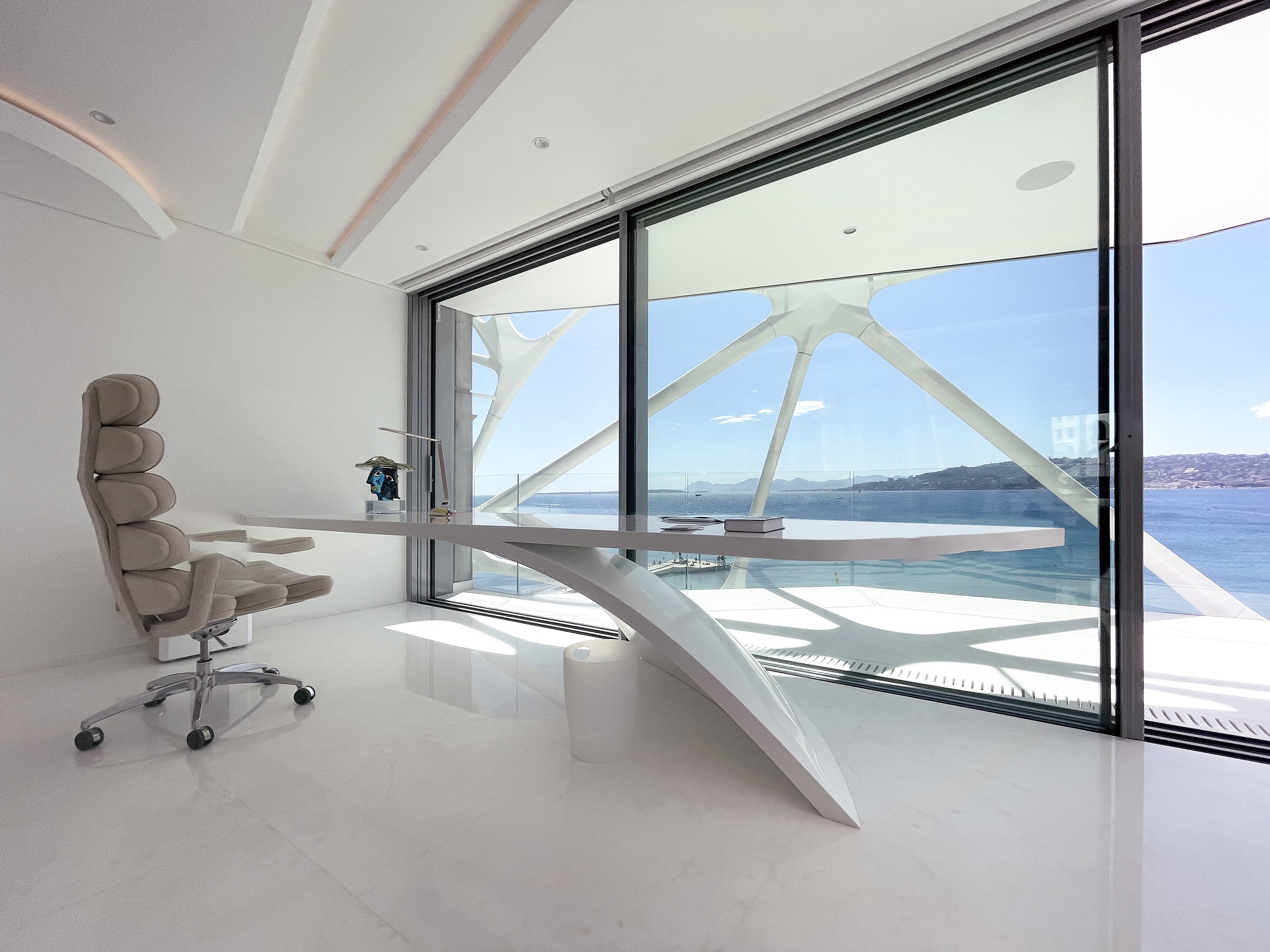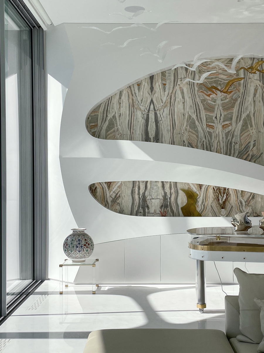 Bionic forms present in facade design, inside the house turn into large-scale arches, elastic lines of structural and decorative elements. Voluminous structures made of Corian complement the laconic contemporary style of the villa. These curved wall panels set up a unique geometry and plasticity of the space and create a feeling of perfectly smooth surface. The decorative effect is enhanced by brass inlay and rare Onyx Rainbow of extraordinary colours and patterns.