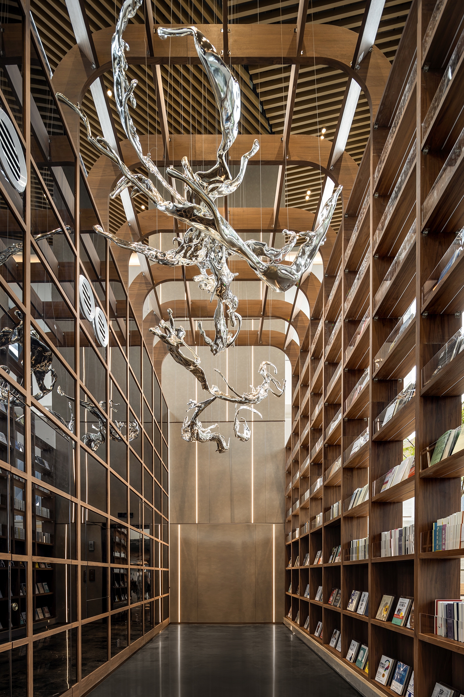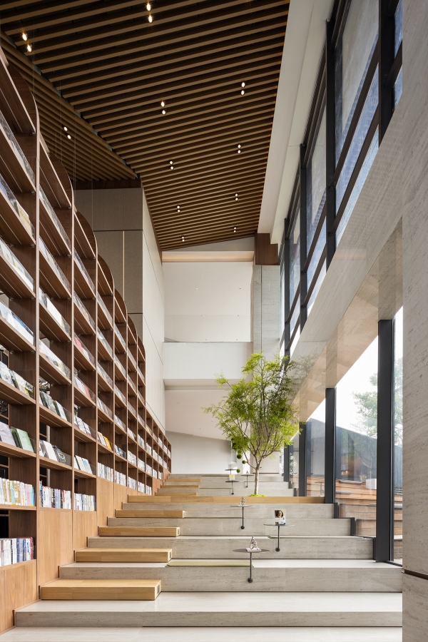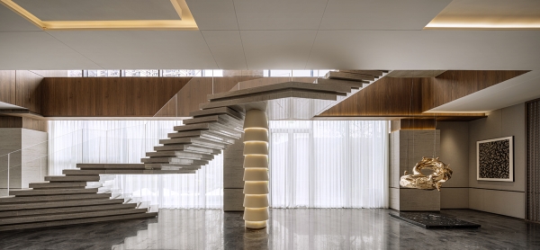 The designer uses eco-friendly materials and high technology for this project to create a green building and interior space. The installation paintings are made of recycled paper and created by folding, arraying, and reorganizing art forms. Other than that, the branches of the simulated floral art are made from naturally fallen branches, realizing the spirit of environmental protection of reuse and re-blooming the green life while simultaneously creating a natural space.