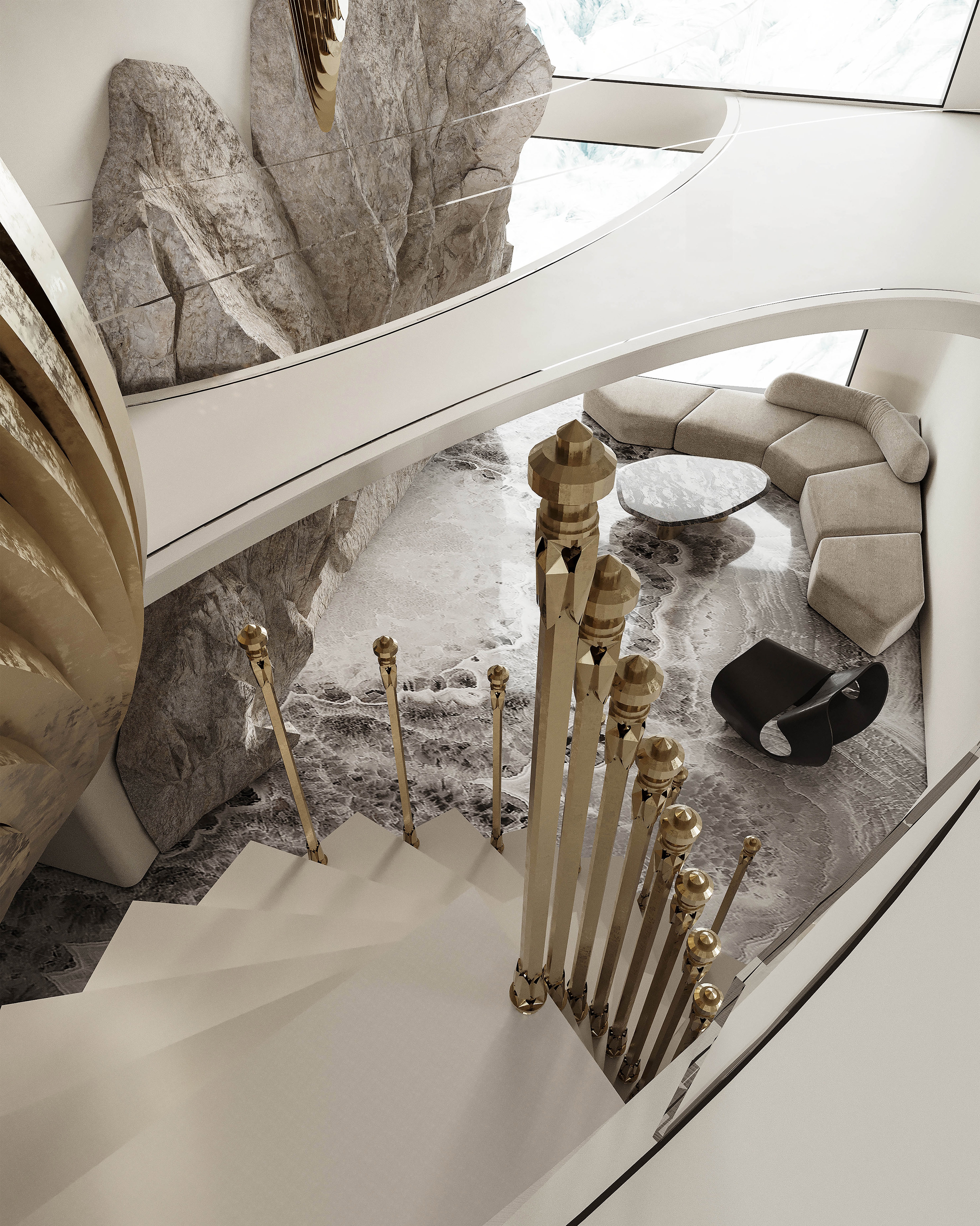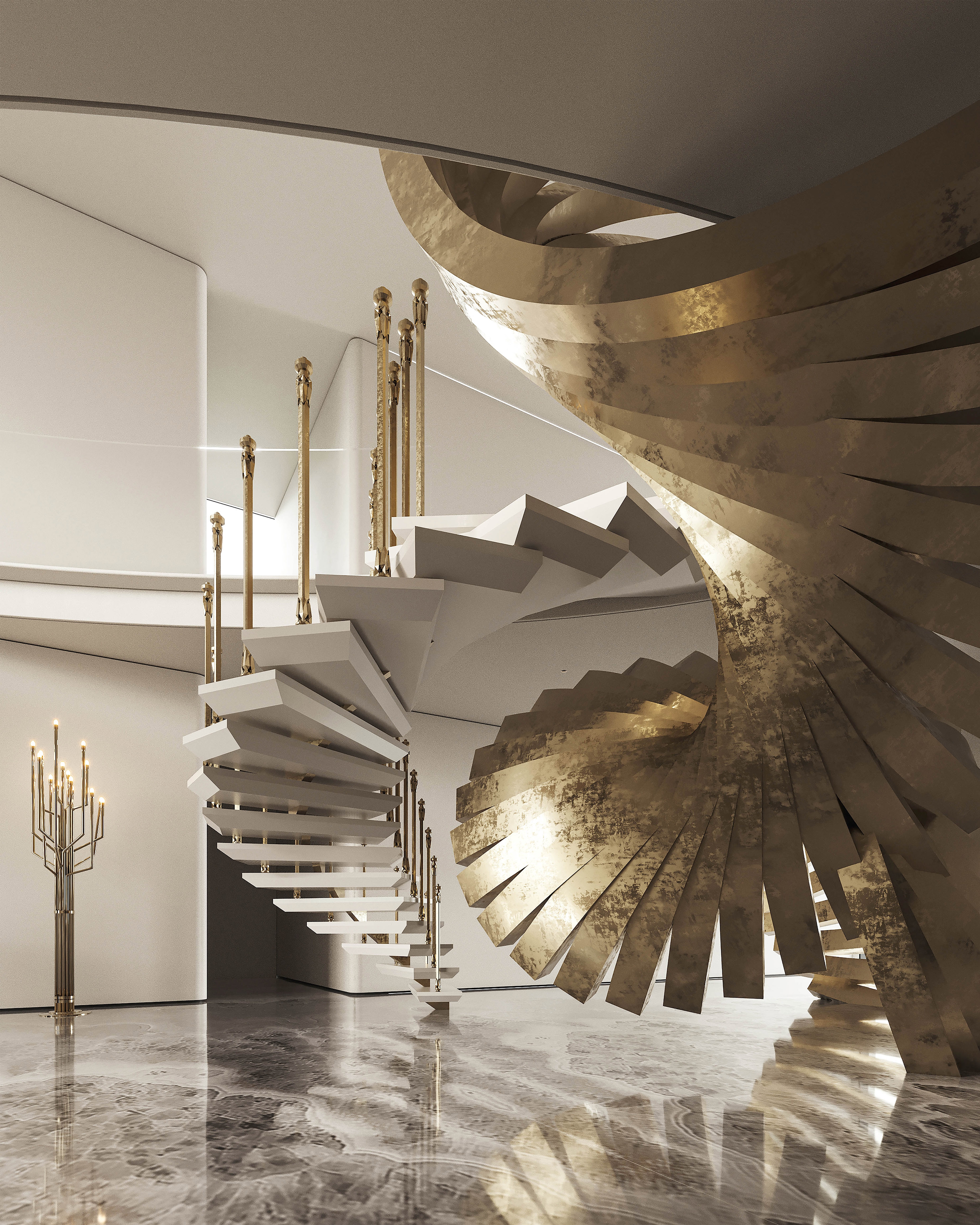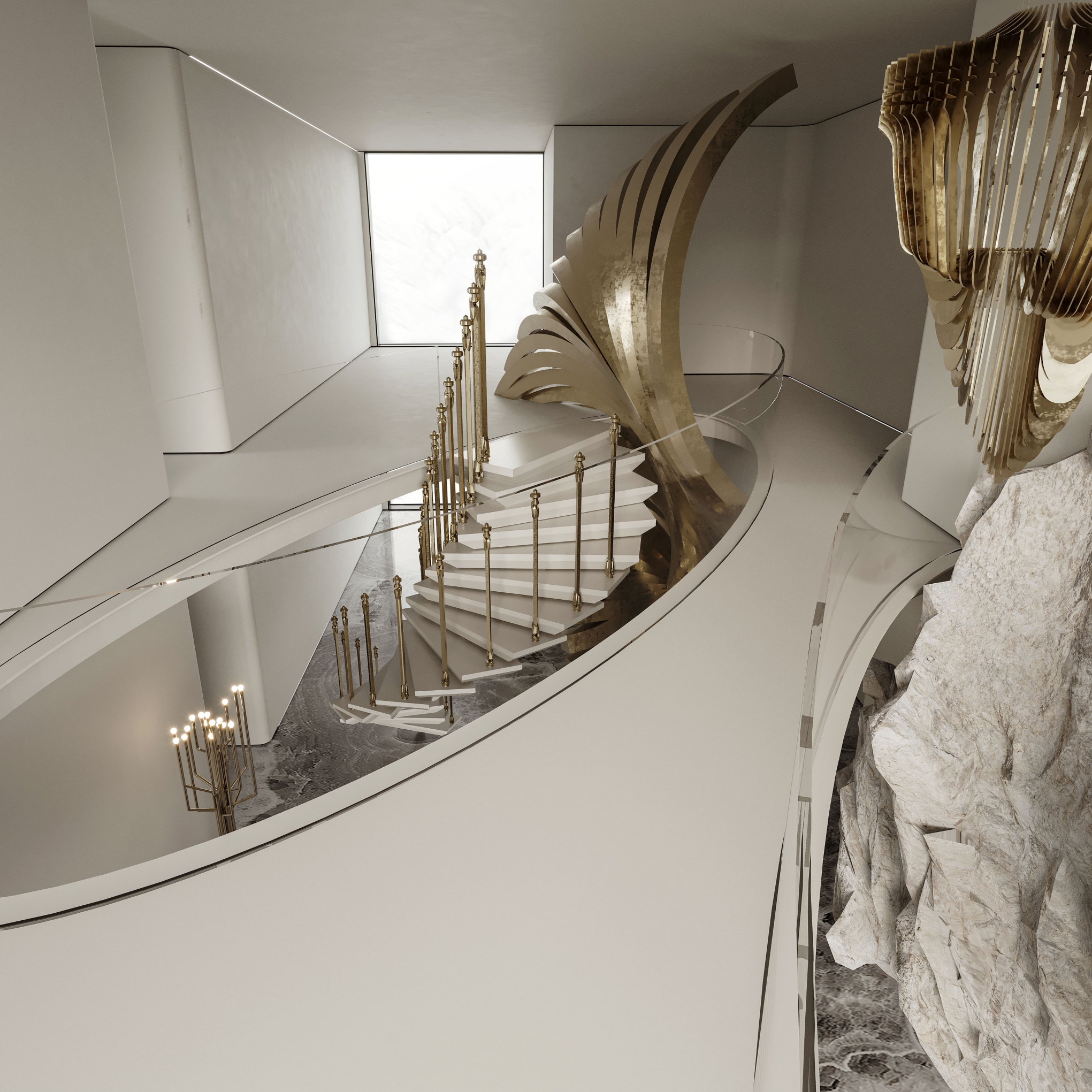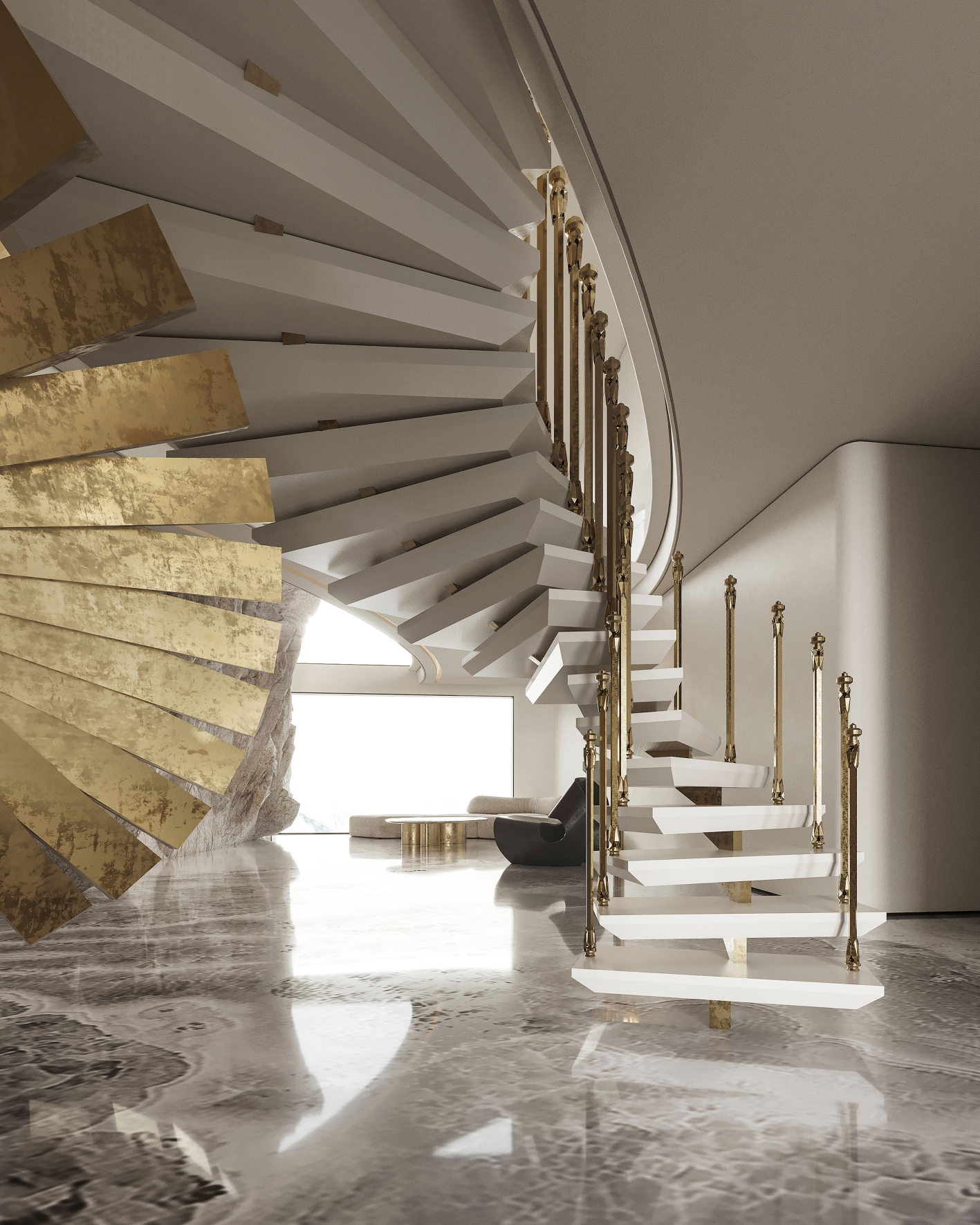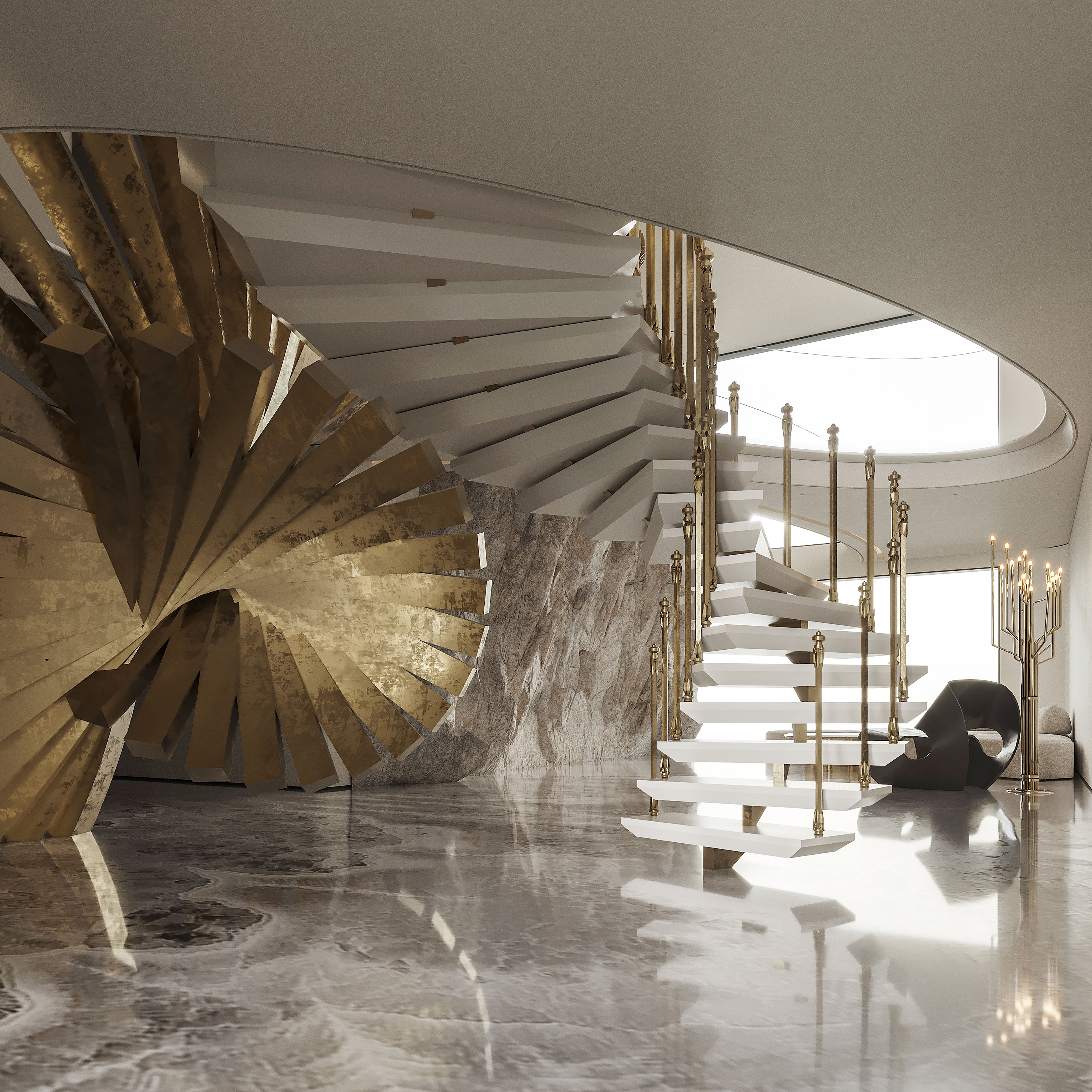 Interlaced with the spiral staircase, the golden-curved structure runs through the space in a dramatic way. The milky white steps spin around like a elegant dance troupe, reflecting the glitter of sunlight.