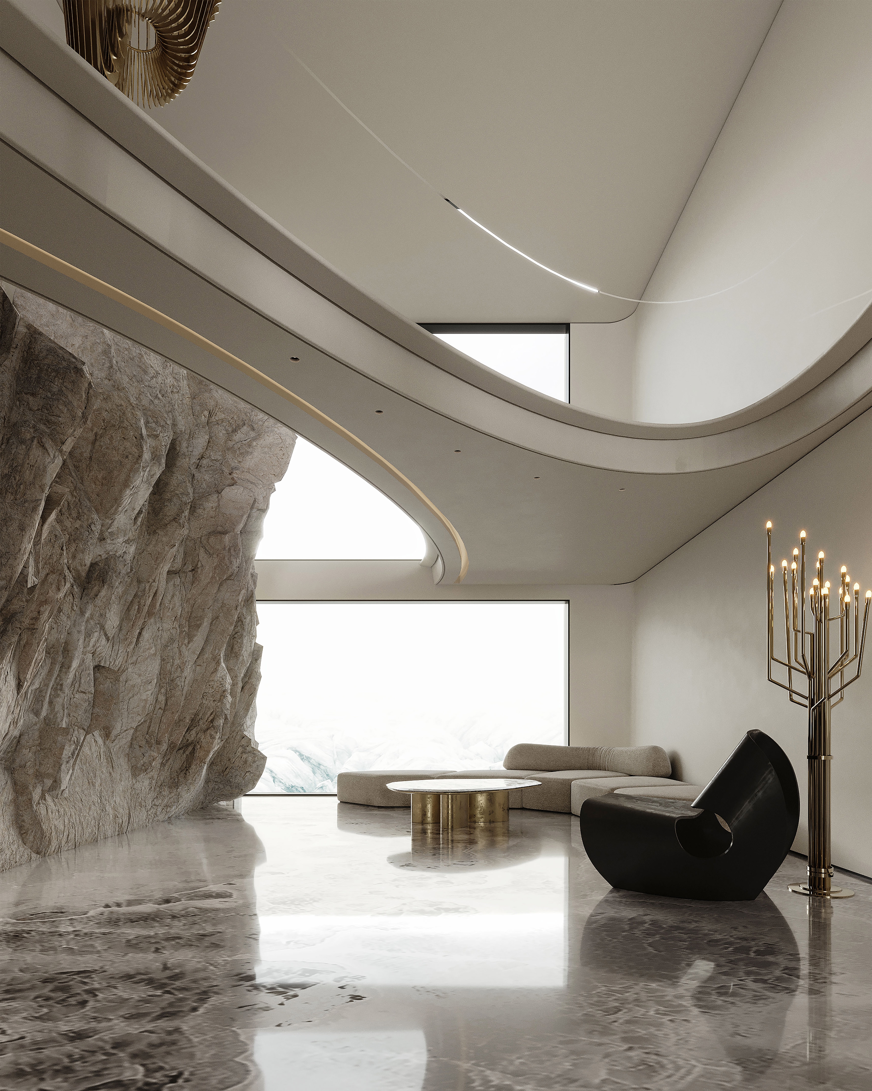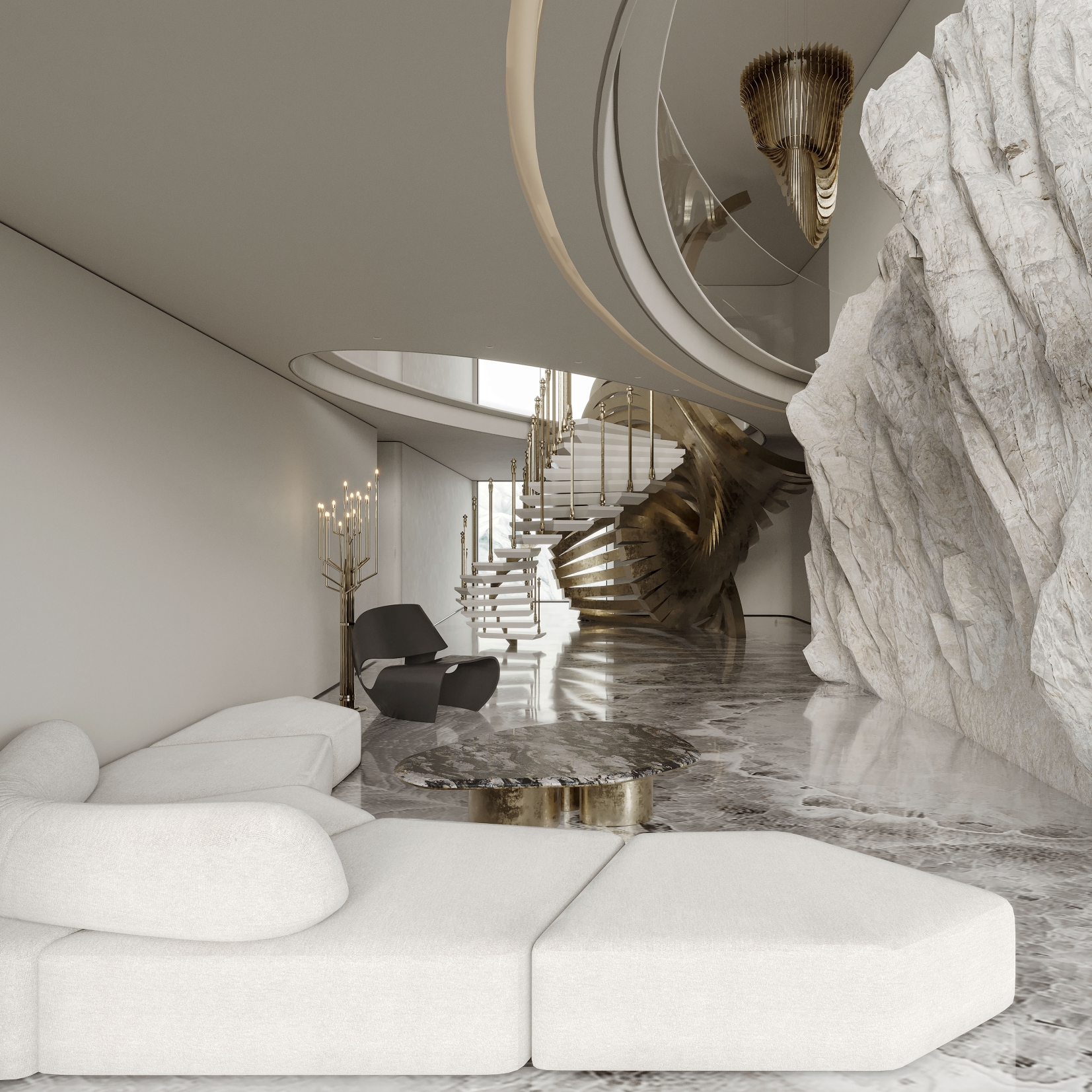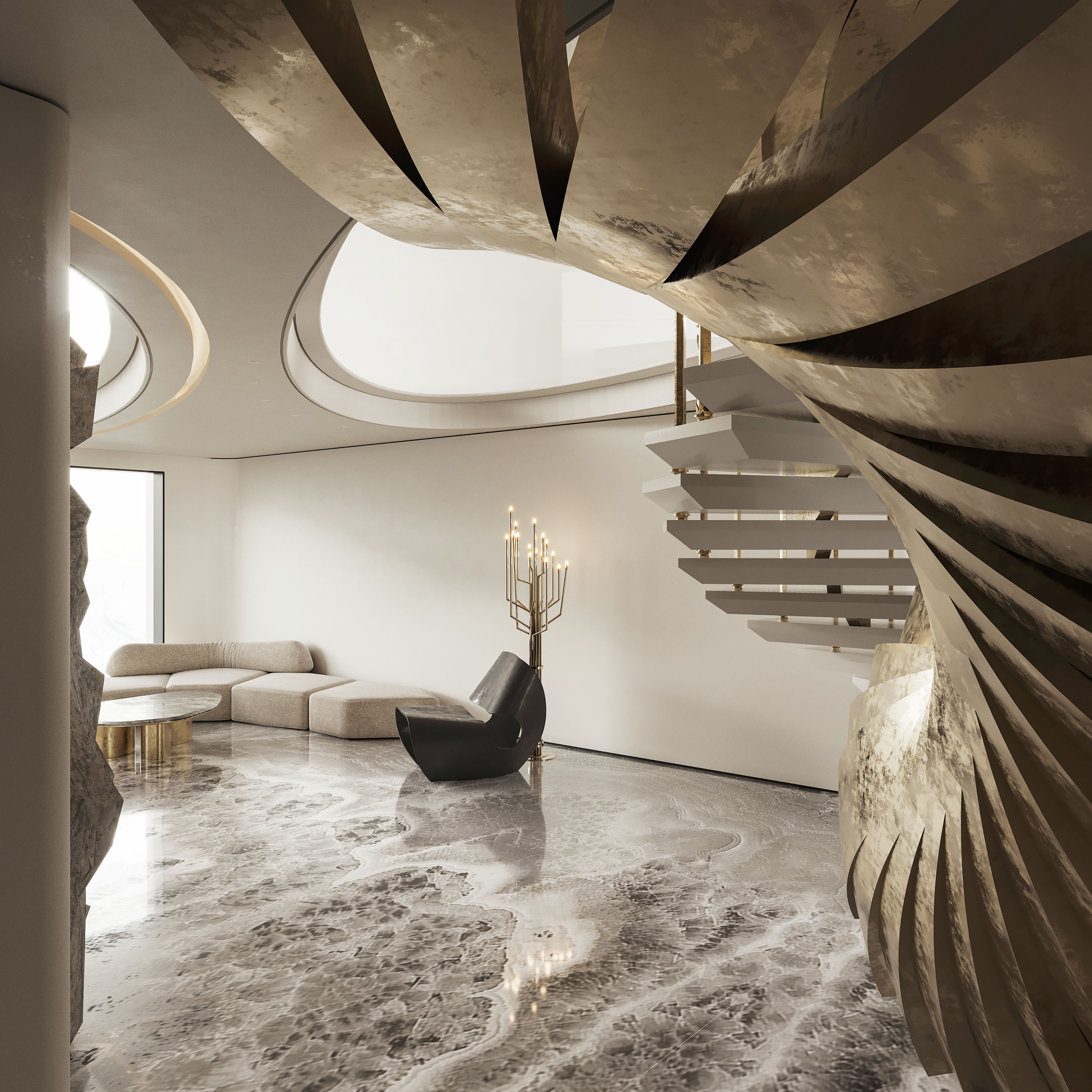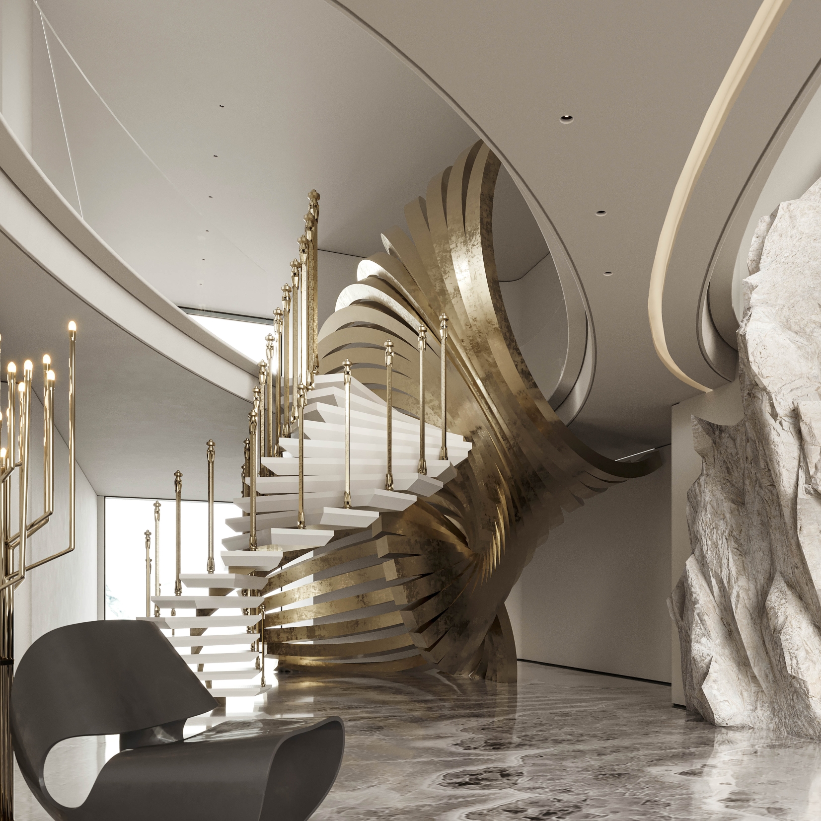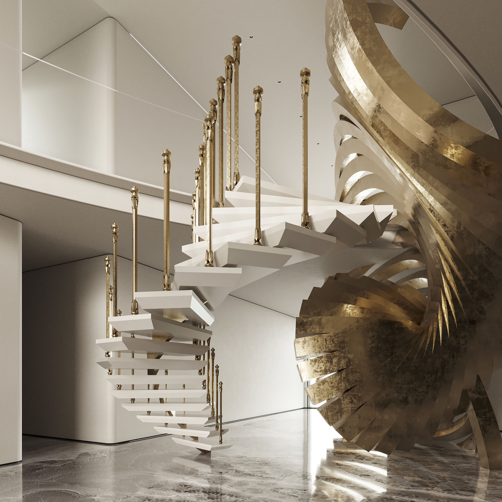 Interlaced with the spiral staircase, the golden-curved structure runs through the space in a dramatic way. The milky white steps spin around like a elegant dance troupe, reflecting the glitter of sunlight.