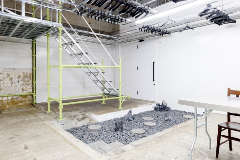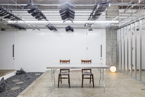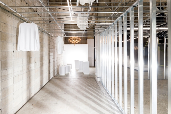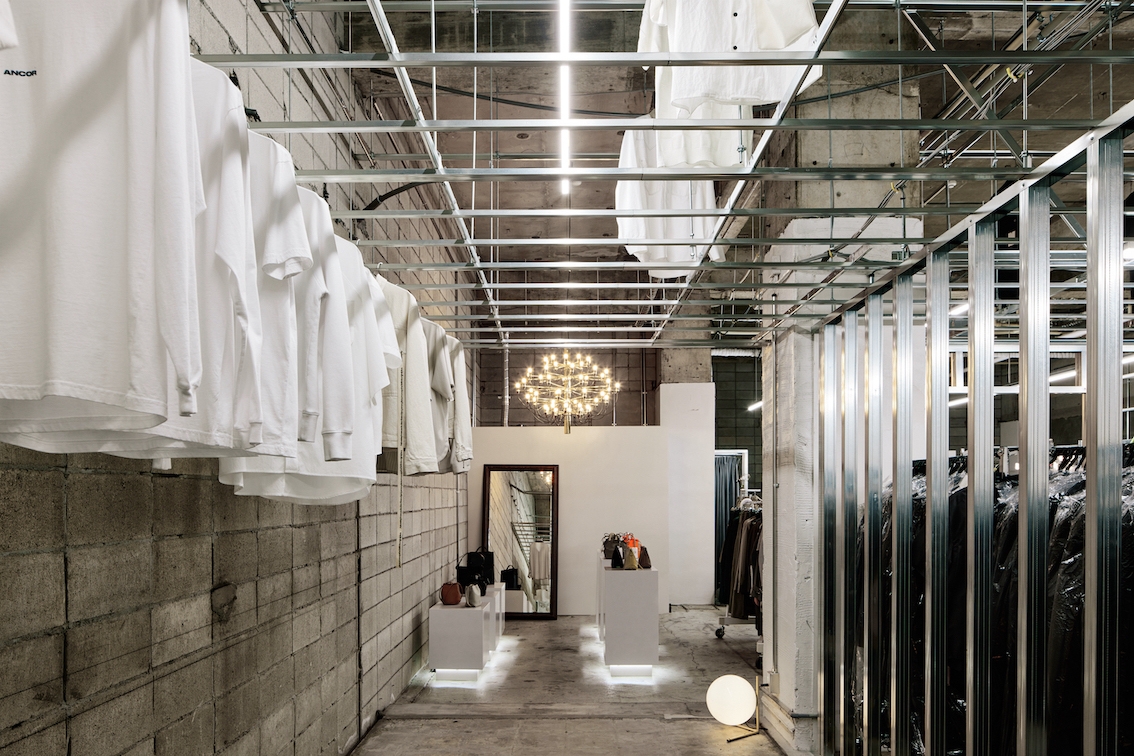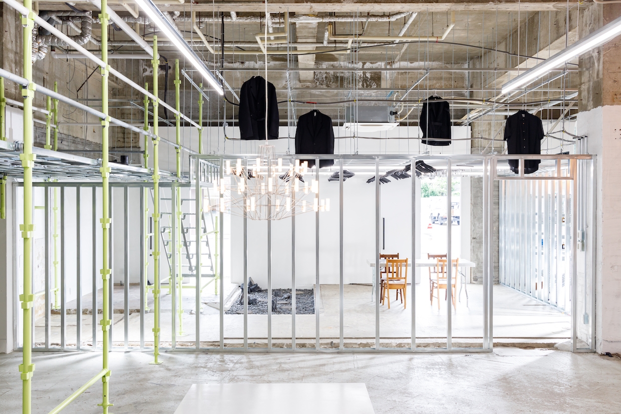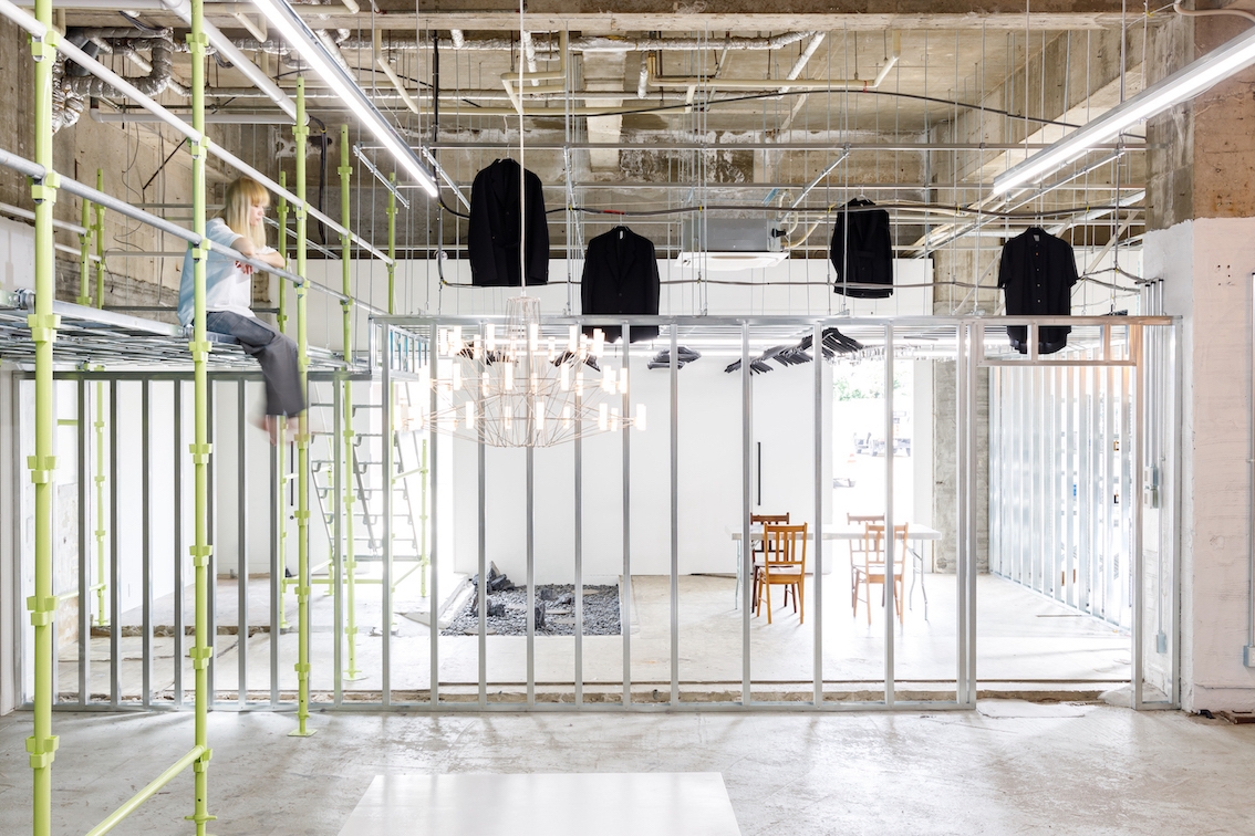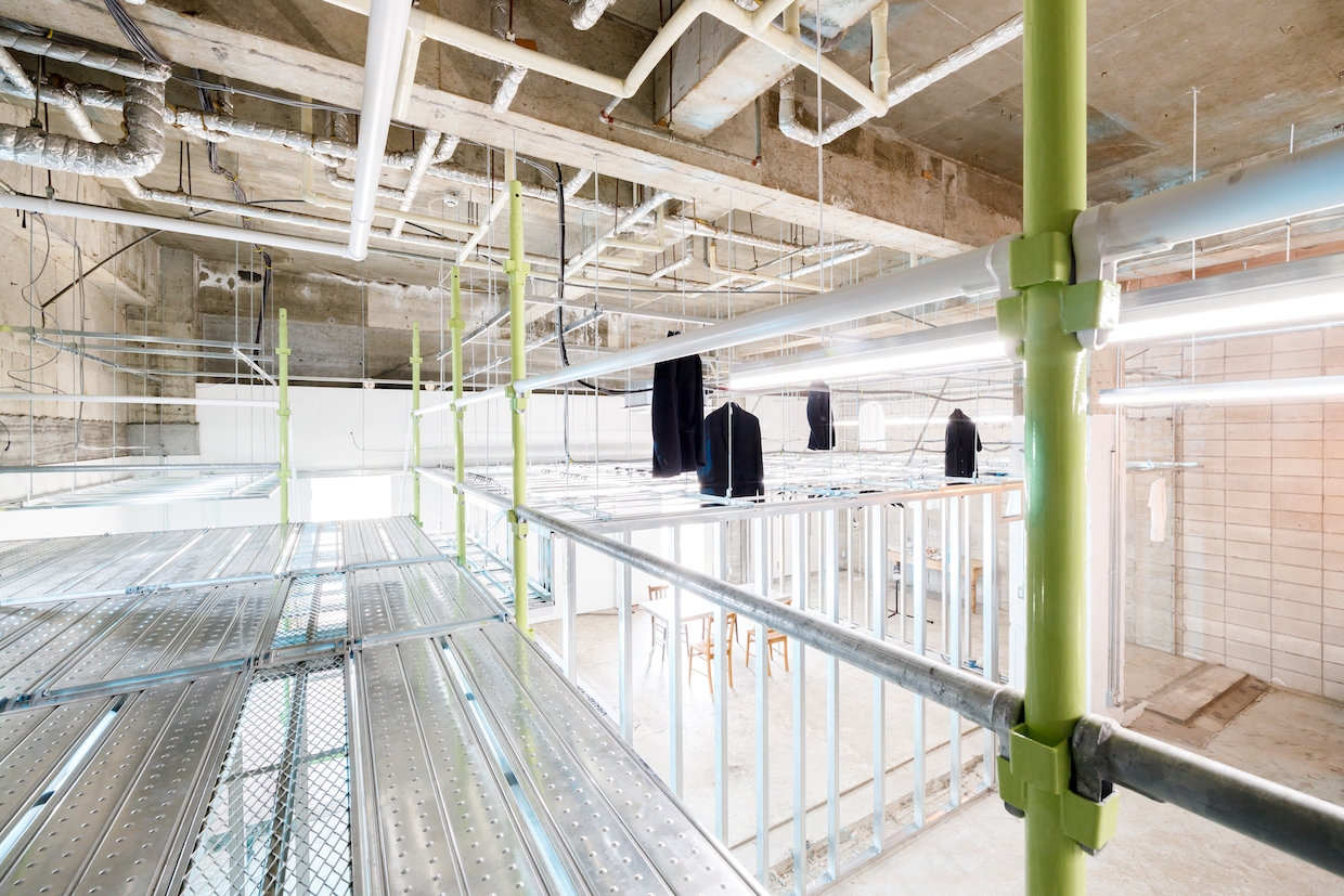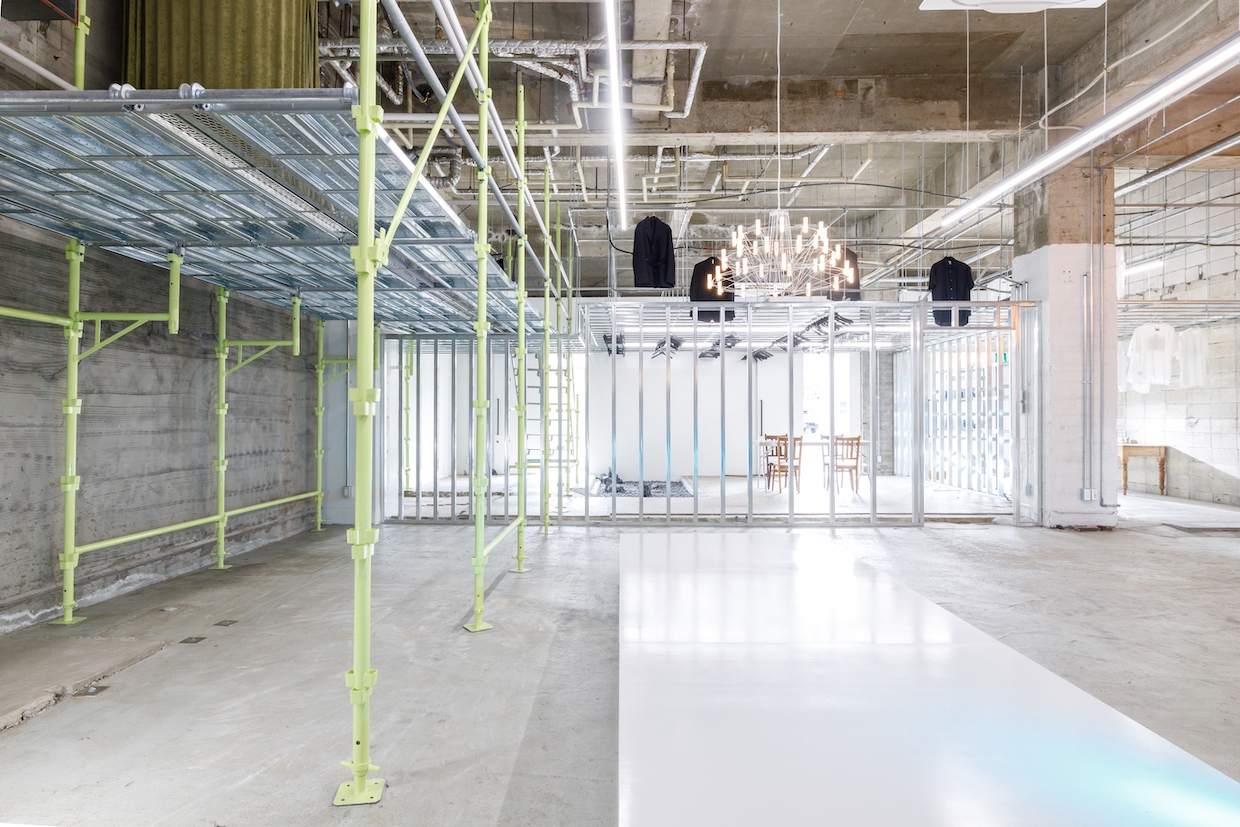 The property chosen for the relocation had been in a skeleton state from the outset, so there was a slight tension in the space. In order to maintain this tension and express the ACRMTSM atmosphere, all partitions in this design are constructed entirely from LGS, with no PB or other materials attached. The walls were constructed based on the concept of slightly varying the pitch of the studs, so that the range of view changes depending on the angle of view. In addition, as the ceiling of the space was extremely high, scaffolding was installed as a mezzanine floor and the space above the ceiling was also used as a display for clothes. By incorporating scaffolding, which had previously only been used as a temporary construction material, the ruggedness of the space stands out and is now recognised as a new material for the interior. The space created by these new challenges has a high affinity with the image of the apparel brand and highlights the specificity of the brand and products in a more creative way.