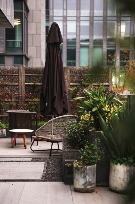 Furthermore, the terrace design incorporates elements such as plants, sand, and gravel that were recycled from the previous construction site, minimizing construction material waste as much as possible.