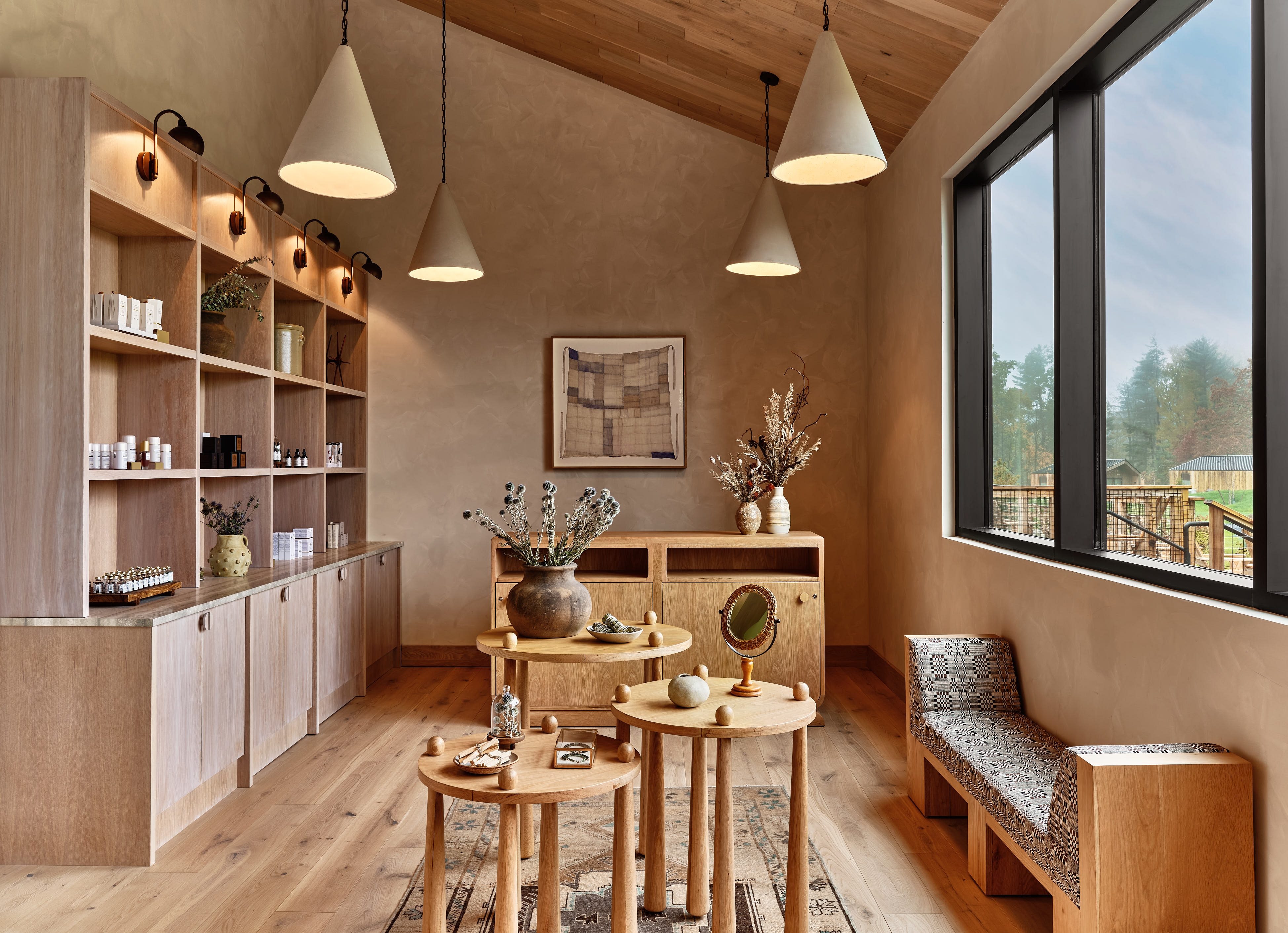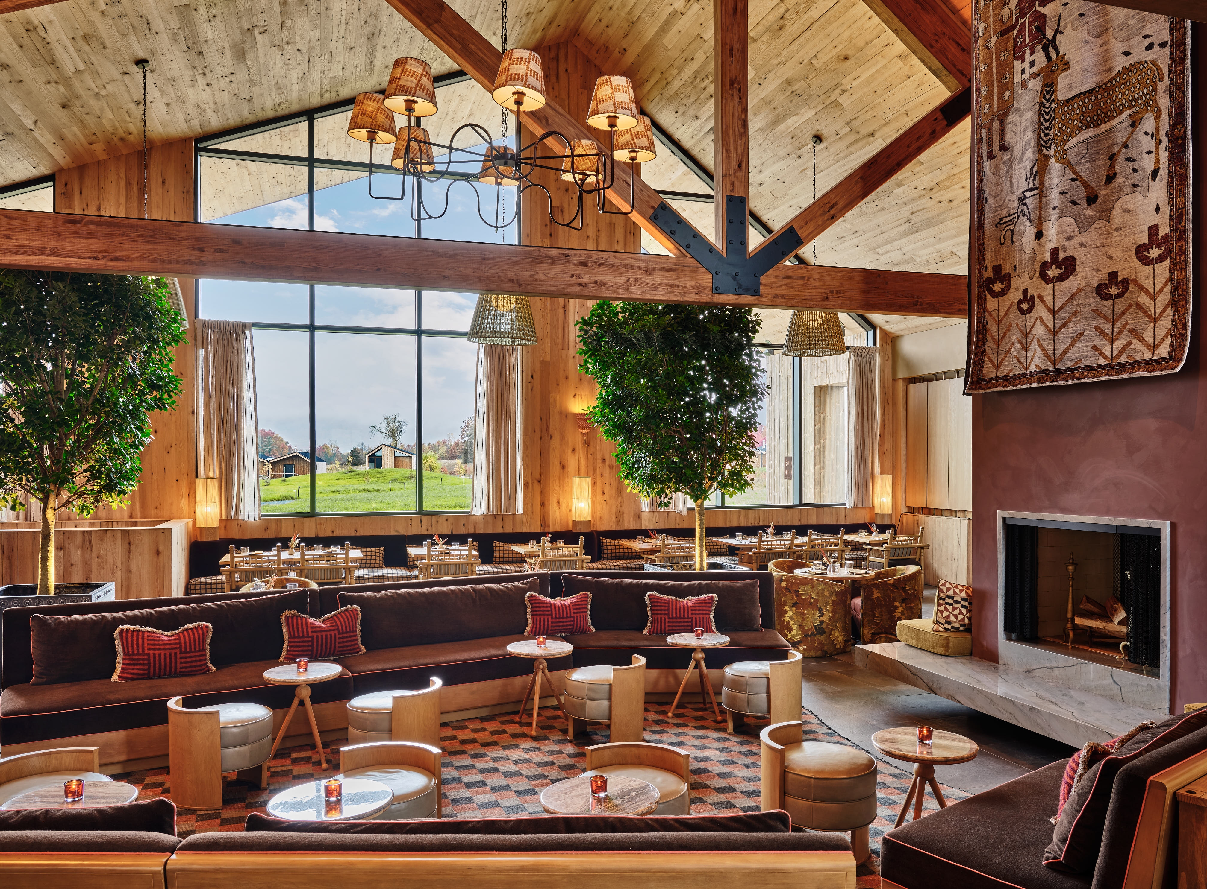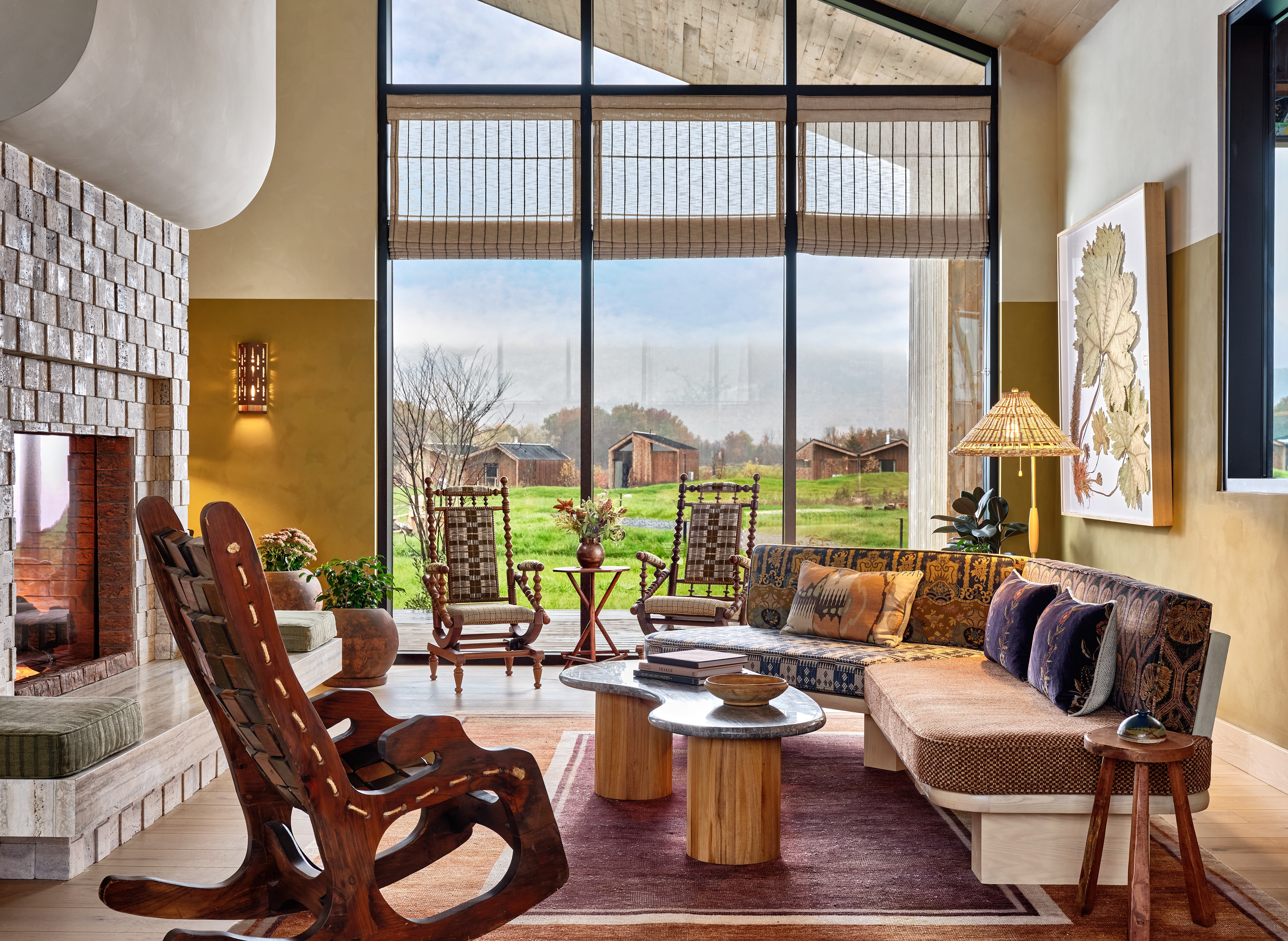 Wildflower Farms is an Auberge Resorts Collection property on 140 acres in Gardiner, New York, featuring 65 bespoke accommodations set amongst the natural landscape of the Hudson Valley. In concepting the interiors, the designers looked to the surrounding area, past and present, as an entry point - visiting local artisans, antique shops and walking the property to familiarize themselves with vegetables being planted to be used in the restaurant, even colonizing mushrooms. This led to an extremely inspired creative process. The architecture of the hotel is inspired by a long tradition of Swiss & Dutch design, tailored to the specific site and programmatic requirements. With a modern take on the vernacular building typologies of farmhouse and barn, the asymmetrical structures were designed to frame the surrounding mountains. The material palette is composed to complement this and create a more direct connection with nature and a rich backdrop for the interiors. Many of the furniture pieces were influenced by antiques found locally and the designers custom-designed over 450 unique pieces for the project - furniture, lighting, rugs and fabrics.