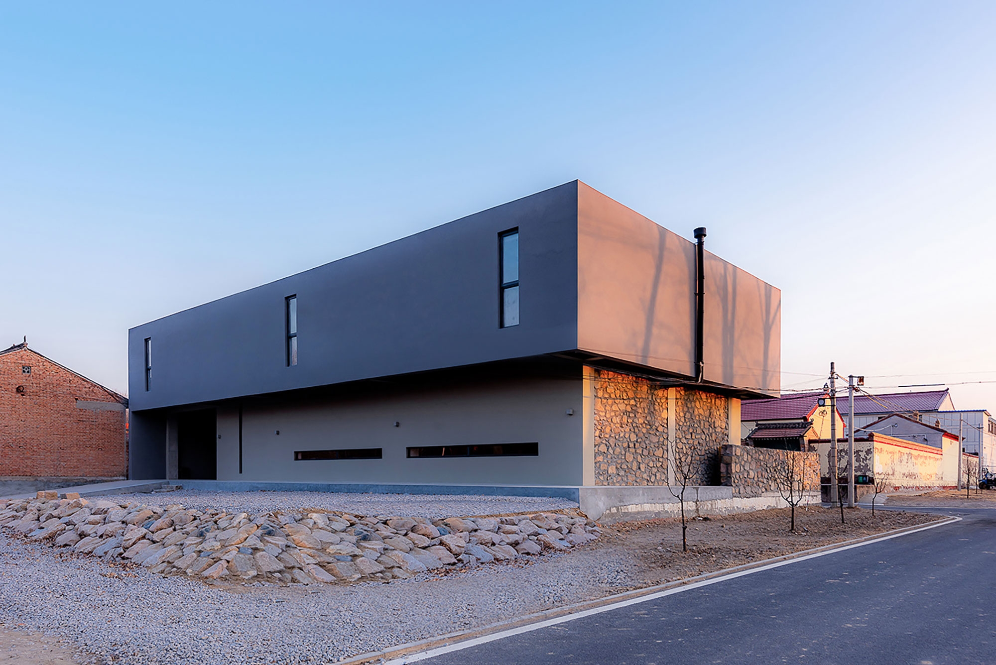 We use simple box form to layout whole architecture, then grabs earthy tones form surrounding landscapes. Although the building is in modern design language, it blends in with Chinese remote countryside building well.