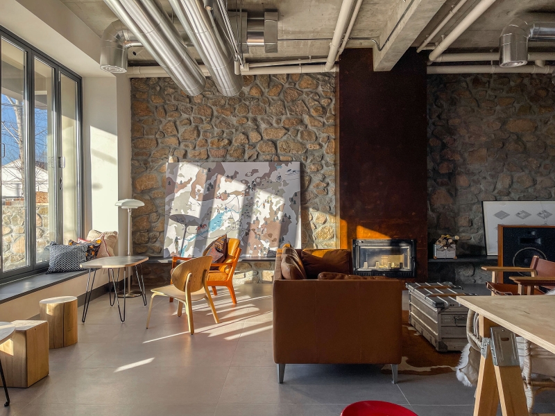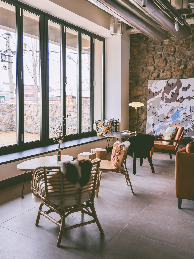 We hied local mason to laid all the feature wall by using local sand stone. It has the fantastic property of make the building breath. We leant that from local the stone wall will absorb humidity when the air is wet, and radiate heat out when cold at night. Every material selection in the space when try to be authentic. There will not be timber pattern ceramic tiles of that sorts. Every illustration in space either we paid for patent or we drawn them ourself.