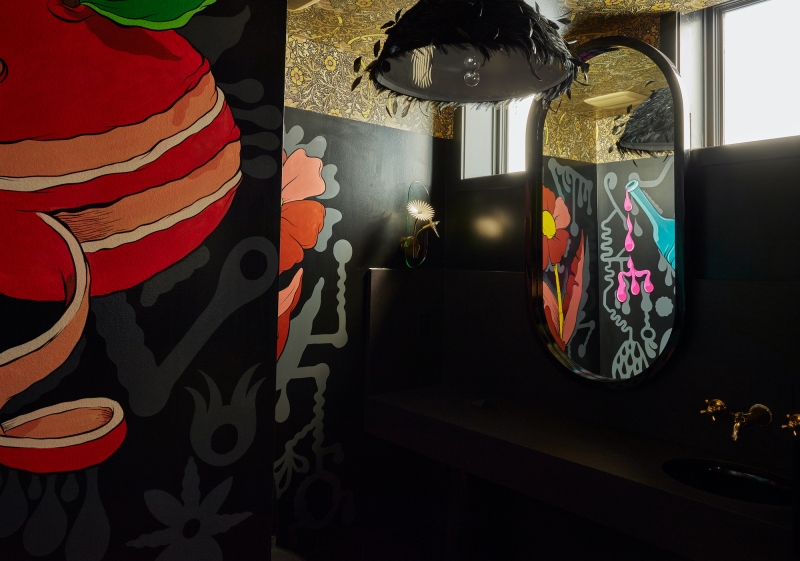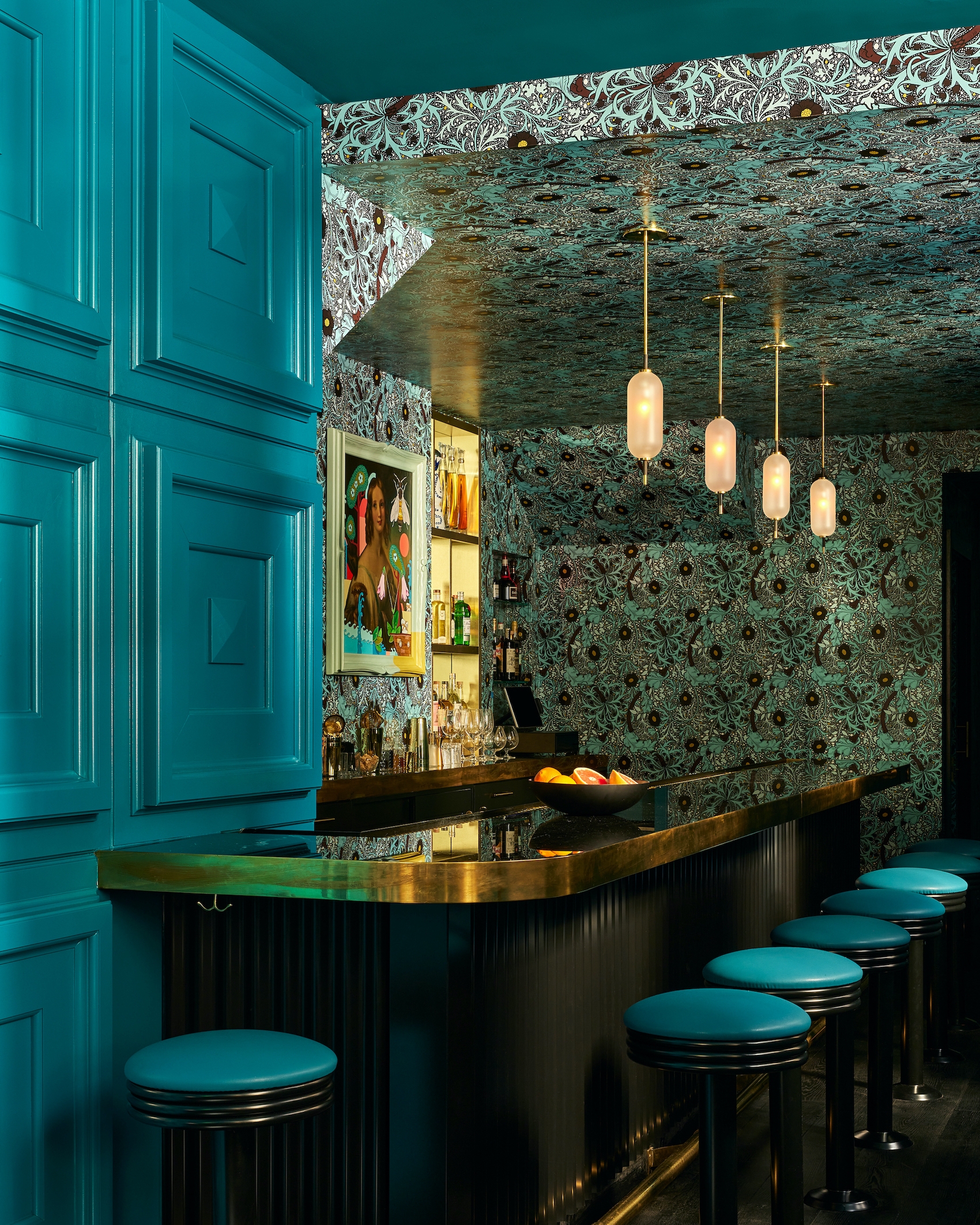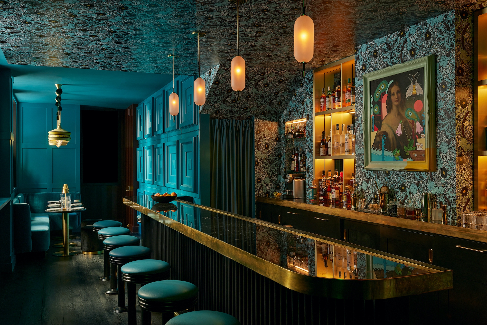 Andra Hem is a two story cocktail lounge in a townhouse located in Philadelphia's Rittenhouse Square. 'Andra Hem' means ‘second home’ in Swedish. The historical background of the area translated into a fictional storyline and inspiration for the project, given that a number of Swedish farming families were sent over by the King to break ground. As history goes, they worked with the Lenape Tribe on farming land. The ?design ?narrative was specific to the place and architecture of the building. ?The collective goal was for? it to ?be ?cozy and special, but not worn or old like an old library or saloon or tavern?. It? is meant to feel strong, feminine and given the history of the area, Swedish/Scandinavian design became a natural reference The designer traveled to Sweden at the beginning of the project for inspiration and sourcing. Both floors were designed to have a deep, jewel toned palette, infused with bold patterns to give it a sophisticated yet playful feel.? ?Andra Hem also sounded like a woman's name and the?y pictured this woman running this B&B. There's a portrait that represents Andra above the bar and they wanted everyone to have the feeling that you are in Andra’s home.