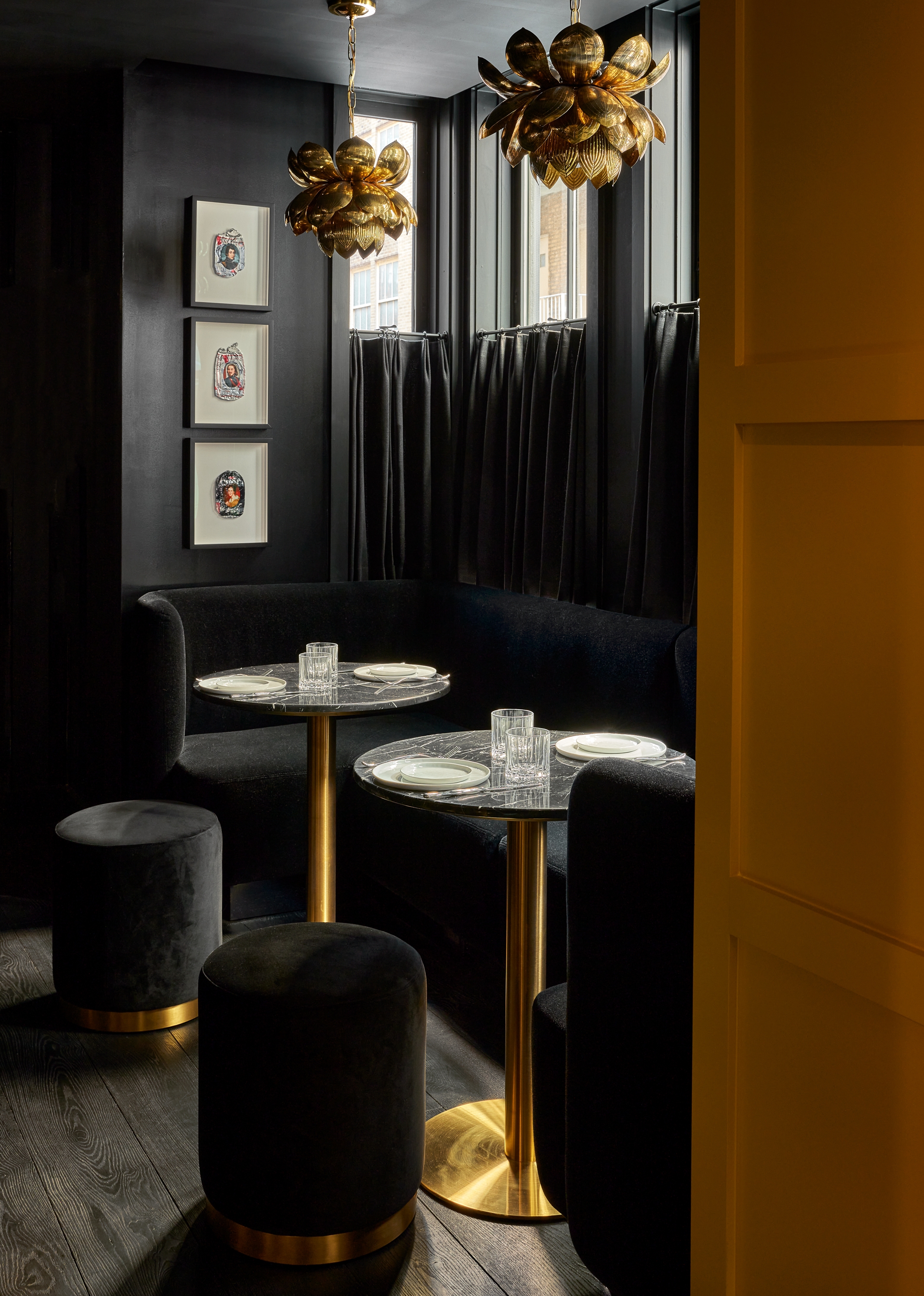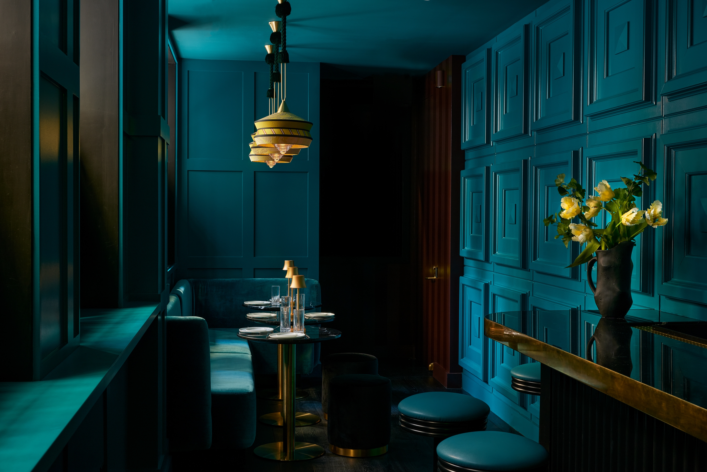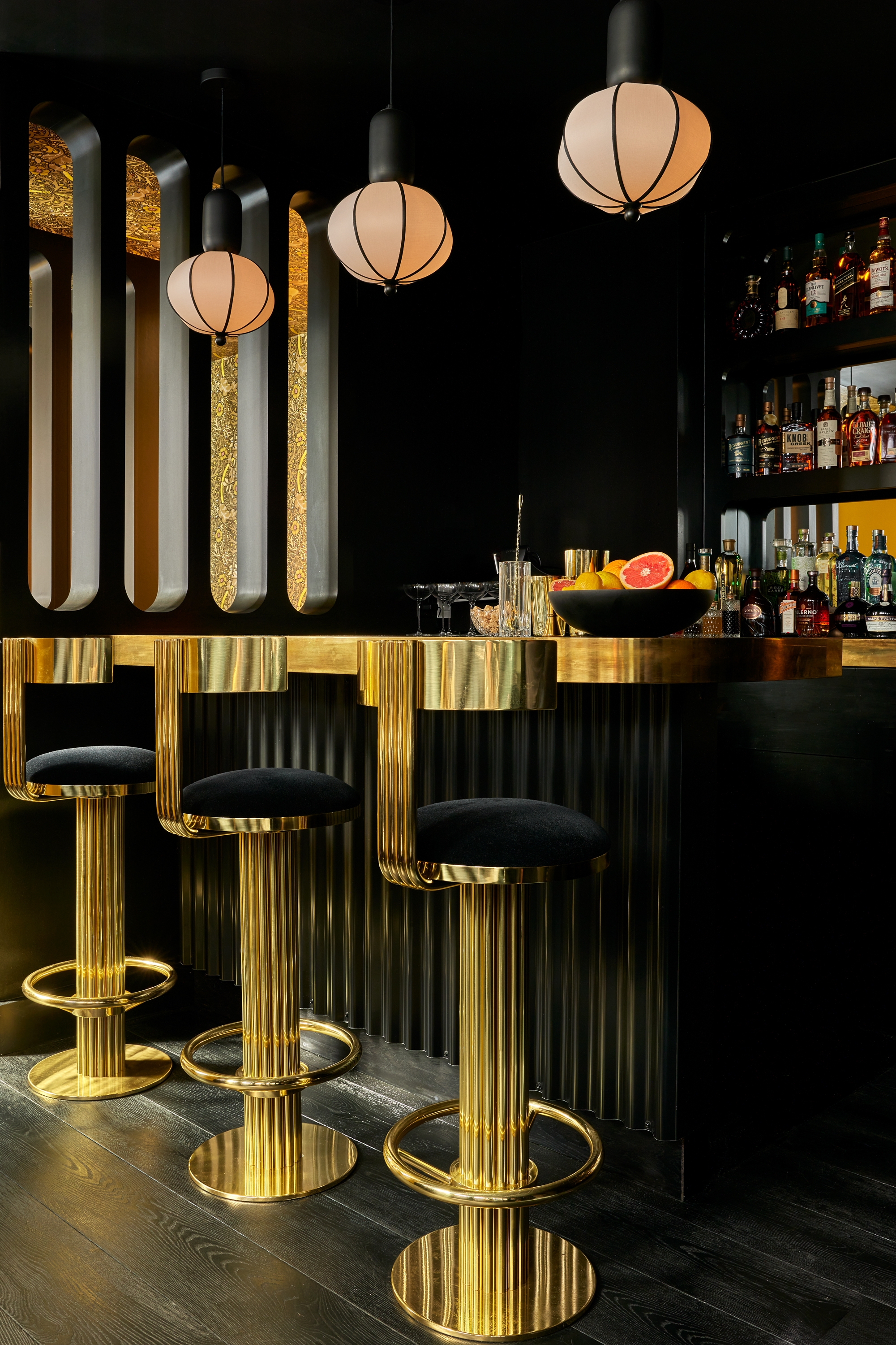 Andra Hem is a two story cocktail lounge in a townhouse located in Philadelphia's Rittenhouse Square. 'Andra Hem' means ‘second home’ in Swedish. The historical background of the area translated into a fictional storyline and inspiration for the project, given that a number of Swedish farming families were sent over by the King to break ground. As history goes, they worked with the Lenape Tribe on farming land. The ?design ?narrative was specific to the place and architecture of the building. ?The collective goal was for? it to ?be ?cozy and special, but not worn or old like an old library or saloon or tavern?. It? is meant to feel strong, feminine and given the history of the area, Swedish/Scandinavian design became a natural reference The designer traveled to Sweden at the beginning of the project for inspiration and sourcing. Both floors were designed to have a deep, jewel toned palette, infused with bold patterns to give it a sophisticated yet playful feel.? ?Andra Hem also sounded like a woman's name and the?y pictured this woman running this B&B. There's a portrait that represents Andra above the bar and they wanted everyone to have the feeling that you are in Andra’s home.