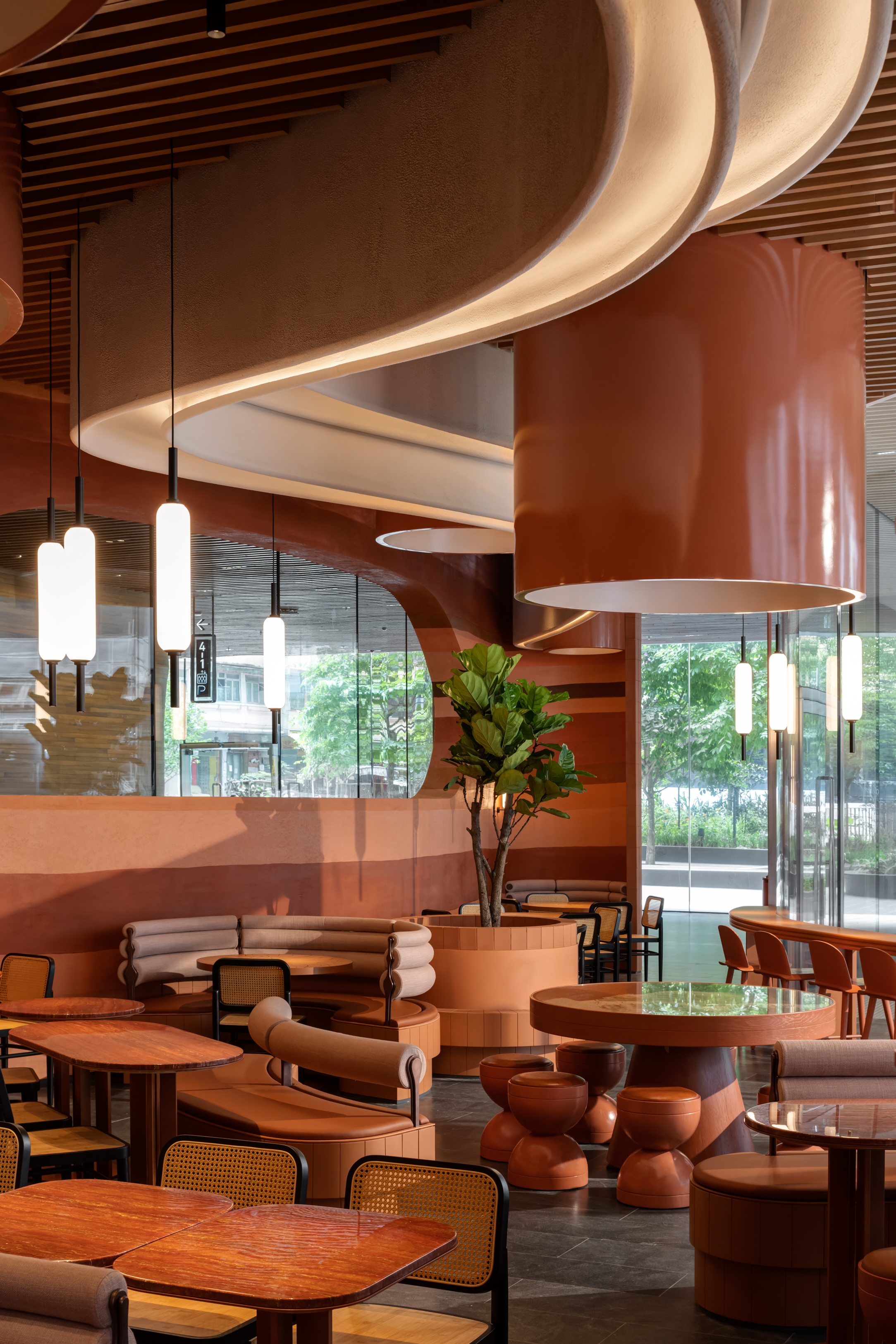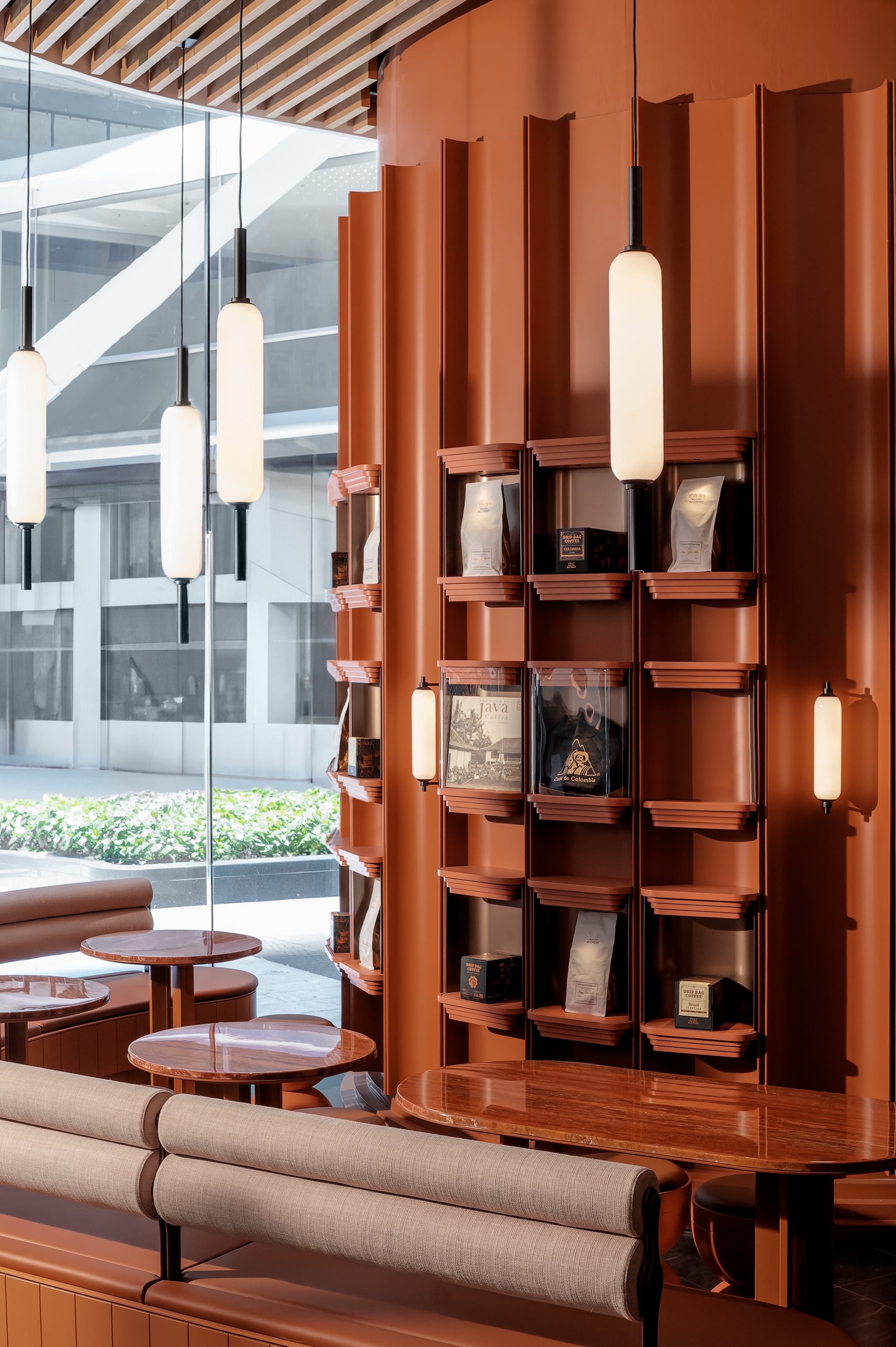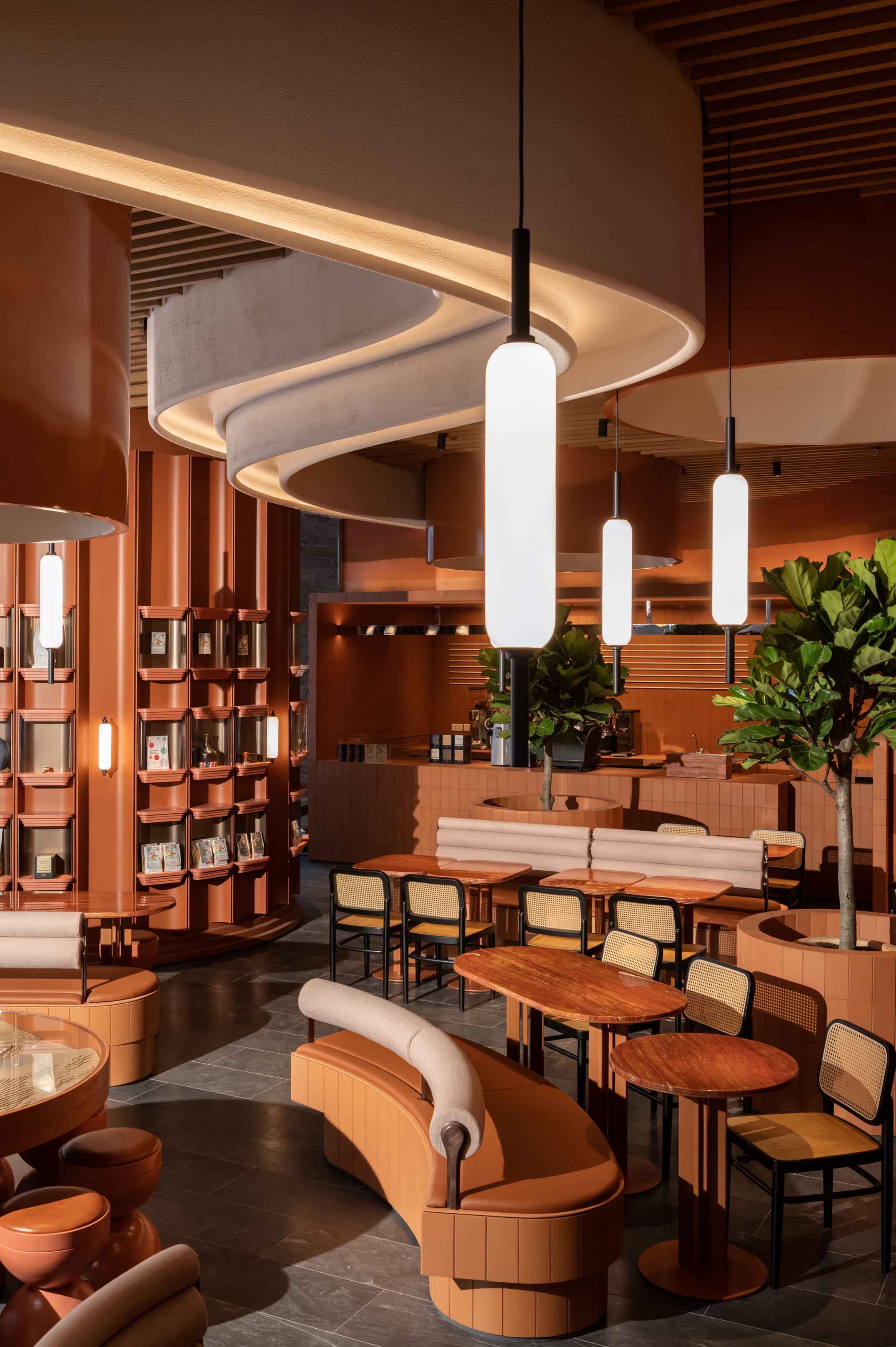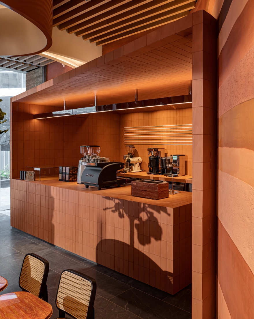 At the end of the space, an intentionally rectilinear coffee bar contrasts with the general curves to symbolize the science behind artisanal coffee making.
