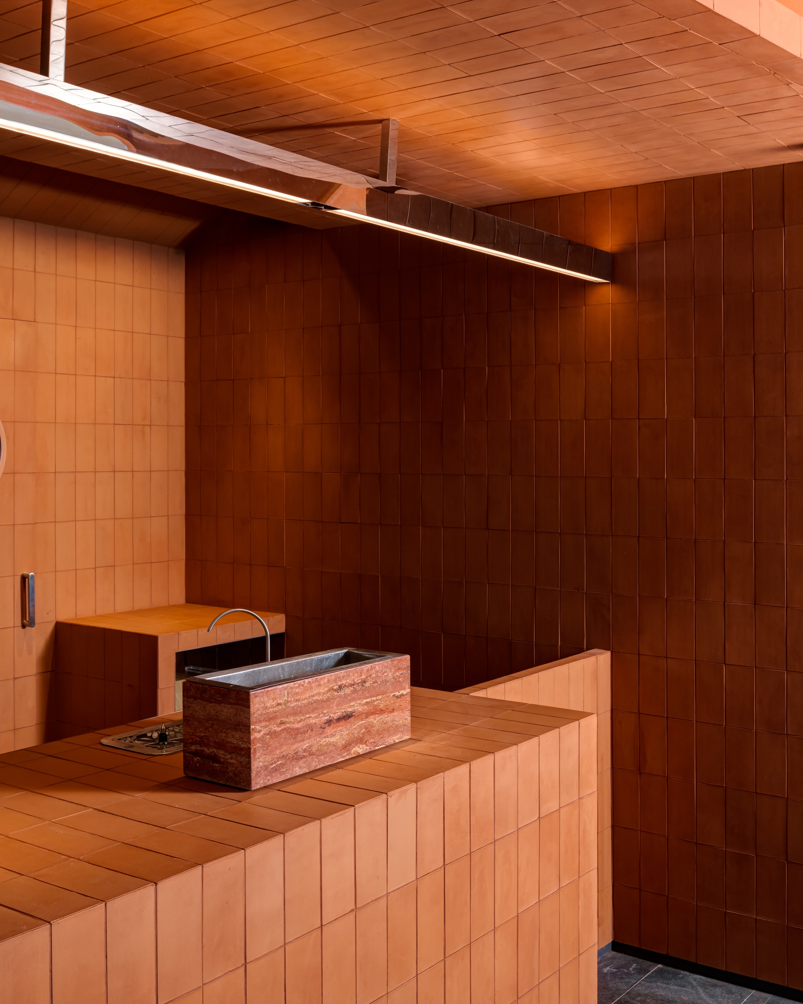 Nestled between a commercial A-grade lobby and an urban courtyard, the design utilizes carefully sculpted elements, dramatically positioned to synchronize with a challengingly shaped site. These curved elements are finished in a collection of wonderfully rich materials including terracotta tile, Venetian plaster to simulate rammed earth, carefully selected fabric, red travertine and an array of earth-red textured millwork.