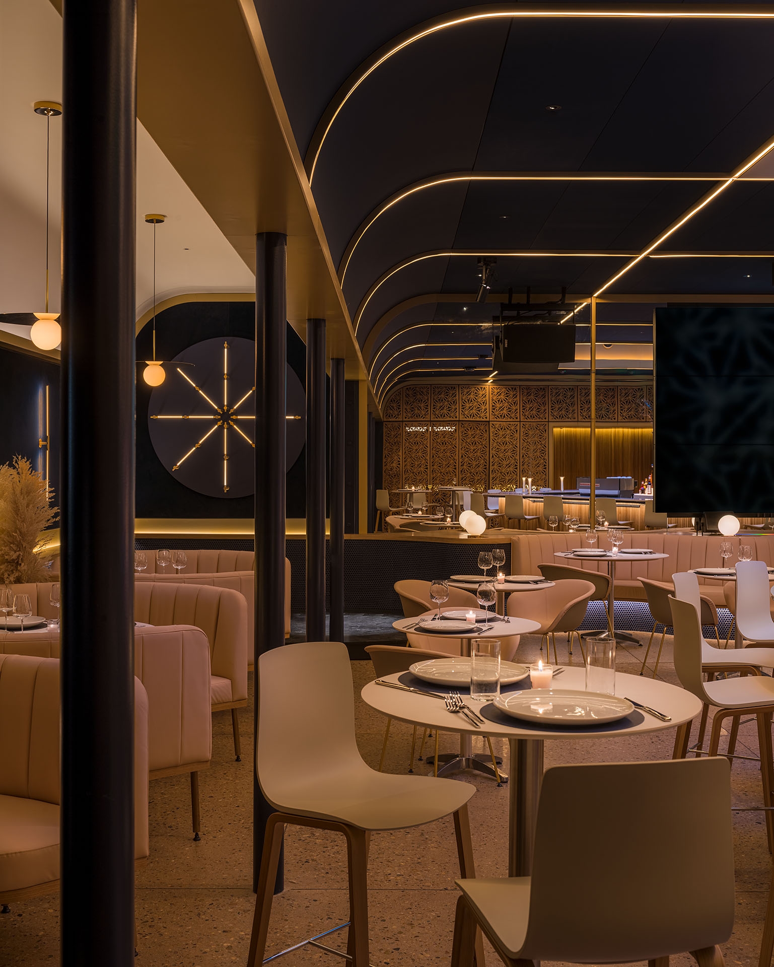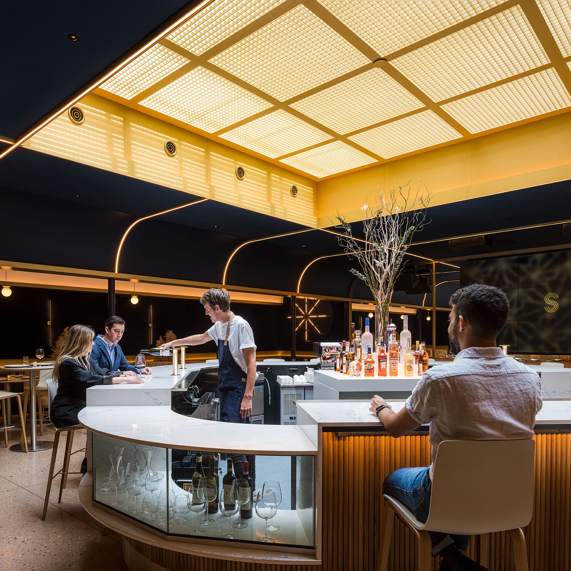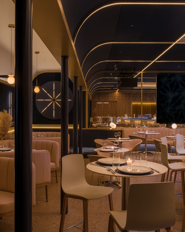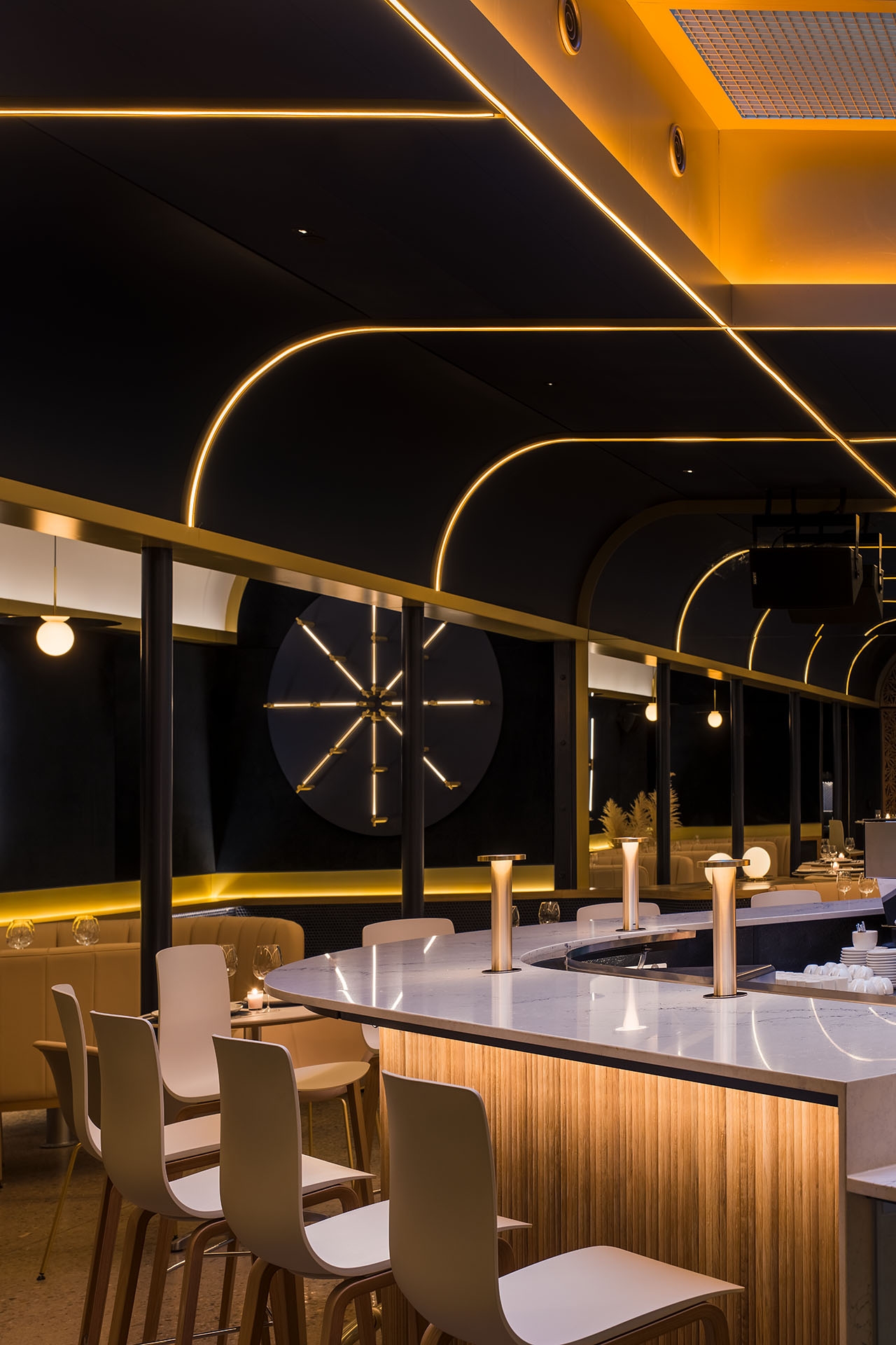 Originally conceived as a cannabis lounge, Stella’s Cucina sits in the core of a new commercial building facing Boulder’s Historic District. When entering the building an existing a brick wall reflects on the opposite mirrored wall escorting the guests to the interior. In the lobby, an oak wall with a check-in window awaits the visitors, where an unseen bouncer cards the guests. From there, a hidden wooden door reveals a dark corridor, where the host welcomes the visitors and walks them through a compressed and dimmed space with wood walls. Inside a squared dinning room with a massive 16´x 16´ centered skylight, the light is filtered through a golden aluminum egg crate. Below, a 45 degree rotated bar with curved corners, welcomes and invites the guests onto the perimeter tables. This entrance view emphasizes the grid and allows the guest to have a glimpse of the whole dining room, while the back mirrored wall doubles the whole space, and a large screen wall serves as a digital window. A curved fixed seating is arranged on the perimeter of the square. On the left and right walls, equidistant columns separate the main space from the white vaulted dining areas in the back.