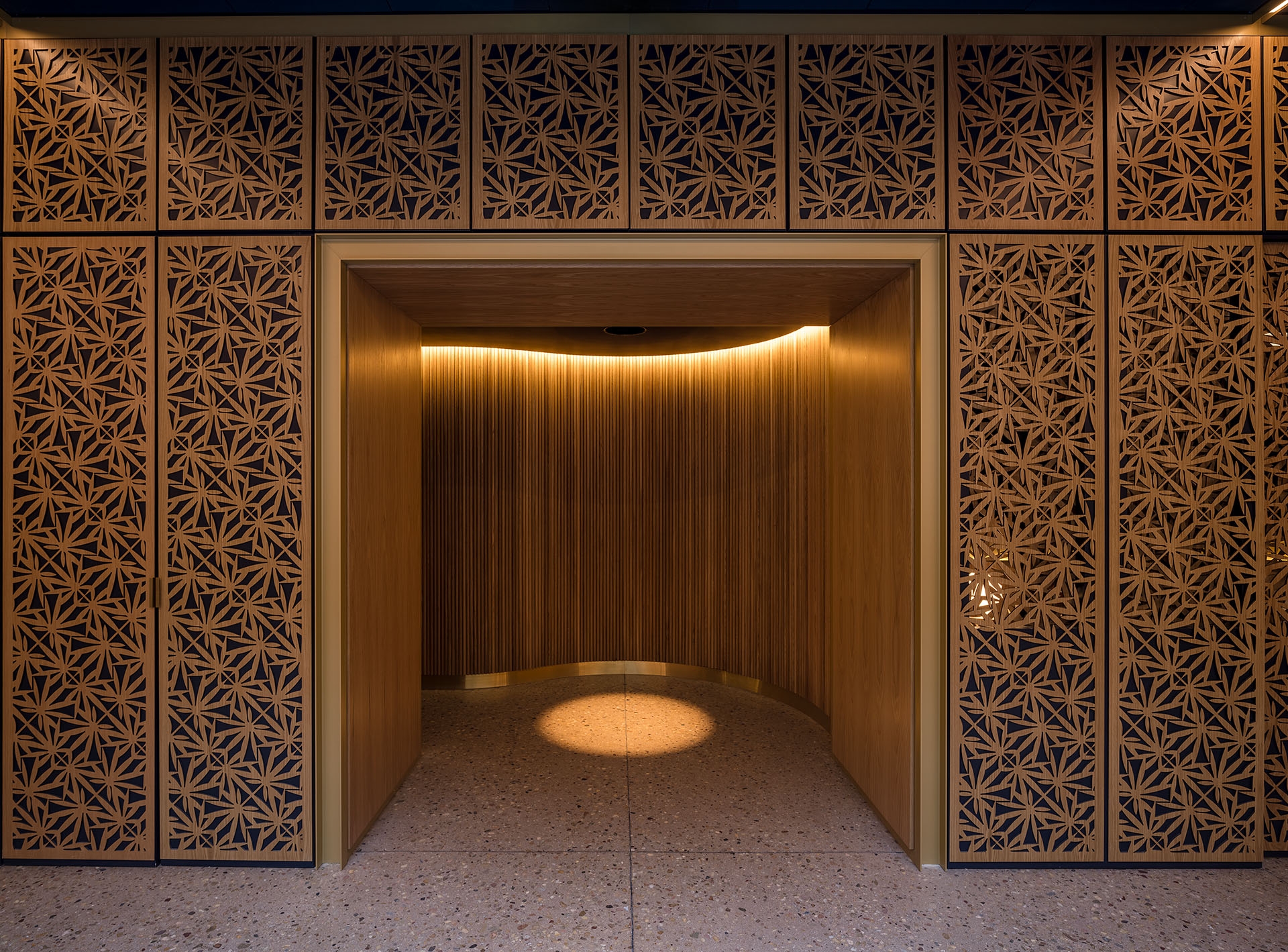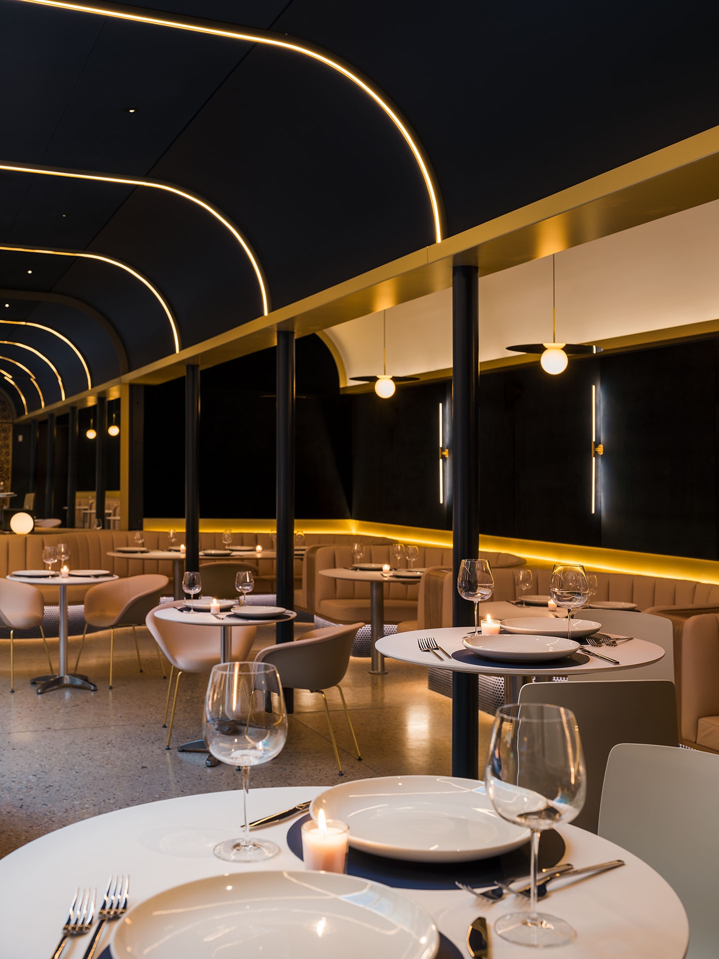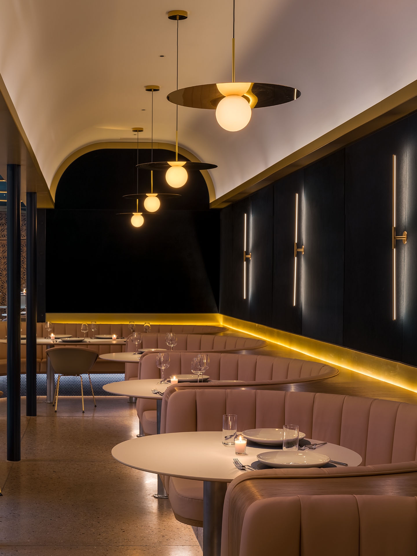 Originally conceived as a cannabis lounge, Stella’s Cucina sits in the core of a new commercial building facing Boulder’s Historic District. When entering the building an existing a brick wall reflects on the opposite mirrored wall escorting the guests to the interior. In the lobby, an oak wall with a check-in window awaits the visitors, where an unseen bouncer cards the guests. From there, a hidden wooden door reveals a dark corridor, where the host welcomes the visitors and walks them through a compressed and dimmed space with wood walls. Inside a squared dinning room with a massive 16´x 16´ centered skylight, the light is filtered through a golden aluminum egg crate. Below, a 45 degree rotated bar with curved corners, welcomes and invites the guests onto the perimeter tables. This entrance view emphasizes the grid and allows the guest to have a glimpse of the whole dining room, while the back mirrored wall doubles the whole space, and a large screen wall serves as a digital window. A curved fixed seating is arranged on the perimeter of the square. On the left and right walls, equidistant columns separate the main space from the white vaulted dining areas in the back.