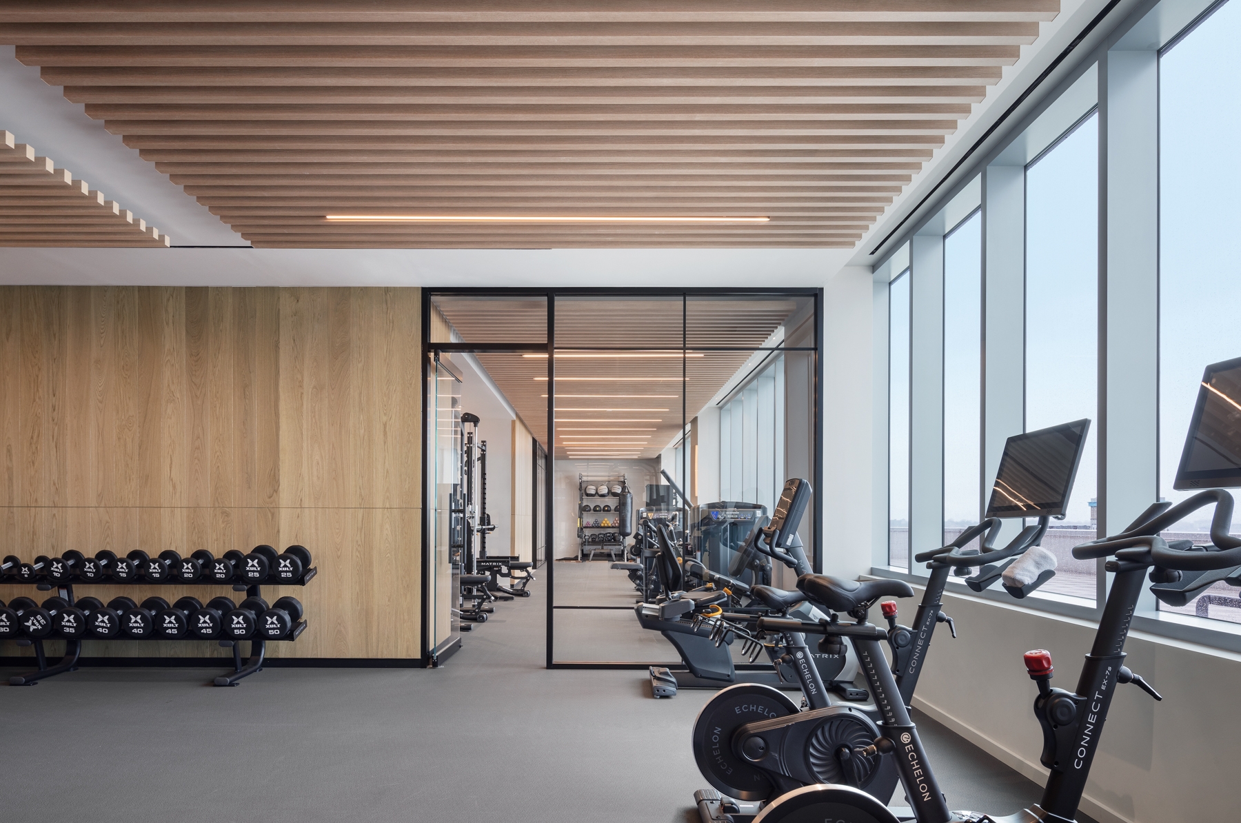 We are pleased to reveal the photos from the final phase of our work on Tangram, F&T’s mega development in Queens, NY. This fitness area serves both the hotel and the residences, and as such had numerous complexities to resolve in its location, access, and adjacencies. Poised above the complex’s elevated garden space, the fitness area enjoys the benefit of natural light, but is far enough away from the hotel rooms and residences to feel like a private space. On the fitness’s area’s West side are fantastic views of Manhattan’s skyline, not to mention glorious sunset views.