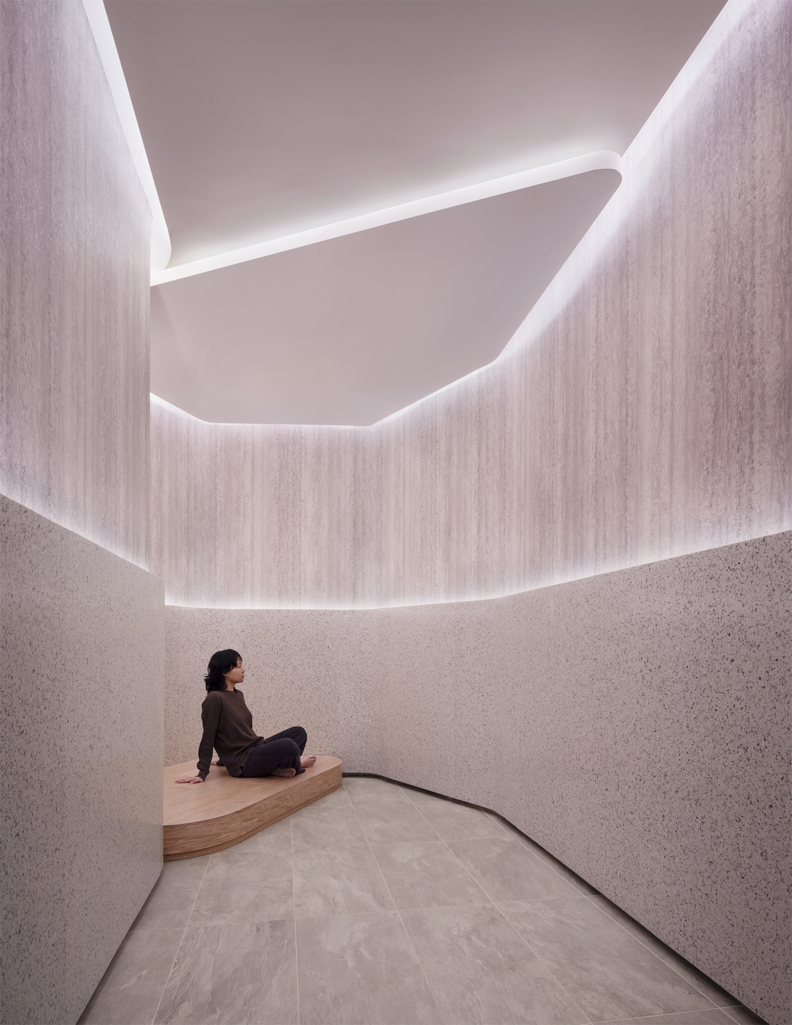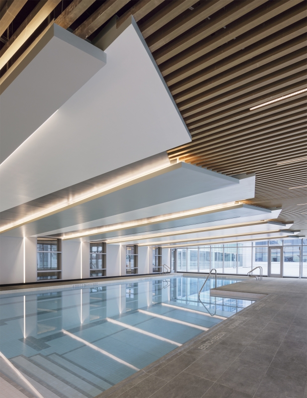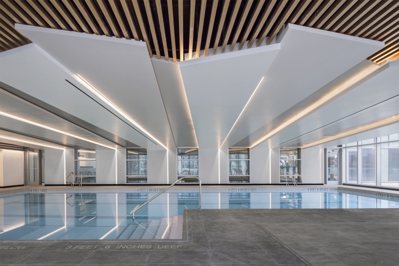 Designs for amenity pools can often feel like an afterthought, having harsh lighting and acoustics not conducive to a calming or pleasing experience. Given these concerns, our mission was to devise an aesthetically pleasing space which would simultaneously alleviate these usual lighting and acoustic challenges. The result was the fan-shaped ceiling which allows for recessed and soft lighting, as well as a space for acoustic waves to be broken up. Lighting reflectivity on the water’s surface is minimized through ambient light coves, and an acoustic plaster solution was proposed for the flat surfaces as well.