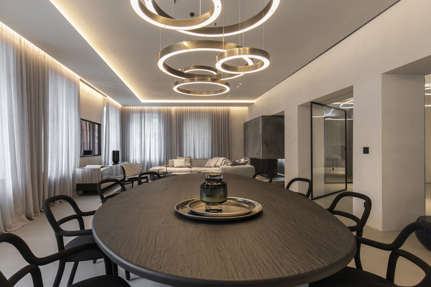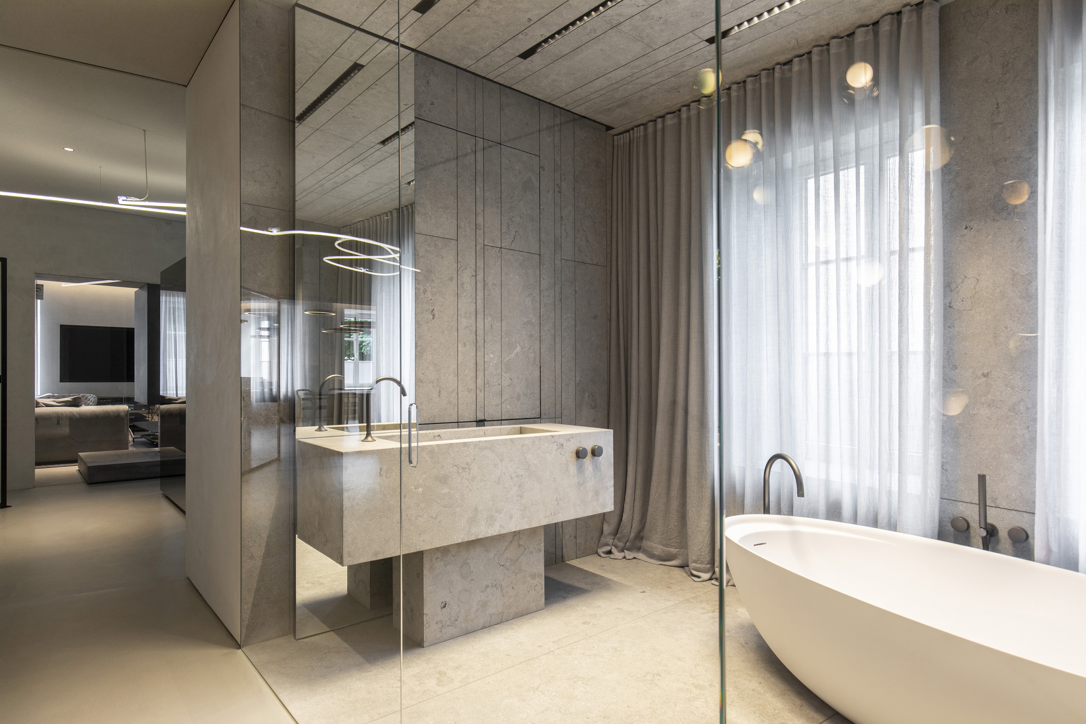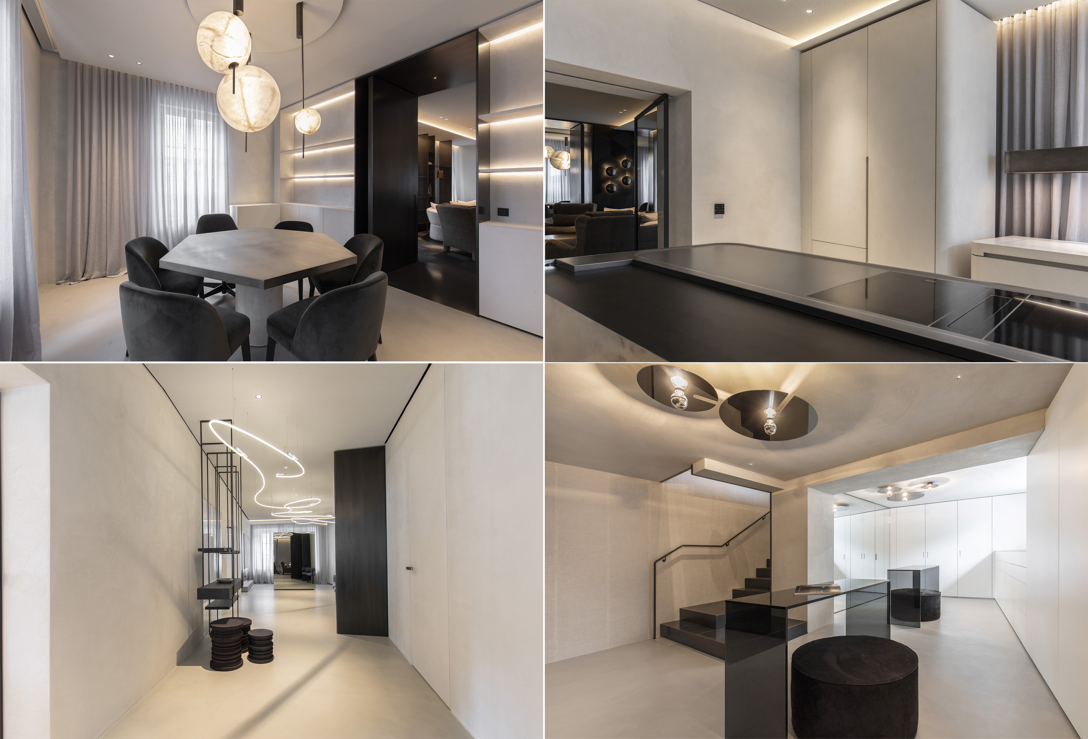 A contemporary loft was created from 2 apartments or 12 individual rooms. Fundamental interventions in the statics were necessary for this, and load-bearing walls were undercut. The apartment was first completely gutted and then brought up to the state of the art in terms of structural engineering from the ground up. Breakthroughs and mergers were made. The basement was connected to the mezzanine through a complex ceiling opening. Historic preservation aspects were of the highest importance in this core renovation of the old building. In 18 months of construction, the rooms were completely refurbished in terms of thermal, acoustic, electrical, and fire protection systems. Now, on 270 square meters, THE STUDIO offers a holistic living atmosphere.