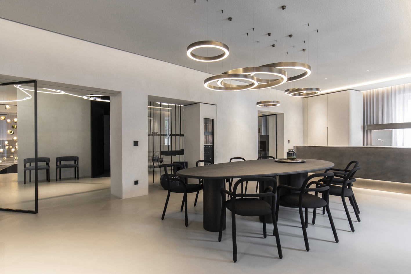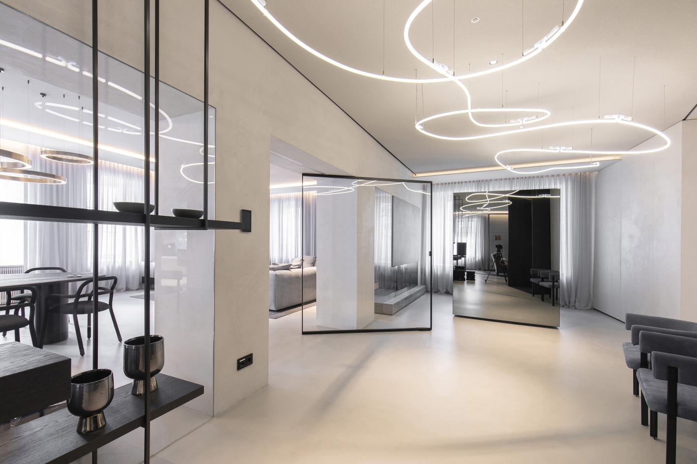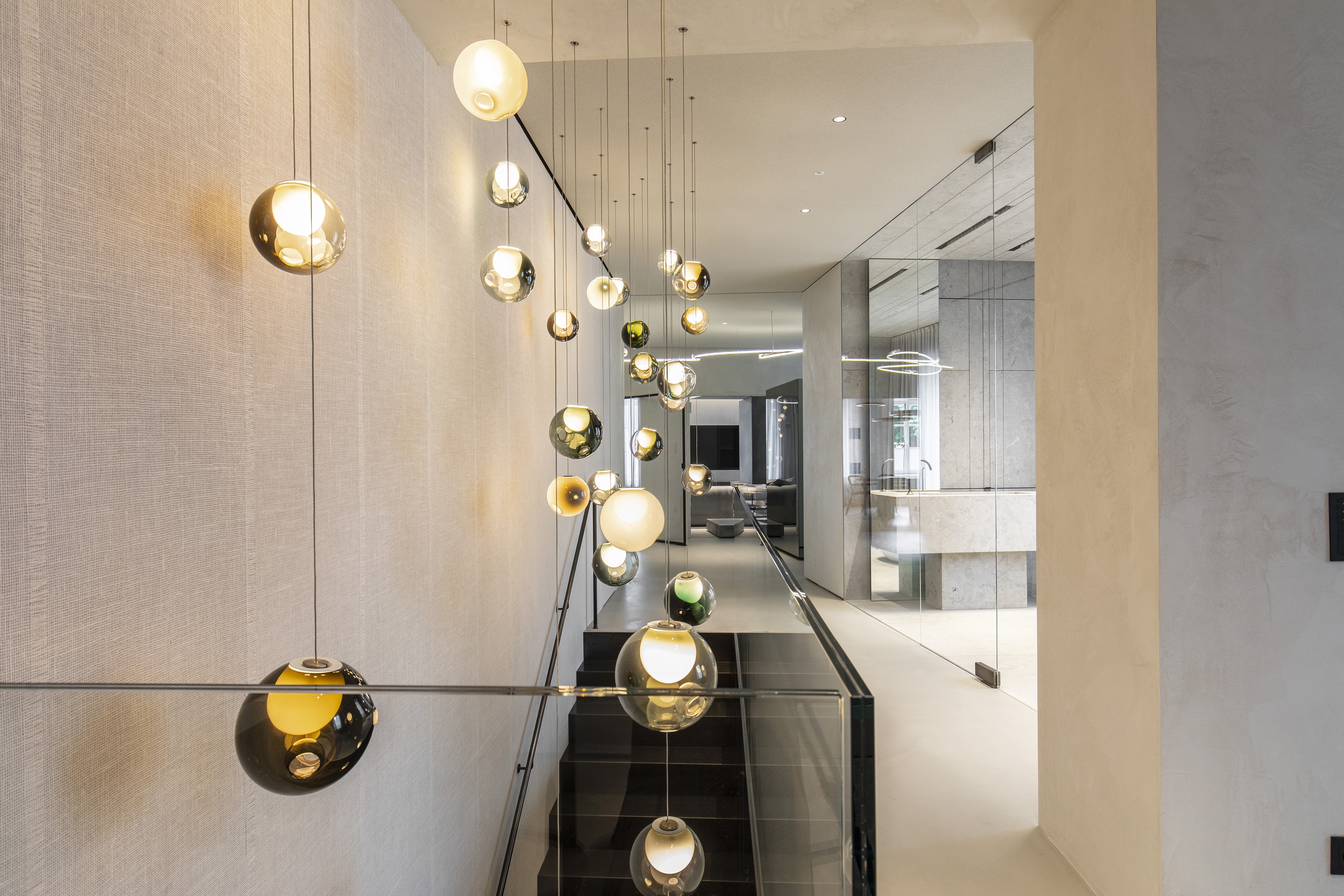 A contemporary loft was created from 2 apartments or 12 individual rooms. Fundamental interventions in the statics were necessary for this, and load-bearing walls were undercut. The apartment was first completely gutted and then brought up to the state of the art in terms of structural engineering from the ground up. Breakthroughs and mergers were made. The basement was connected to the mezzanine through a complex ceiling opening. Historic preservation aspects were of the highest importance in this core renovation of the old building. In 18 months of construction, the rooms were completely refurbished in terms of thermal, acoustic, electrical, and fire protection systems. Now, on 270 square meters, THE STUDIO offers a holistic living atmosphere.