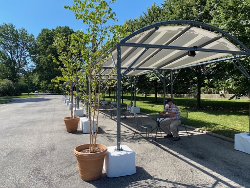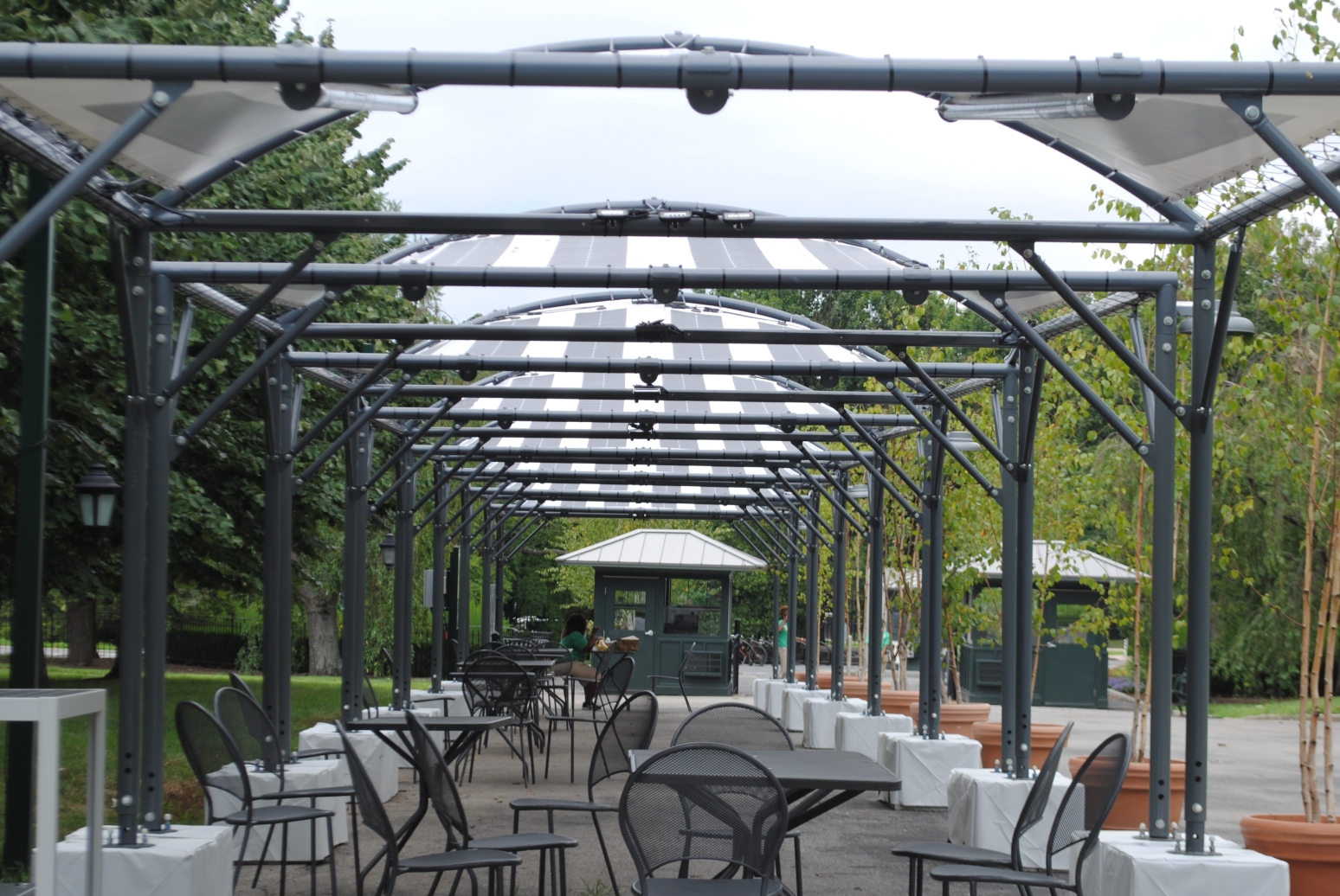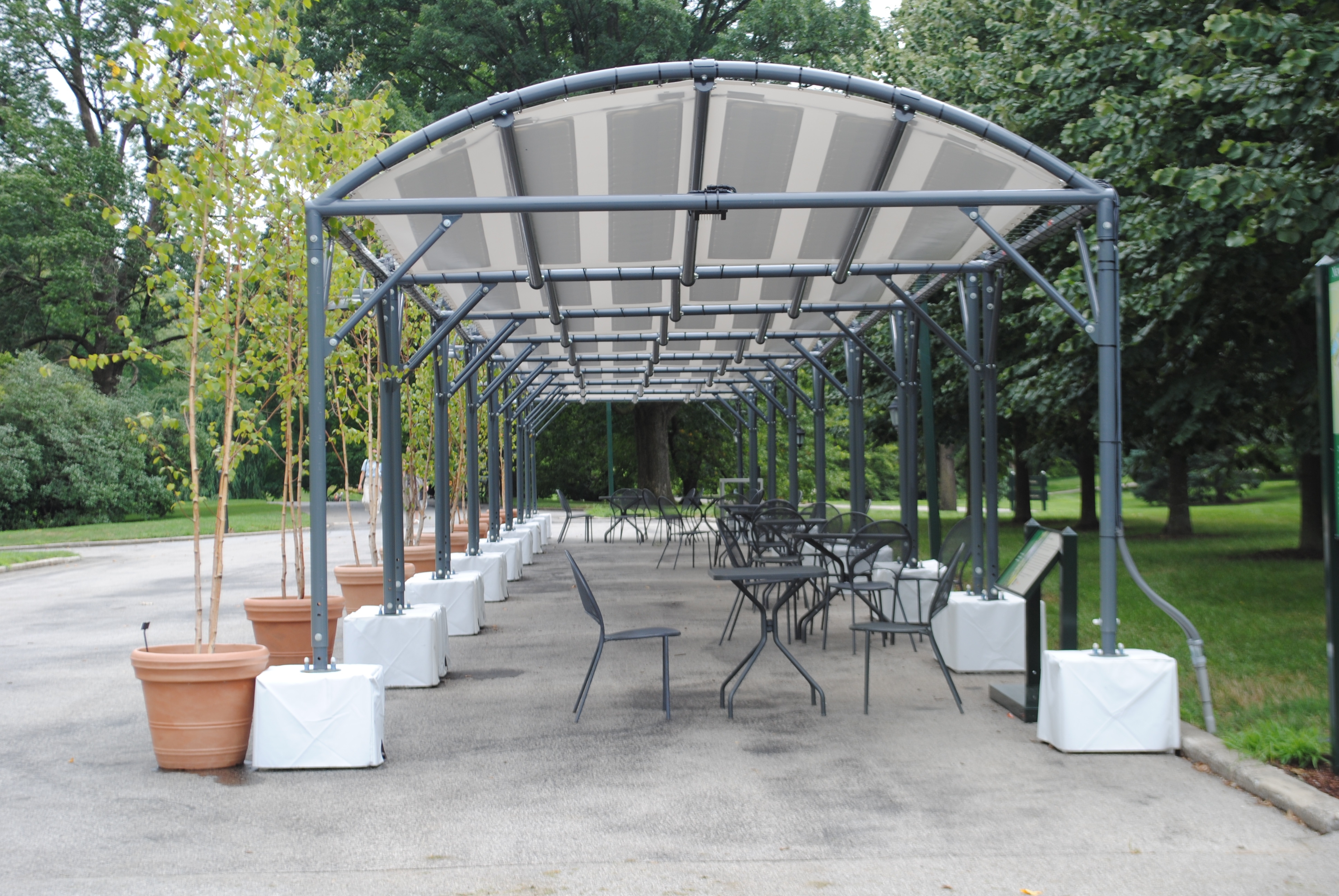 This project included the design and installation of eight outdoor solar powered canopies at the New York Botanical Garden. These large, sturdy canopies were designed to provide the garden with plenty of sheltered outdoor space where visitors can relax in the shade on sunny days, charge their devices, and eat lunch provided by the nearby food trucks. They are strategically placed near the entrance by the food truck area of the garden, where they easy for visitors to find and enjoy.