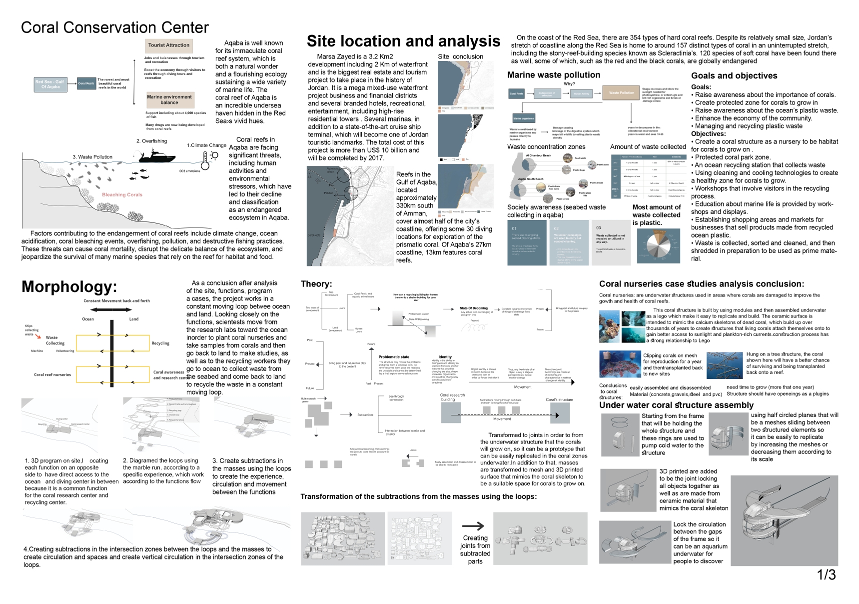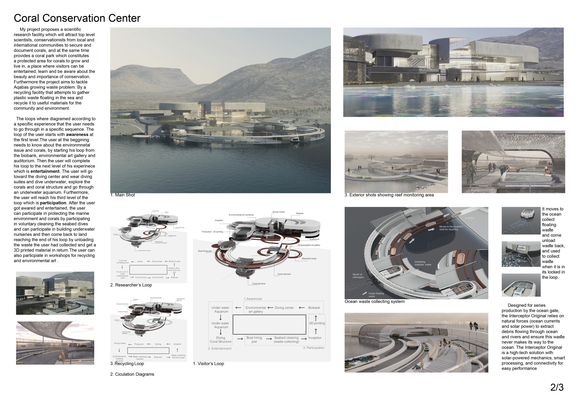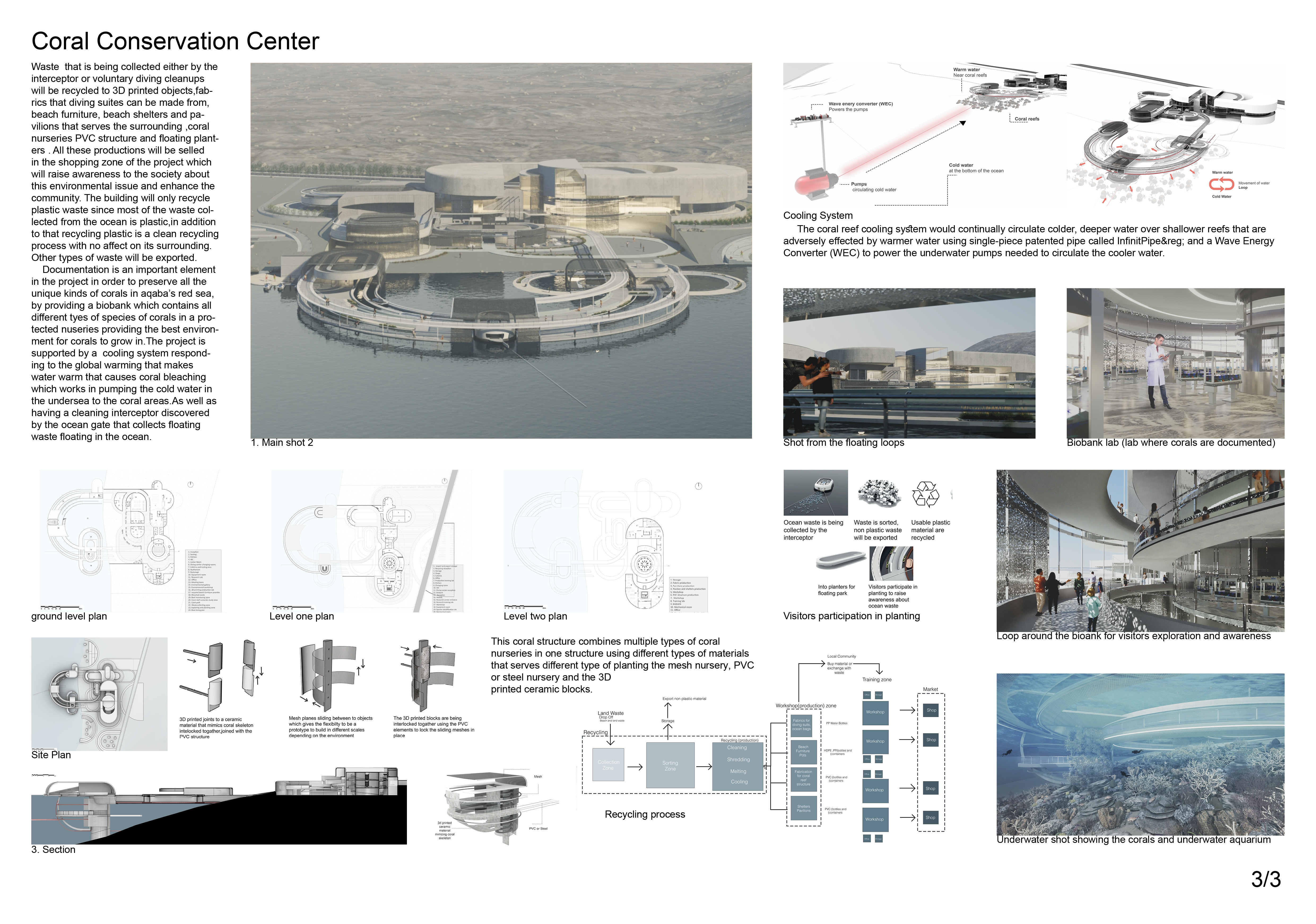 My project proposes a scientific research facility which will attract top level scientists, conservationists from local and international communities to secure and document corals, and at the same time provides a coral park where visitors can be entertained, learn and be aware about the beauty and importance of conservation. The project aims to corals a’s growing waste problem to protect one of Aqaba’s treasures which are the corals. By a recycling facility in the ocean that attempts to gather plastic. waste floating in the sea, which makes up about 65% of all ocean debris, a structure that acts as a habitat for corals and entertainment function.