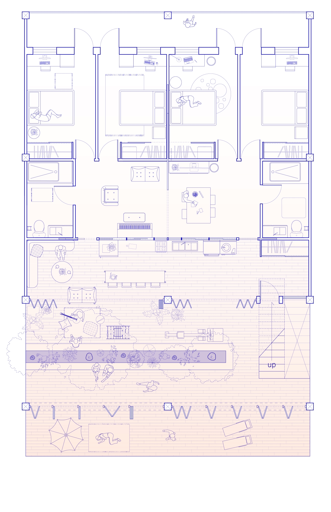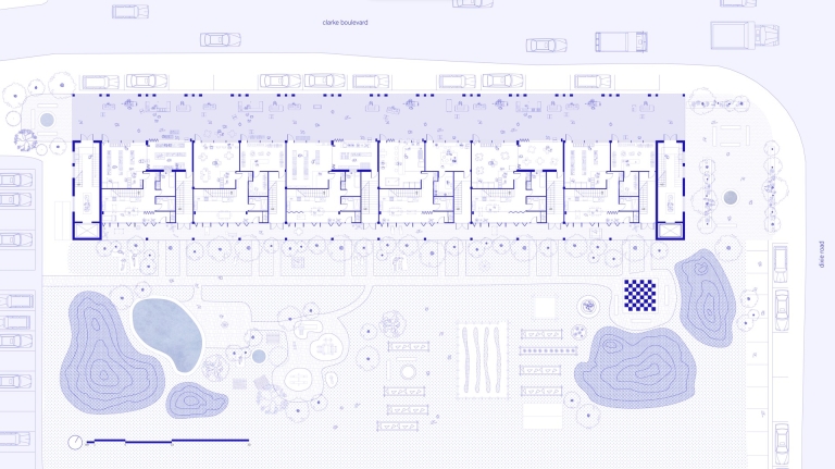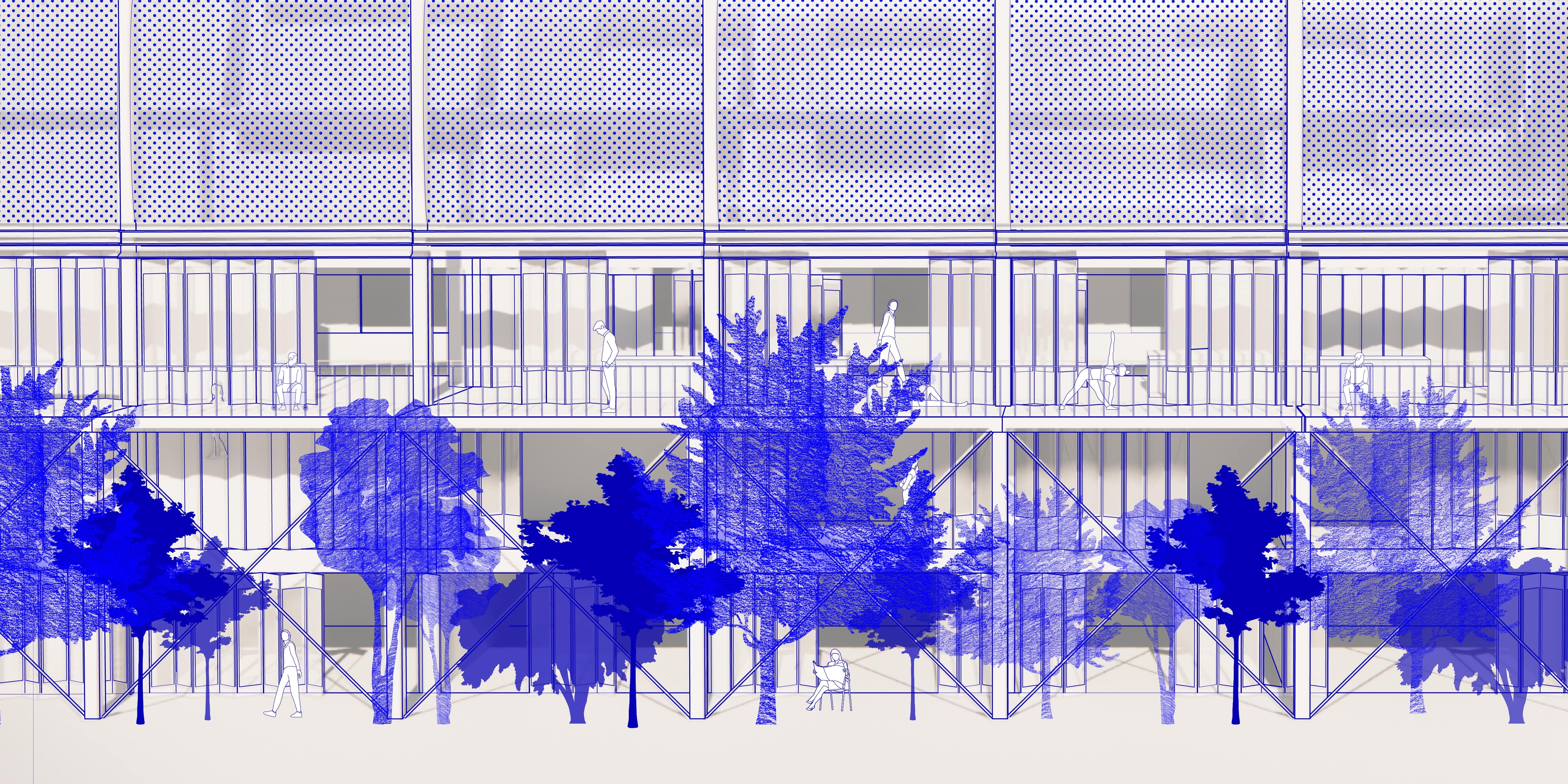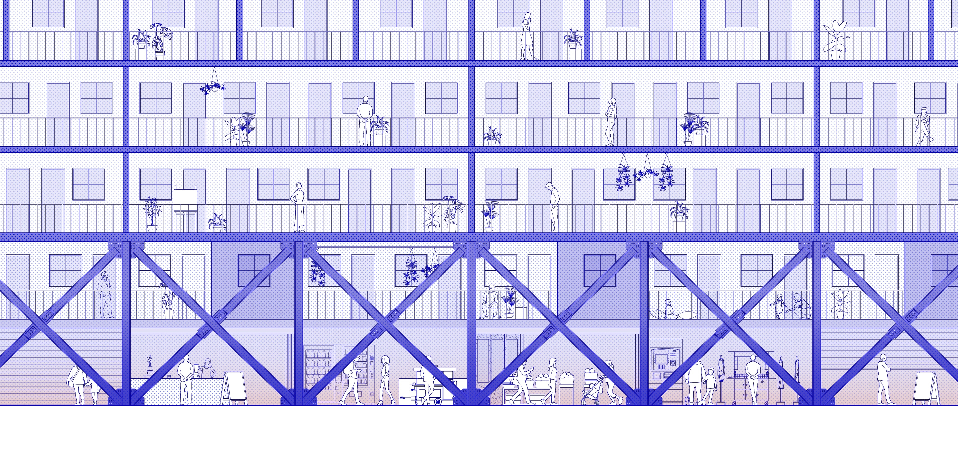 Solar Steps explores how thresholds can reshape relationships between programmatic scales. What architectural interventions can dynamically adapt the circulatory, visual, and auditory porosity between interior and exterior and between domestic and public zones? How can merging and division accommodate changing living arrangements and programmatic permutations? The triple-height greenhouse covers a shared terrace on the south side, which becomes a semi-public, semi-exterior mediator as well as a passive climate strategy. The translucent membrane evokes the outdoors in a space that is habitable year round. Bi-fold doors along the units’ south walls open to expand living rooms into the greenhouse and invite gathering. The retail arcade along the street-facing side joins the building to the urban context. The layering of operable thresholds and inhabited intermediary spaces imagines a dynamic form of collective living where the individual resident’s relationship to their neighbors and to the broader community become simultaneously more connected and more flexible: Agency over where and how to draw the boundary between personal and communal space is given to the residents themselves.