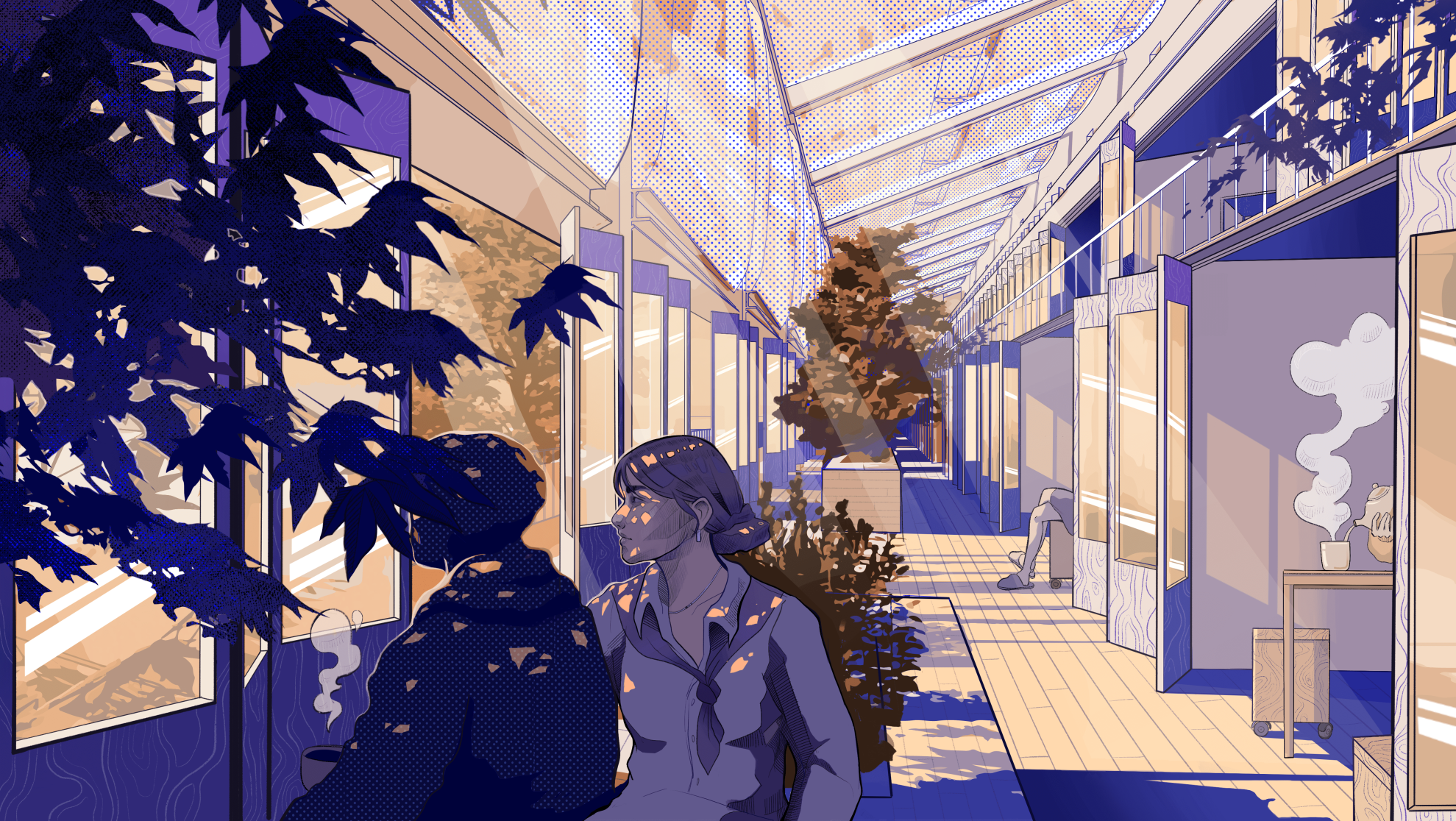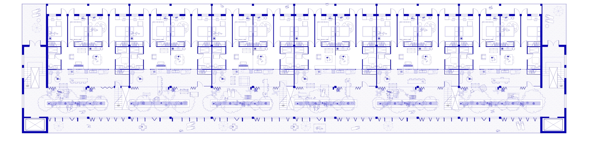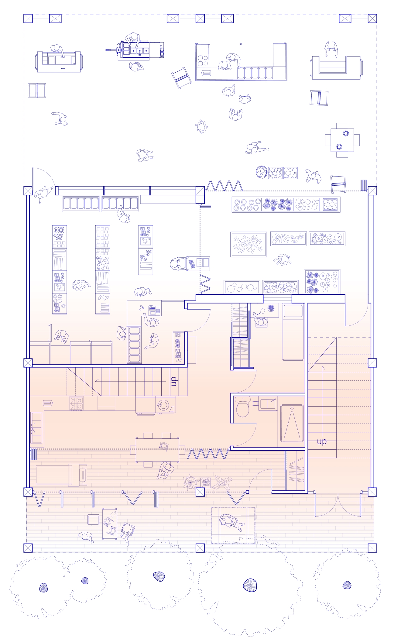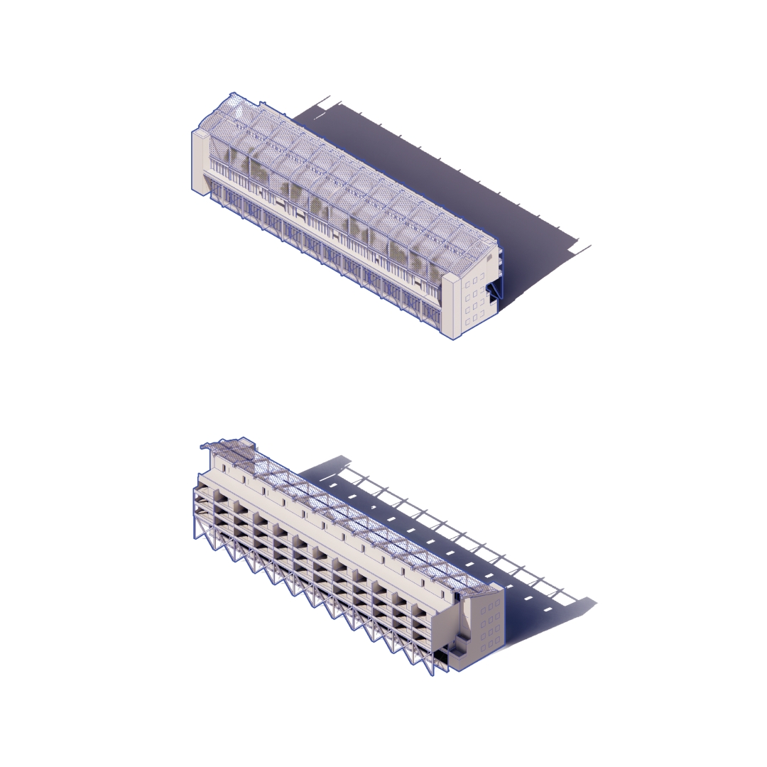 Solar Steps explores how thresholds can reshape relationships between programmatic scales. What architectural interventions can dynamically adapt the circulatory, visual, and auditory porosity between interior and exterior and between domestic and public zones? How can merging and division accommodate changing living arrangements and programmatic permutations? The triple-height greenhouse covers a shared terrace on the south side, which becomes a semi-public, semi-exterior mediator as well as a passive climate strategy. The translucent membrane evokes the outdoors in a space that is habitable year round. Bi-fold doors along the units’ south walls open to expand living rooms into the greenhouse and invite gathering. The retail arcade along the street-facing side joins the building to the urban context. The layering of operable thresholds and inhabited intermediary spaces imagines a dynamic form of collective living where the individual resident’s relationship to their neighbors and to the broader community become simultaneously more connected and more flexible: Agency over where and how to draw the boundary between personal and communal space is given to the residents themselves.