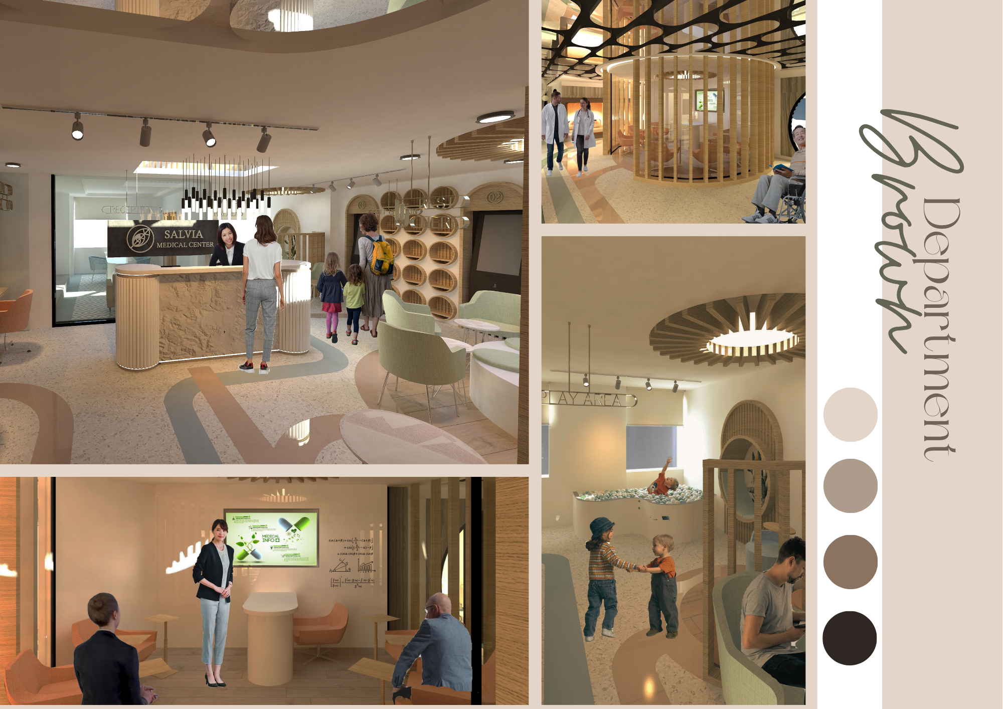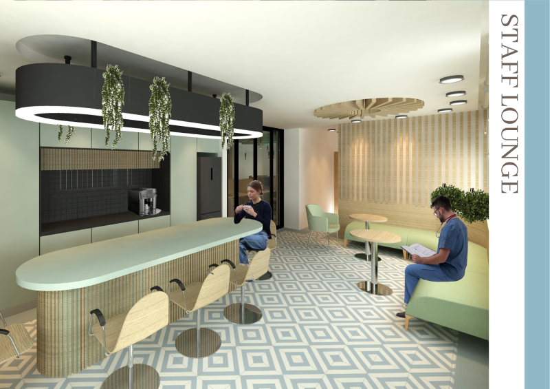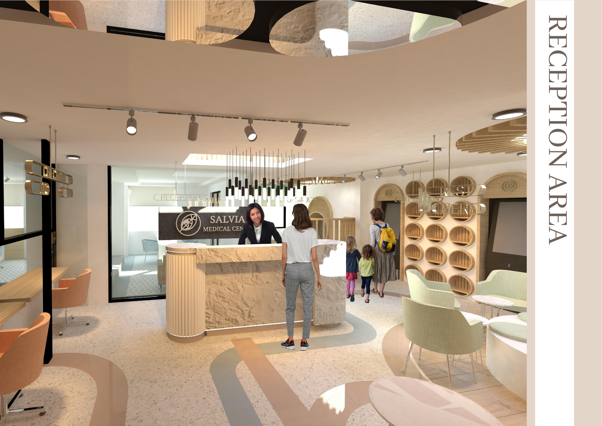 Biophilic design principles inspired the incorporation of natural elements, including colors and materials reminiscent of the salvia plant's health benefits. A soothing palette of pale greens akin to sage promotes tranquility. Earthy curves and timber slats add a natural touch. Blues accentuated wayfinding and staff areas, while patient examination rooms featured vibrant South African wallpaper, mirroring salvia's seasonal flowering hues, providing visual variety.