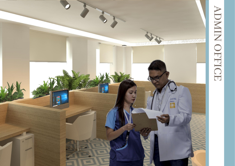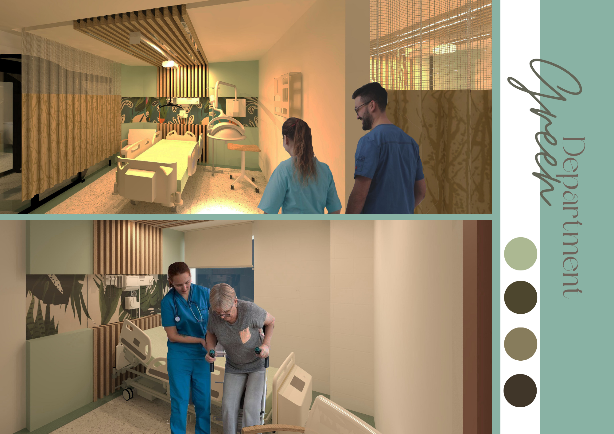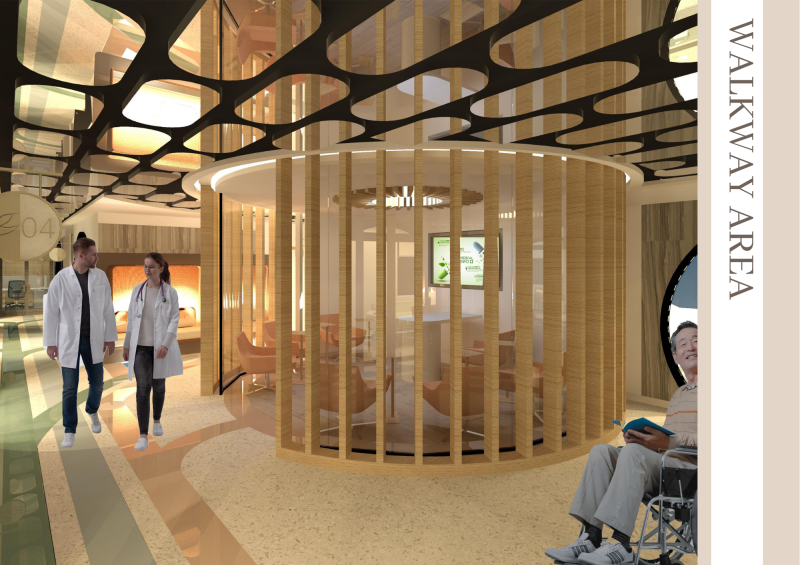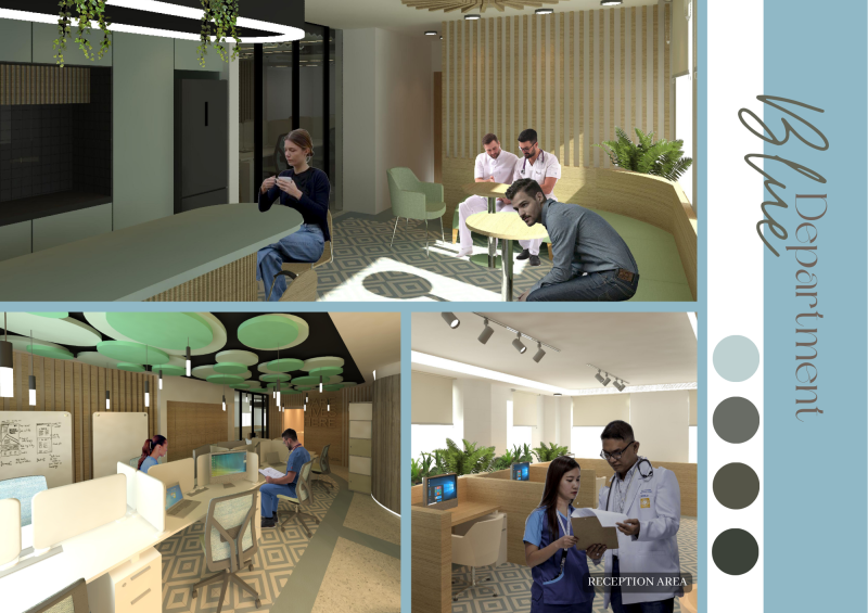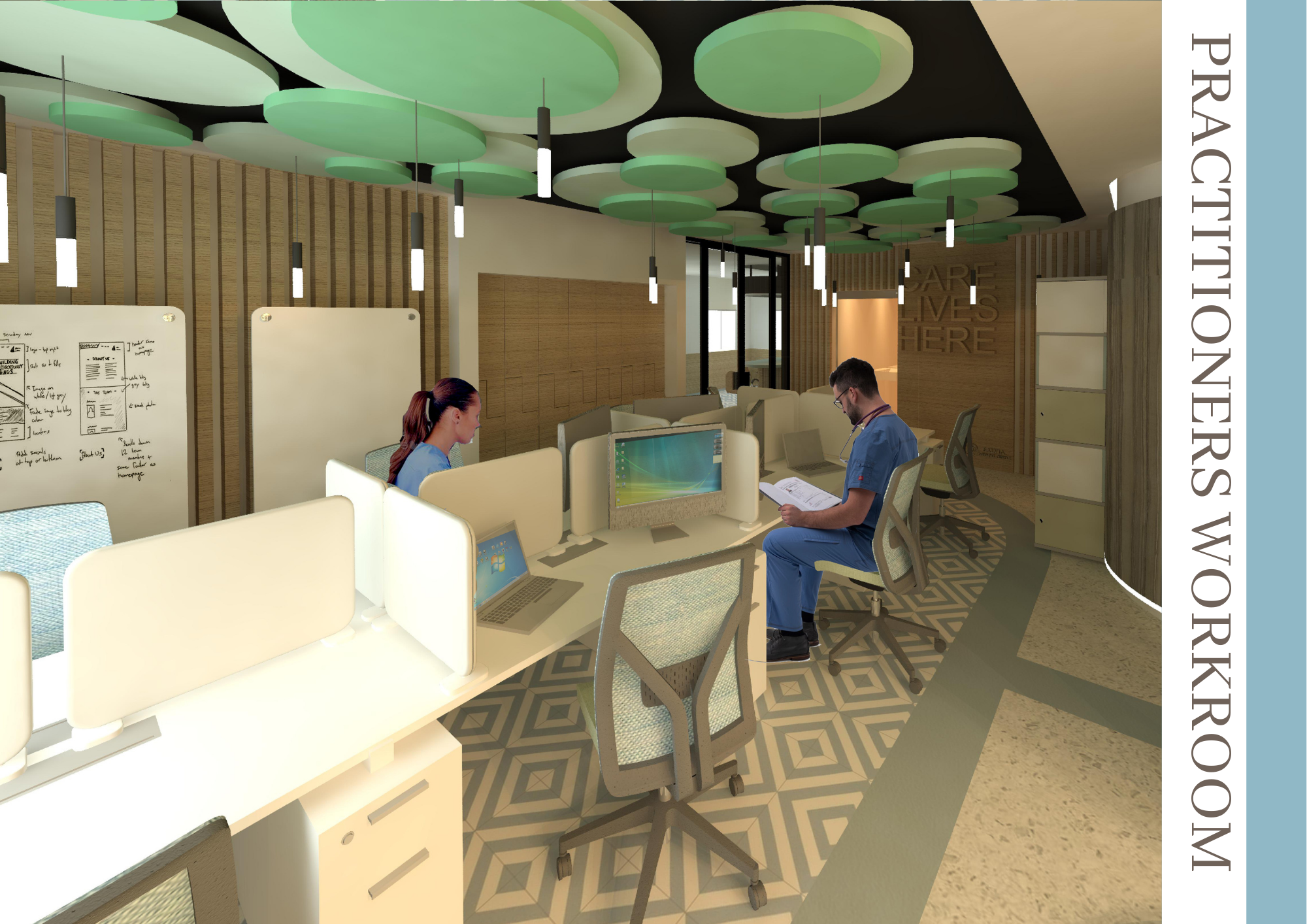 Biophilic design principles inspired the incorporation of natural elements, including colors and materials reminiscent of the salvia plant's health benefits. A soothing palette of pale greens akin to sage promotes tranquility. Earthy curves and timber slats add a natural touch. Blues accentuated wayfinding and staff areas, while patient examination rooms featured vibrant South African wallpaper, mirroring salvia's seasonal flowering hues, providing visual variety.