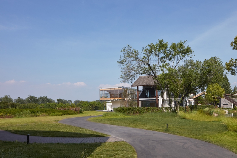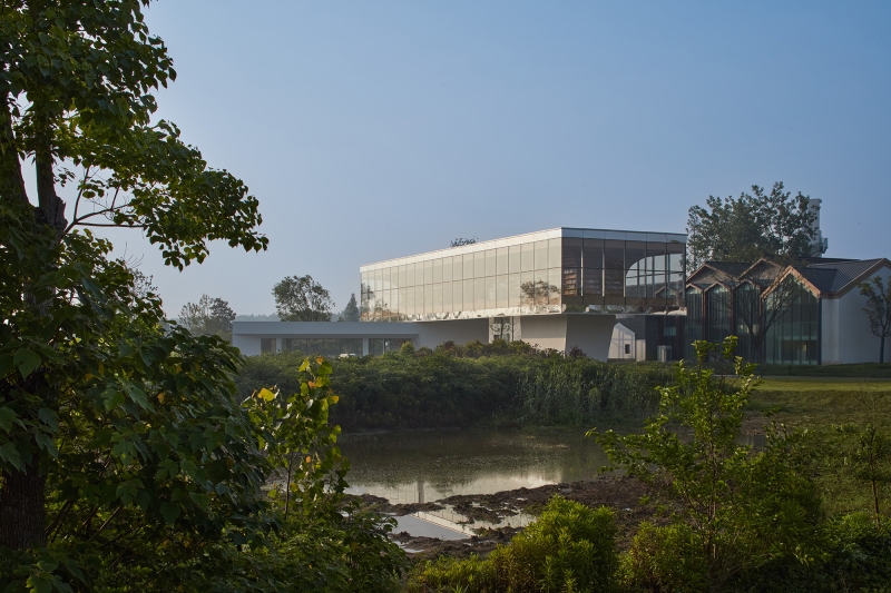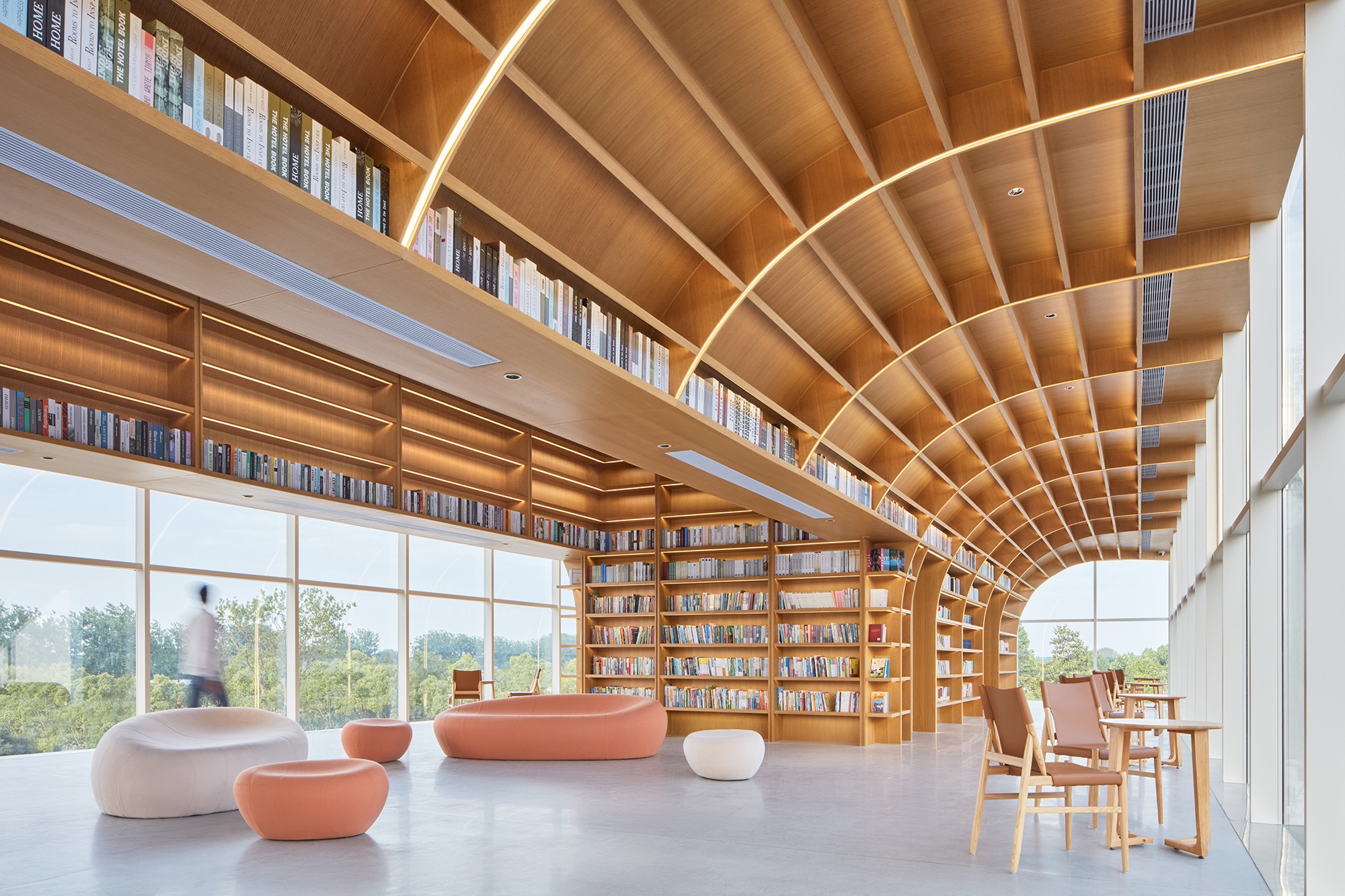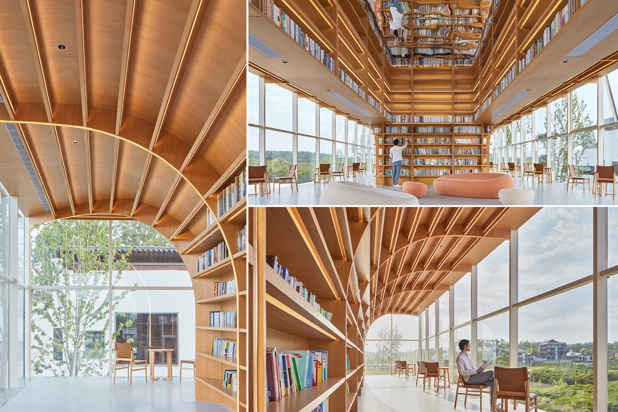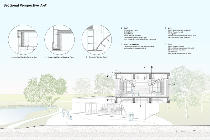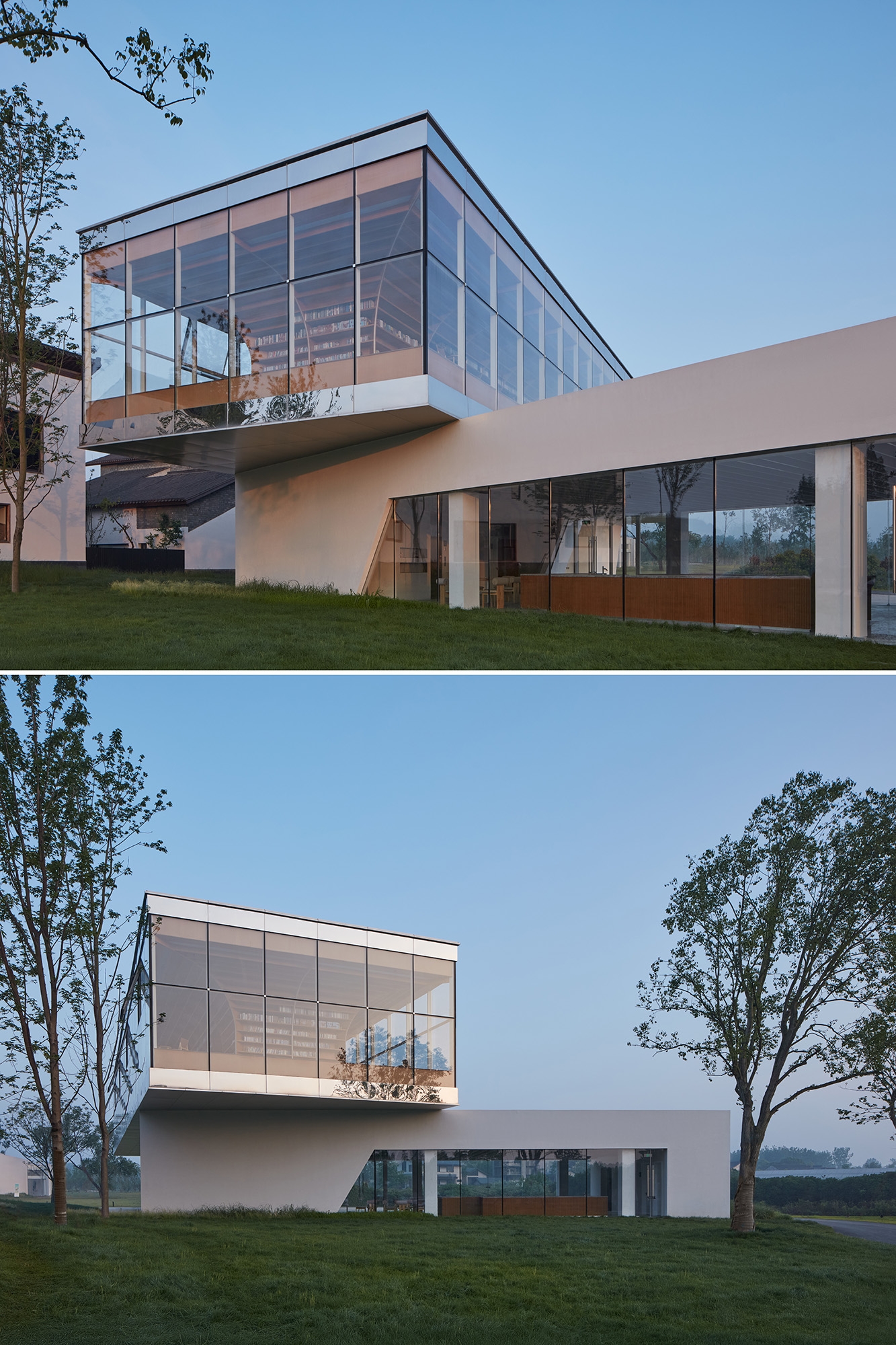 Nestled away from the bustling metropolis of Hefei, the Horizon Library stands as an idyllic retreat for readers seeking solace in nature, storytelling, and imagination amongst the prairies of Dawei Village. Situated in the southeast corner of the rural revitalization masterplan, the site replaces a former farmhouse surrounded by picturesque vistas on three sides. To open up the building towards the landscape, the library floors are stacked and splayed in a welcoming stance to embrace the prairies. Two distinct volumes — a grounded, carved monolith and a hovering, transparent prism — stand as calibrated viewing frames to capture the breadth of the land and the expanse of the sky. To minimize the structure’s footprint on the landscape, two clustered building core columns anchor the top glass volume at its heart, effectively liberating its perimeter to house the library’s centerpiece: the Reading Room. Projecting 4 meters outward on 3 sides, this column-free, panoramic veranda floats above the landscape, welcoming guests beneath its grand tree bookshelf. More than a repository of books, the space expands one’s perception of time and space toward the endless horizon of the prairies.