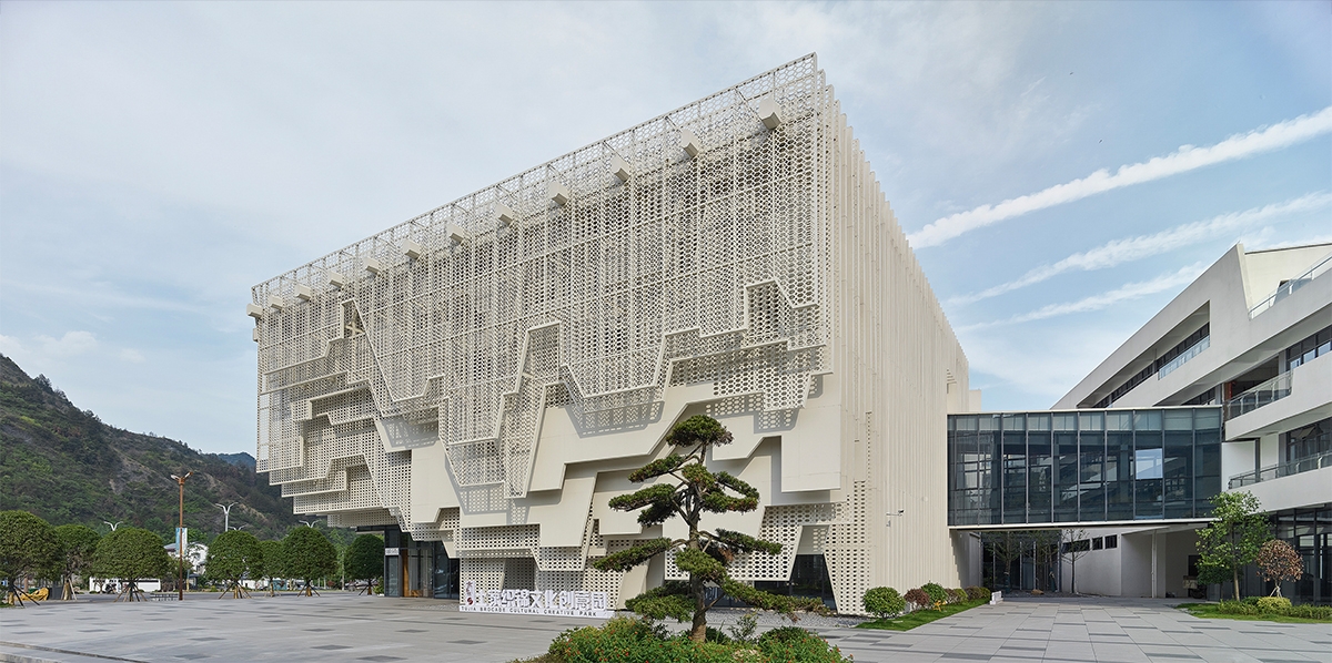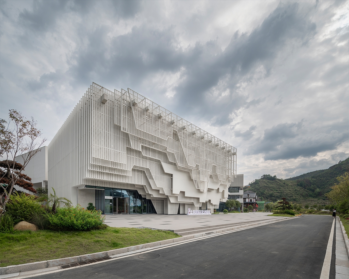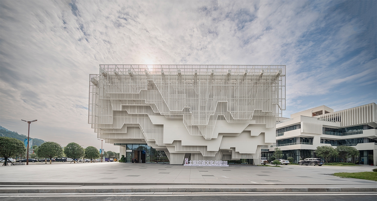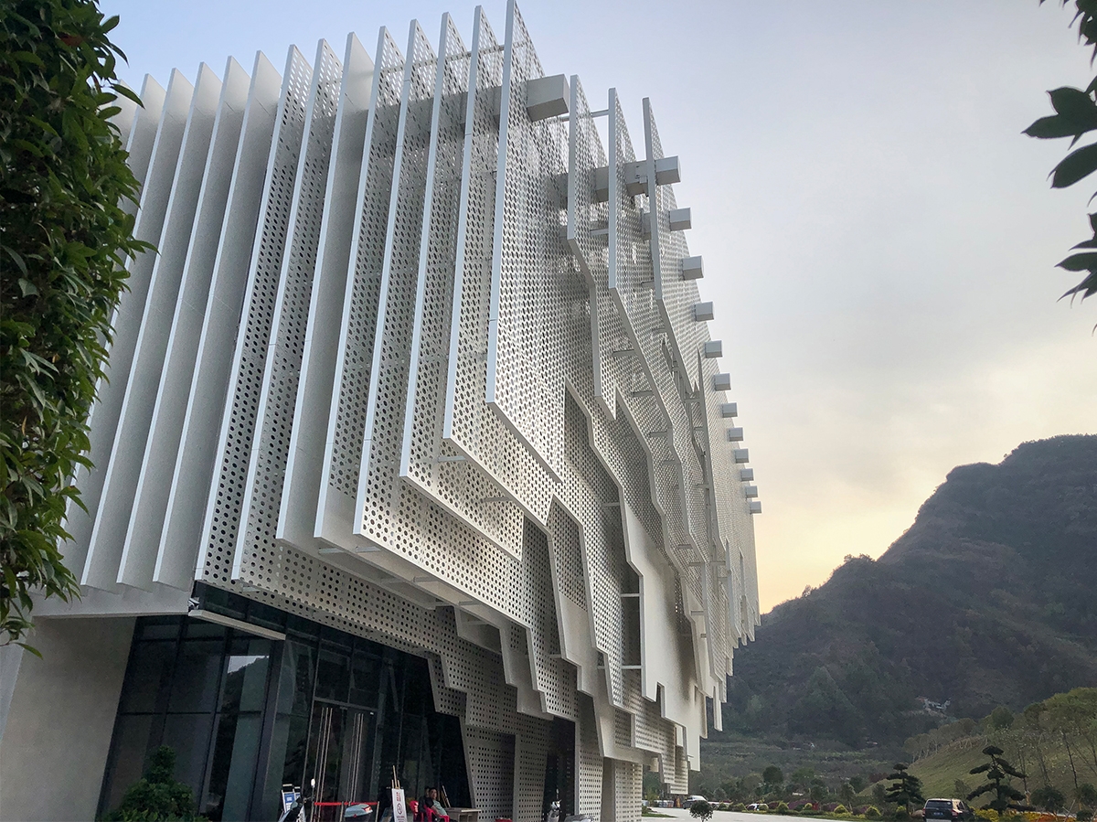 Tujia Brocade has a long and profound history. It is recognized as one of China's national intangible cultural heritages. The landscape of Zhangjiajie is characterized by towering peaks and overlapping mountains. The design incorporates the concept of reversing yin and yang, with the solid sky hanging above and the boundary between sky and earth formed by layered mountain ranges, creating a virtual skyline of mountain shadows. The solid and continuous mountain peaks are transformed into the virtual, simultaneously suggesting and guiding people to explore the hidden beauty within the "mountain." This design incorporates the self-similarity concept of fractal geometry and utilizes the principles of projective geometry to project the geometric patterns of the previous facade onto adjacent planes, creating a decreasing hierarchy. Starting from the facade's first layer, where the void is greater than the solid, it iteratively evolves into a solid two-dimensional plane. By applying fractal thinking, the overall perception of this facade can be seen from a different perspective as a volumetric two-dimensional spatial form.