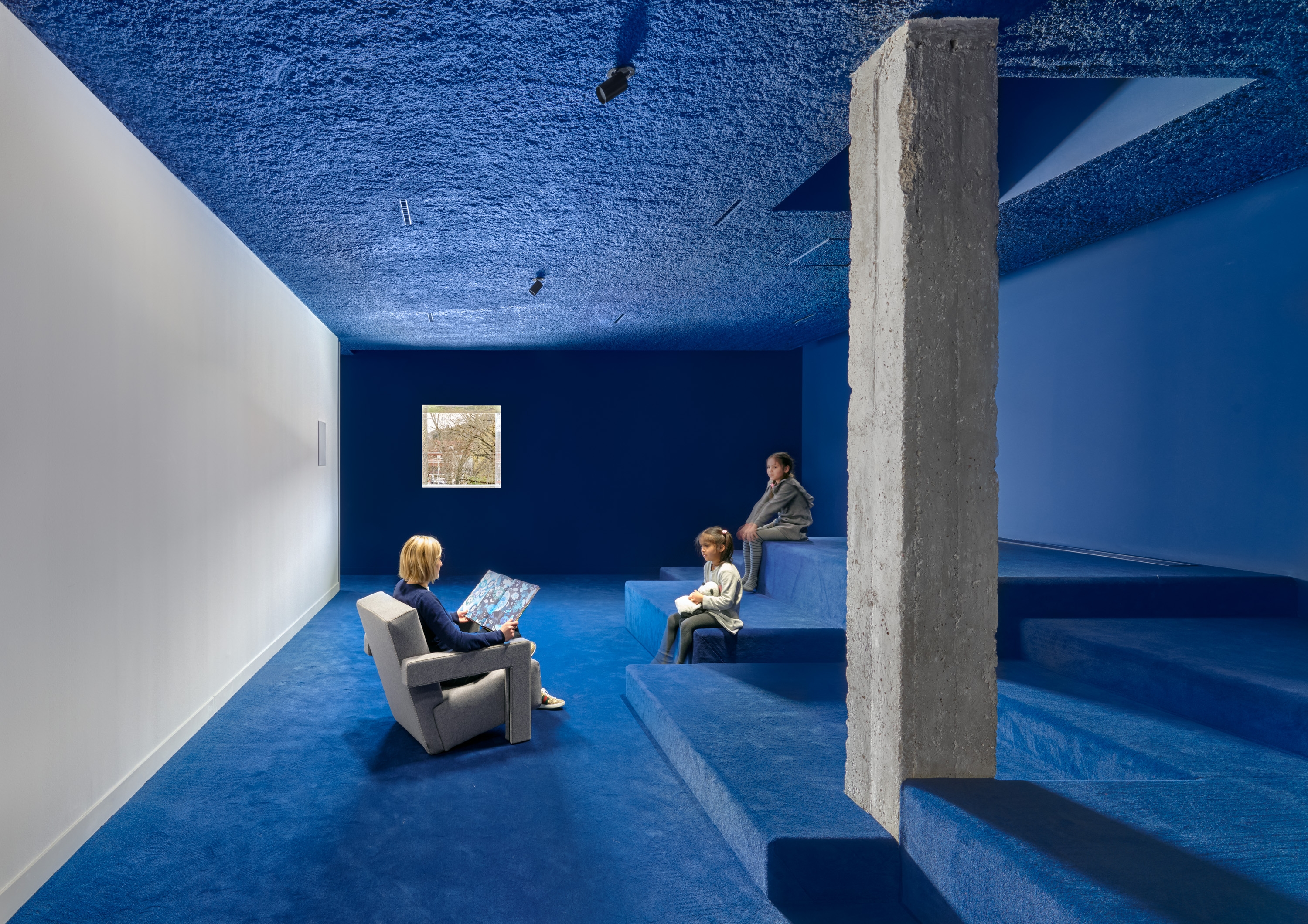 We chose to do this because ‘La Boussole’, a new centre for culture and tourism, is not only a hub for learning and leisure: it can also lay claim to the status of a ‘third place’. Indeed, its new structure and events schedule encourage encounters, both between individuals and groups. We decided that the new exhibition room would close the elevation on the street Rue Jean-Jacques Baligan and that a glass roof, tinted with red and yellow, would crown the former courtyard. Like an openwork tealight holder, this concrete structure casts natural light in geometric shapes of flat tints.