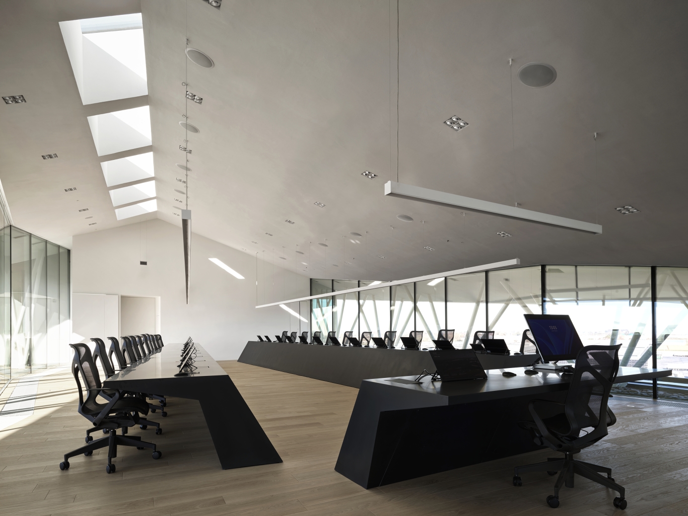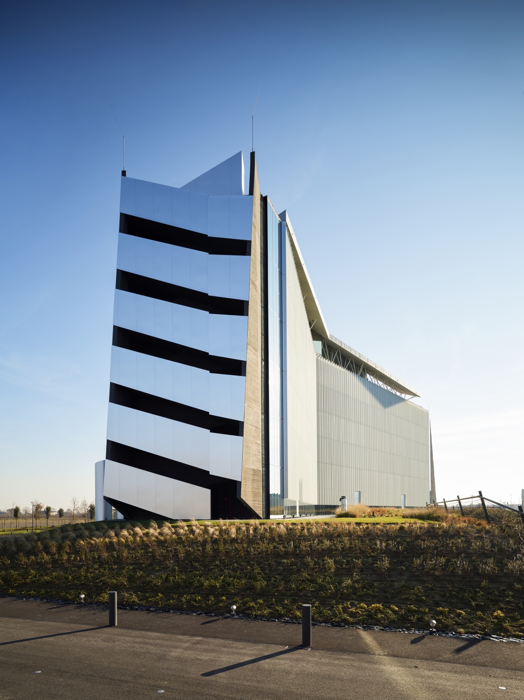 The building's exterior, a blend of aluminium, concrete, and glass, reflects the changing light, creating a dynamic visual effect. Its pitched roof and skylights, which was interpreted as a kind of fifth elevation, engage in dialogue with the Apennine skyline.