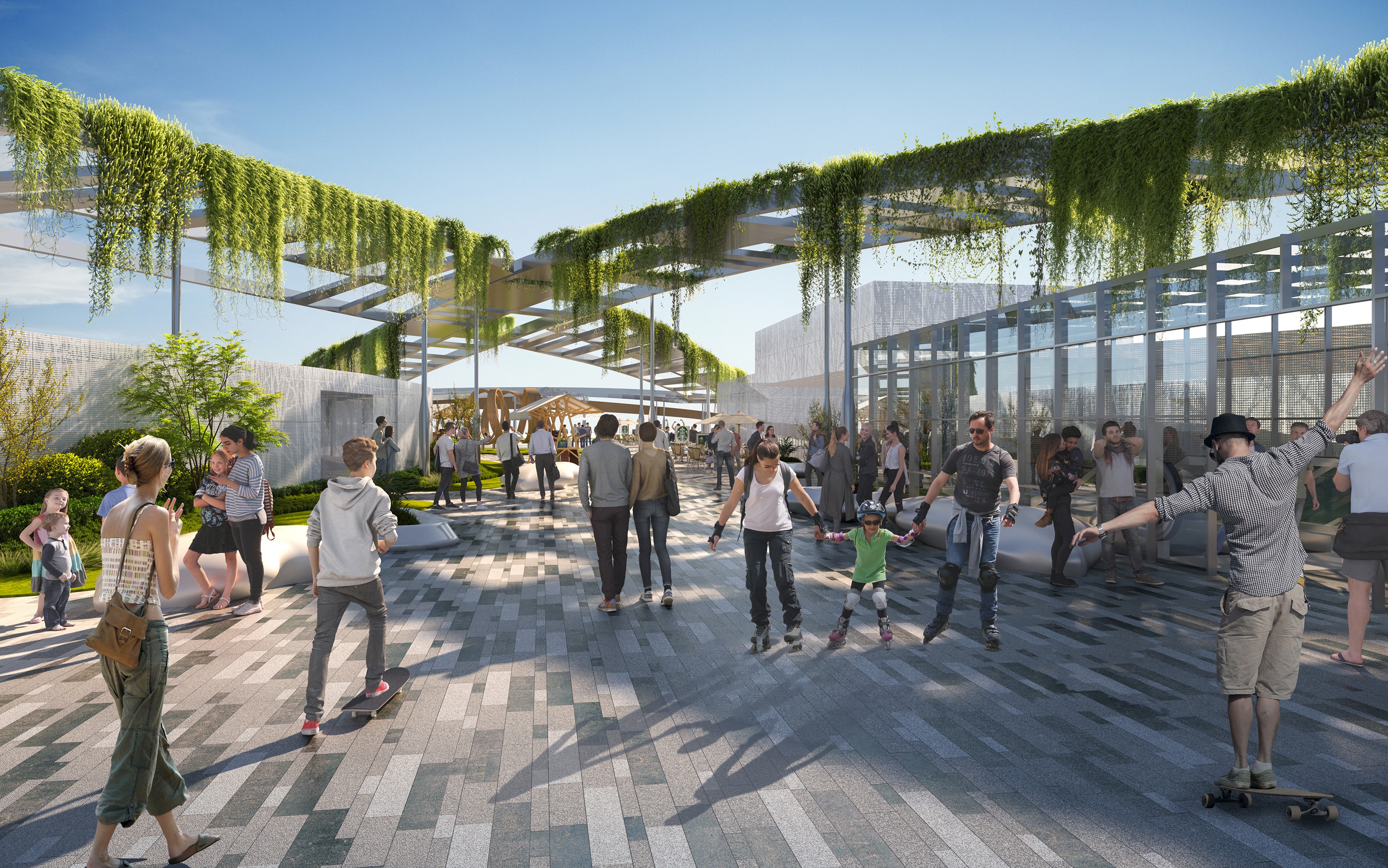 The rooftop of the Möbius strip is adorned with greenery that harmoniously complements the western park. It can accommodate various activities and serve as a venue for large-scale art installations, open to the public for enjoyment.