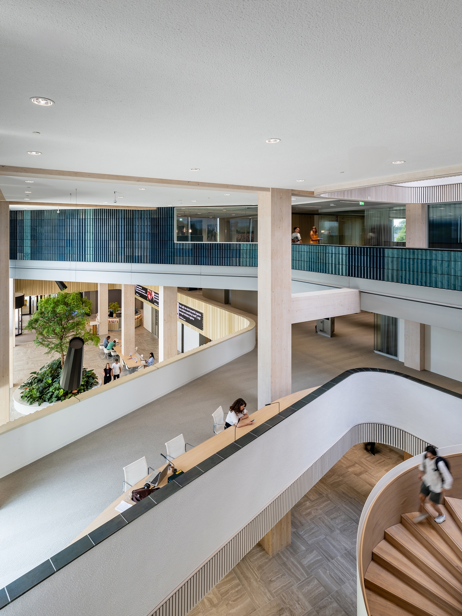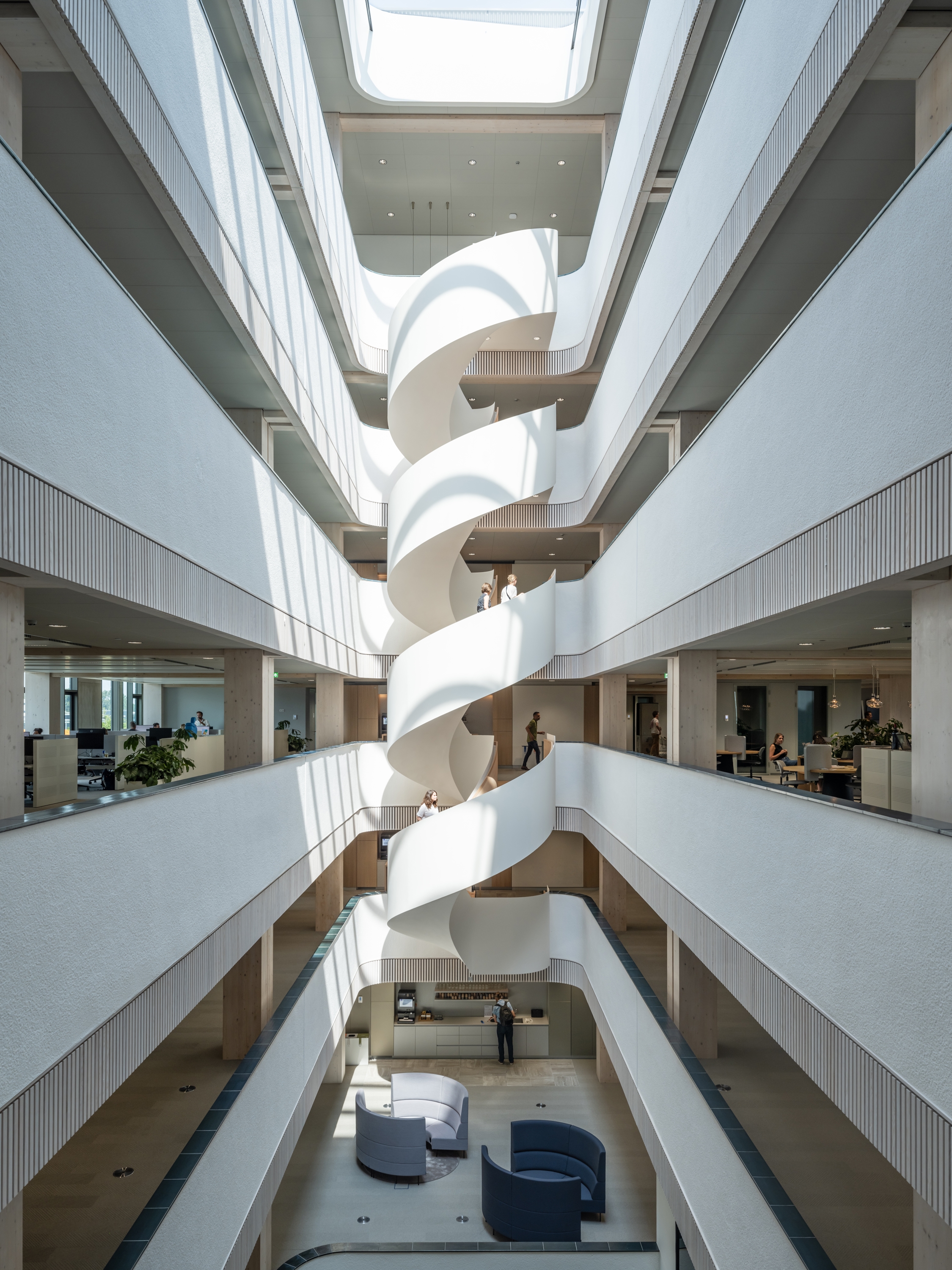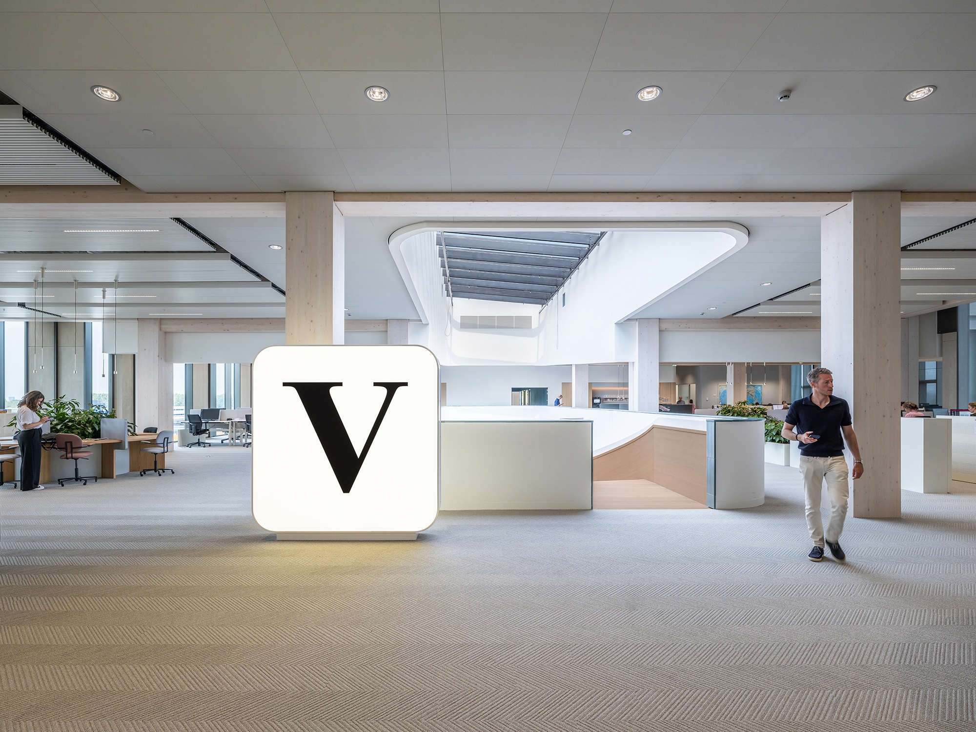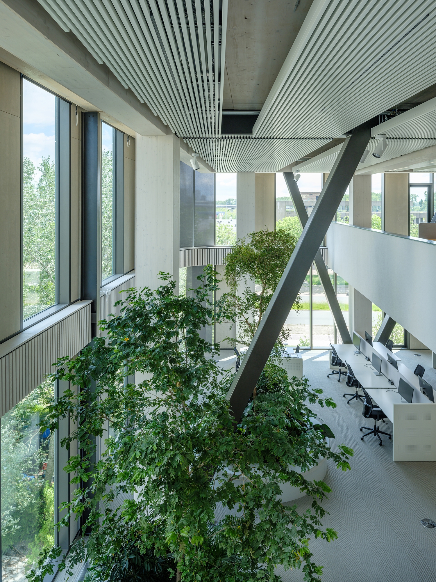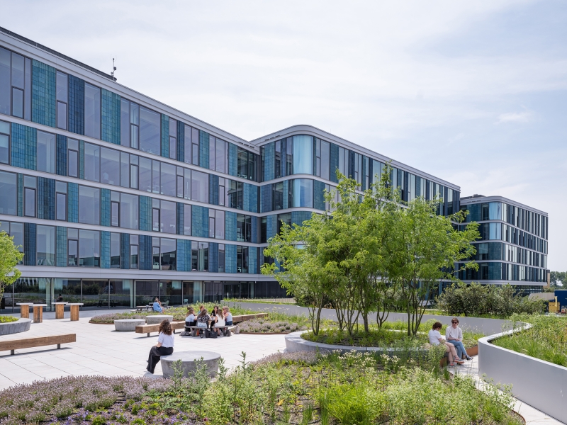 The building design focuses strongly on a sustainable, healthy working environment with ample daylight, multiple green areas throughout the building and sufficient space for both creative interaction and focused work. The largest part of the construction, including the columns and ceilings, is composed of glulam timber.